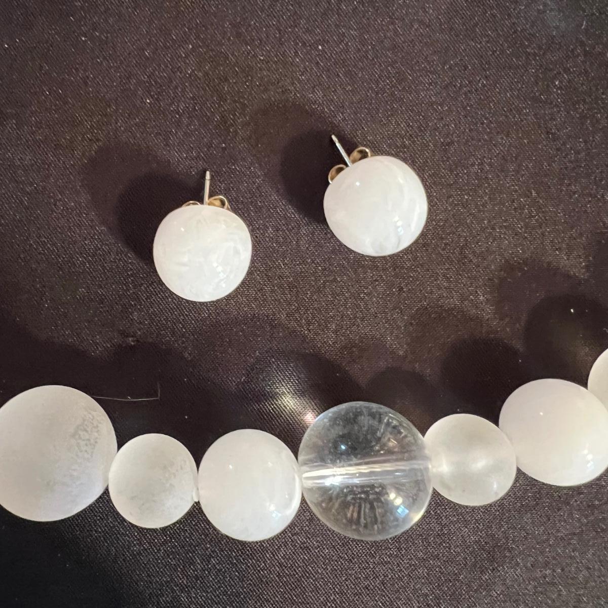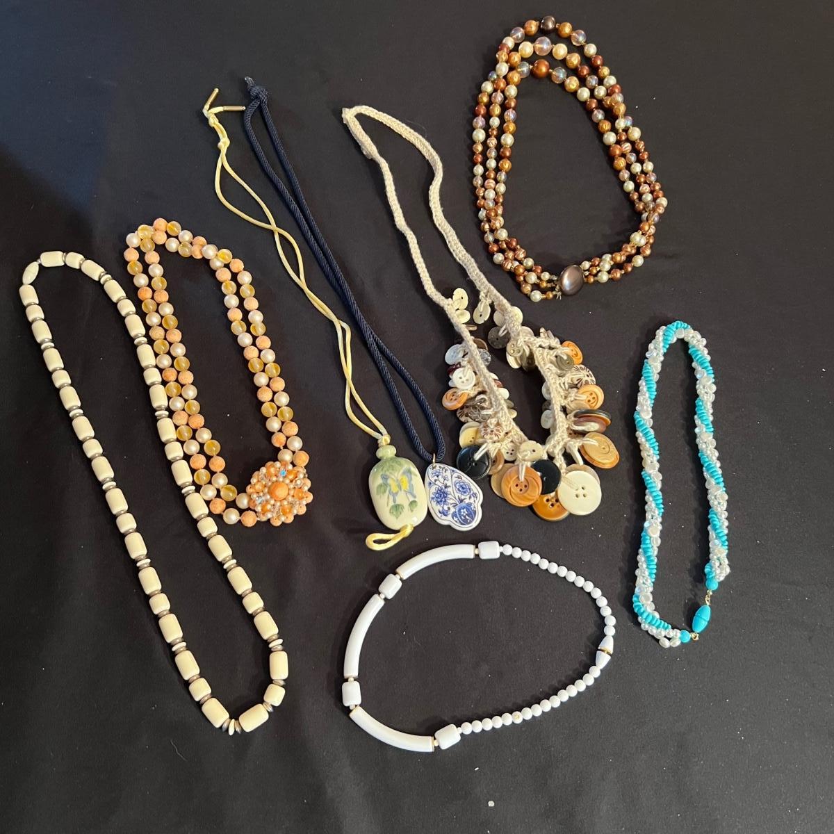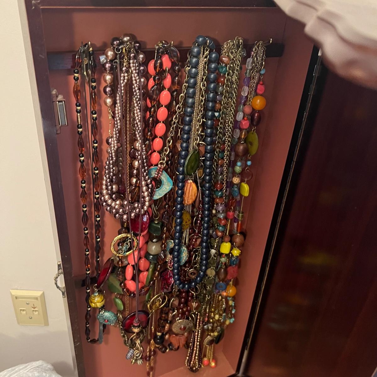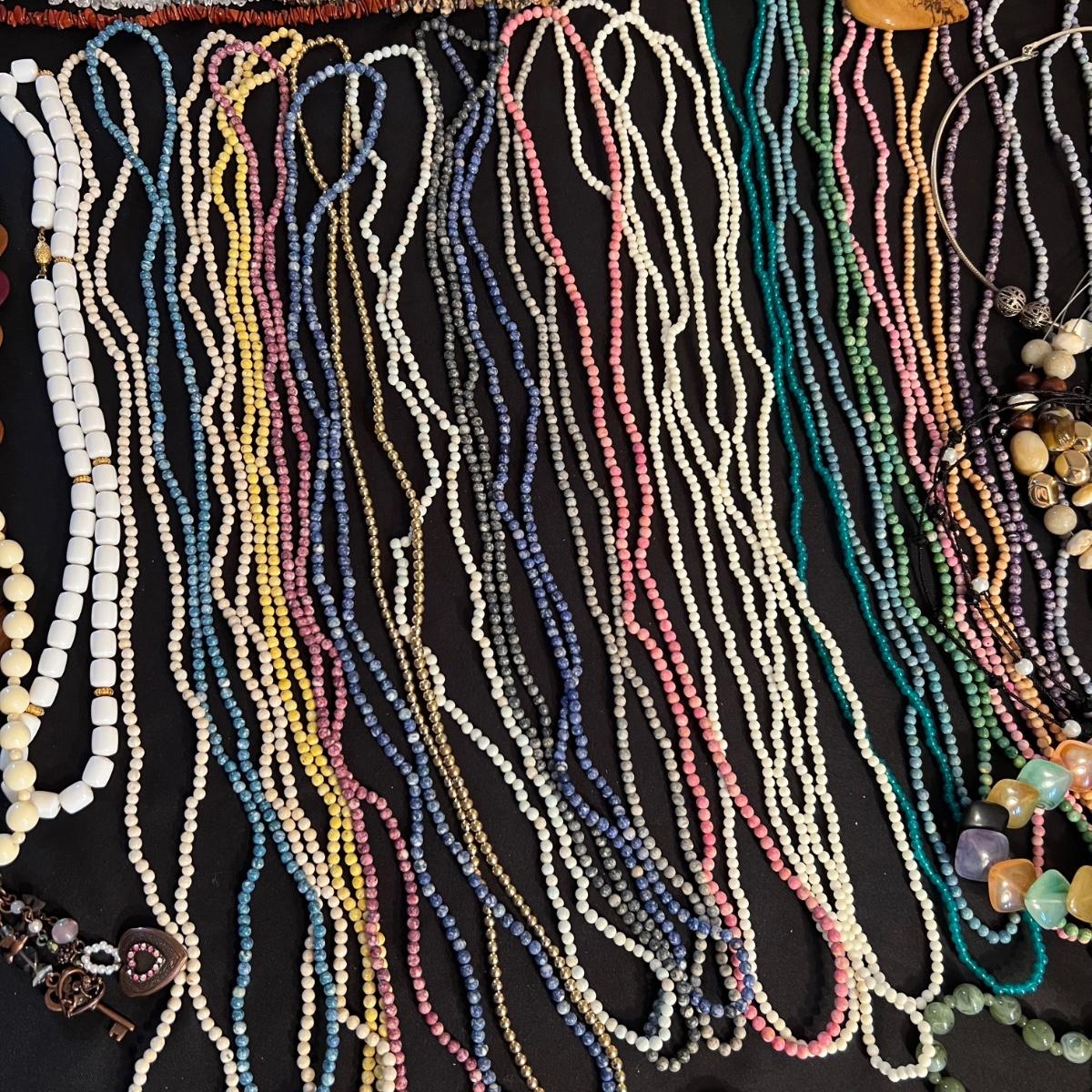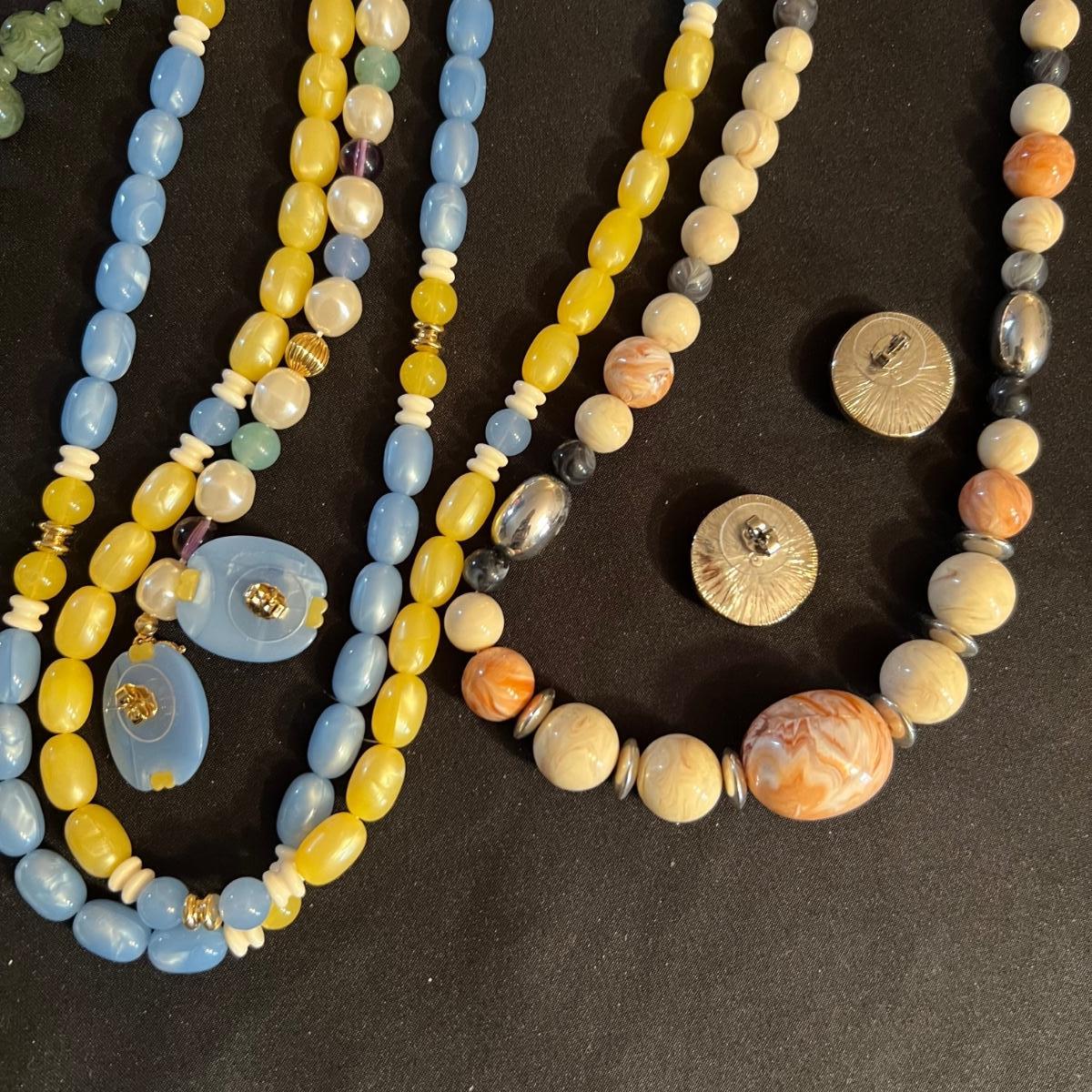 This huge lot includes in excess of 100 necklaces and 15 bracelets plus over 10 jewelry sets that include either earrings (both clip-on and posts for pierced ears) or bracelets. See images for full inventory. All items appear to be a mix of mostly plastic beads and faux stone with all lengths included from choker to very long; one of the longest chains is pictured with tape measure.