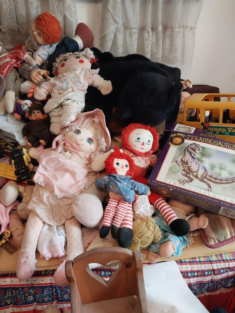 HUGE ASSORTMENT OF CABBAGE PATCH KIDS, BUSHNELL TELESCOPE, BASEBALL MITTS/BALLS, PLUSH ANIMALS AND MORE