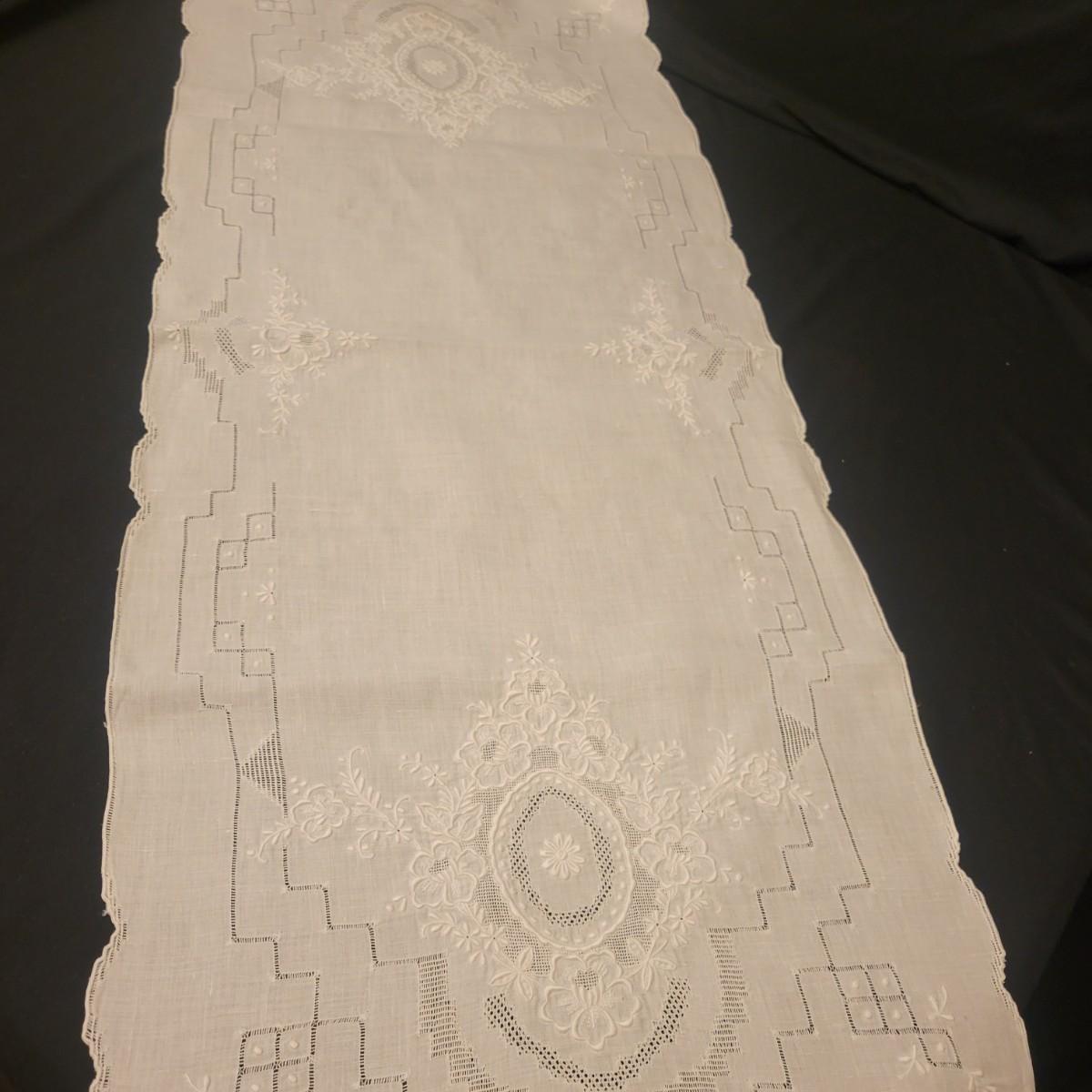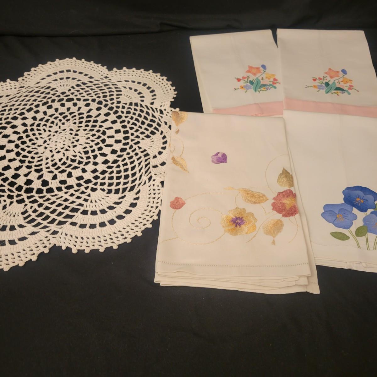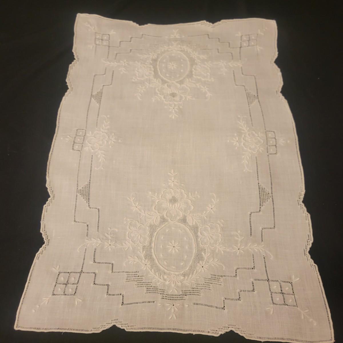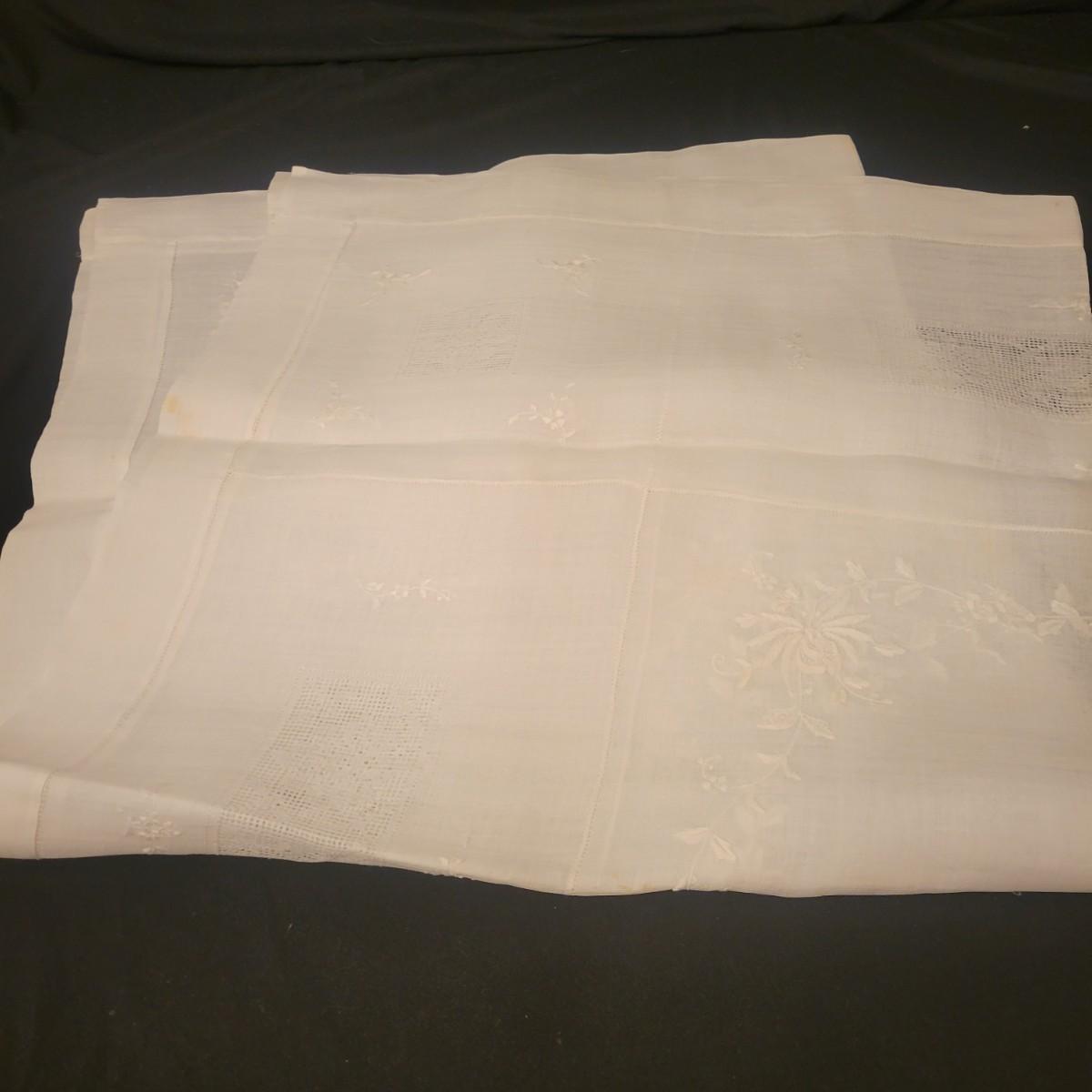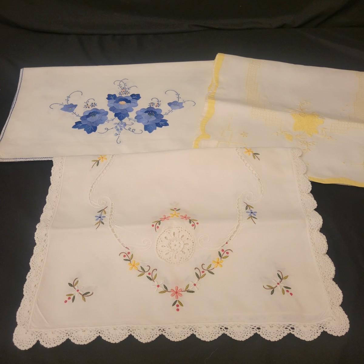 A very large assortment of high quality cotton linens in good shape. There is some staining on various pieces as they have been used, but all items have been stored well, washed and starched. Included are place mats, table runners, decorative doilies, pillow cases, handkerchiefs and so much more. See attached pictures for full inventory. Runners average 18" x 50". Many pieces are embroidered and have lace edges. Shipping available. Shipping can be costly please call UPS store at 828-252-6930 for quote.