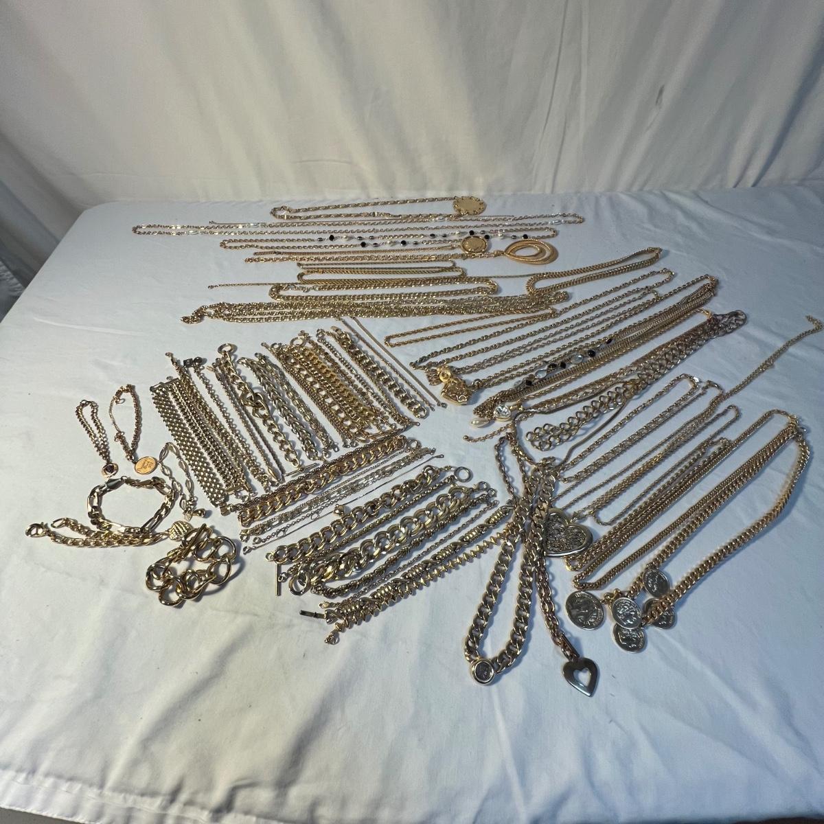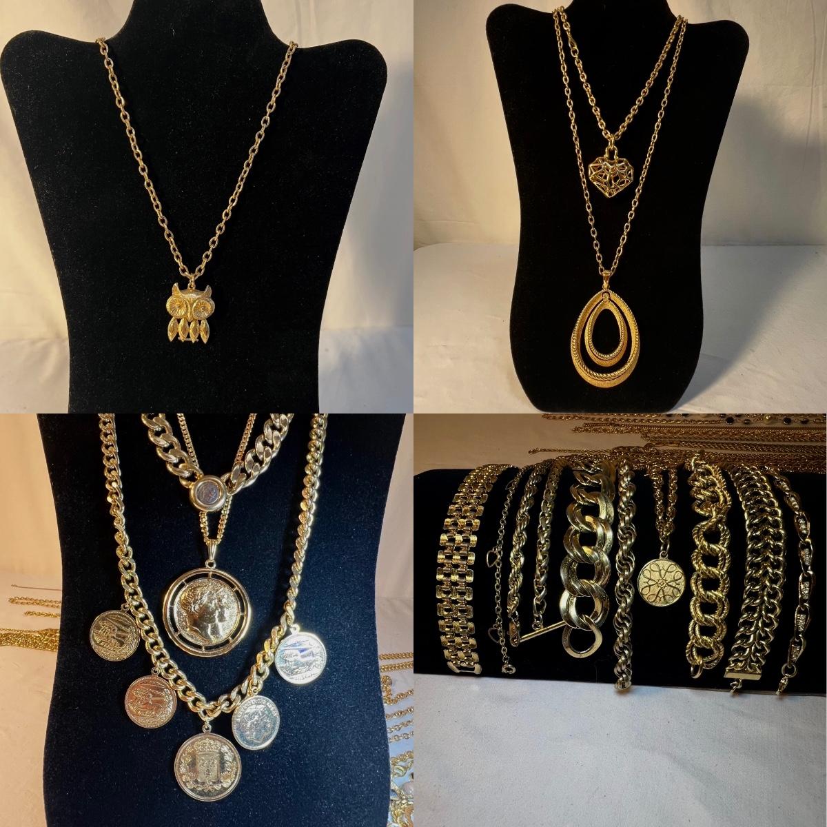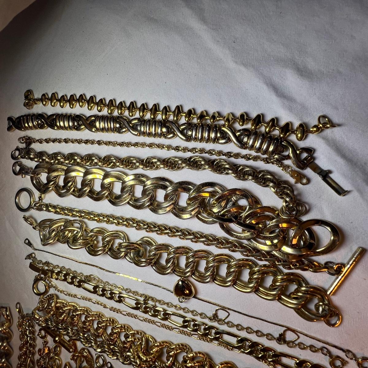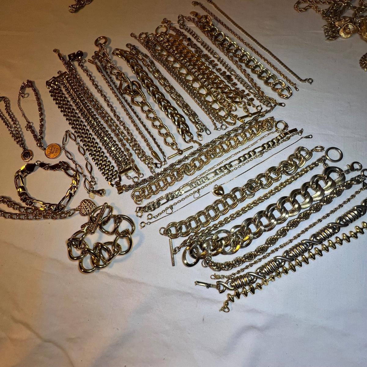 Approximately 40 bracelets and 68 necklaces, all gold toned fashion pieces. Some have simulated diamonds. Necklaces range in length from 16” to 52” long. See images for full inventory. All sales are final, no refunds so please bid accordingly.