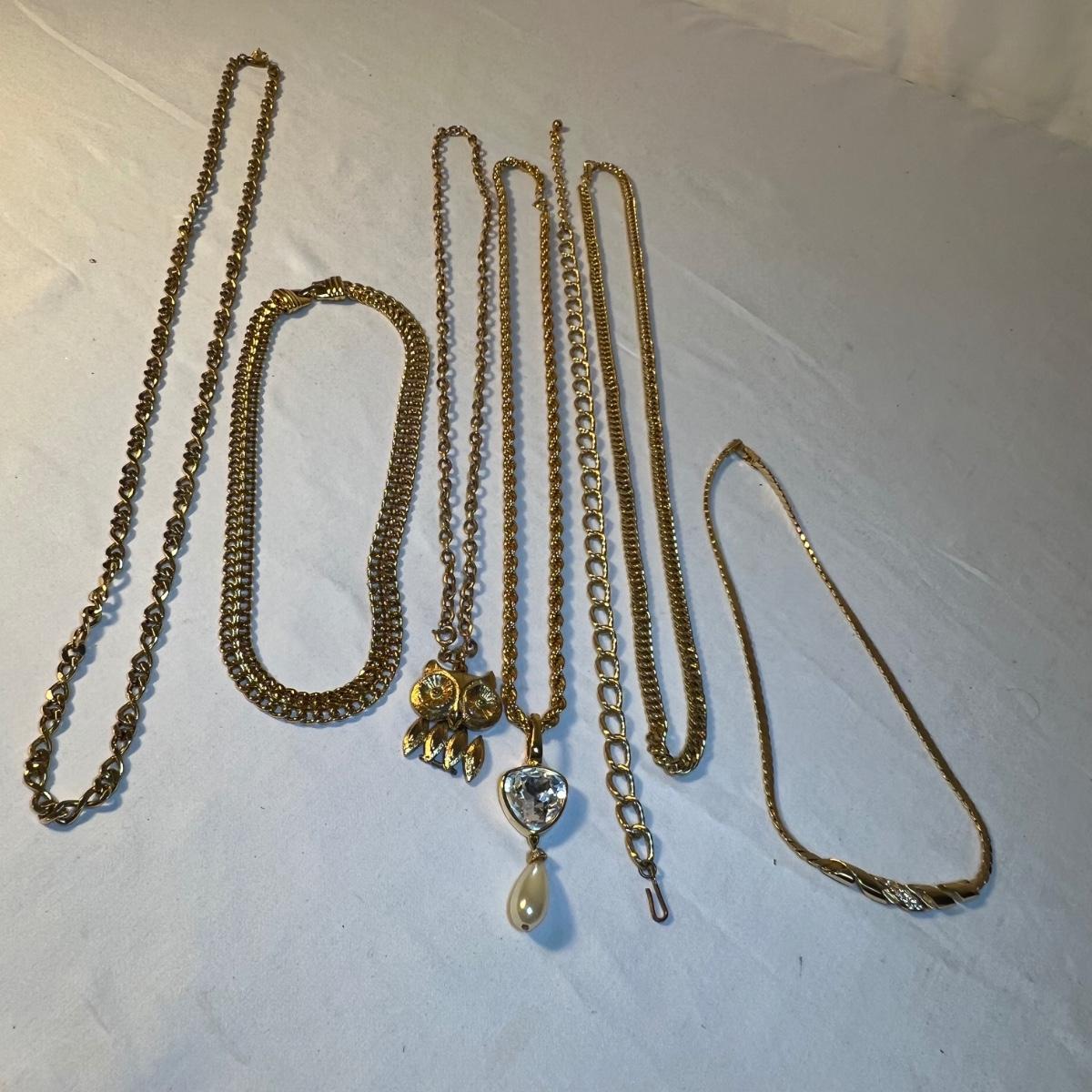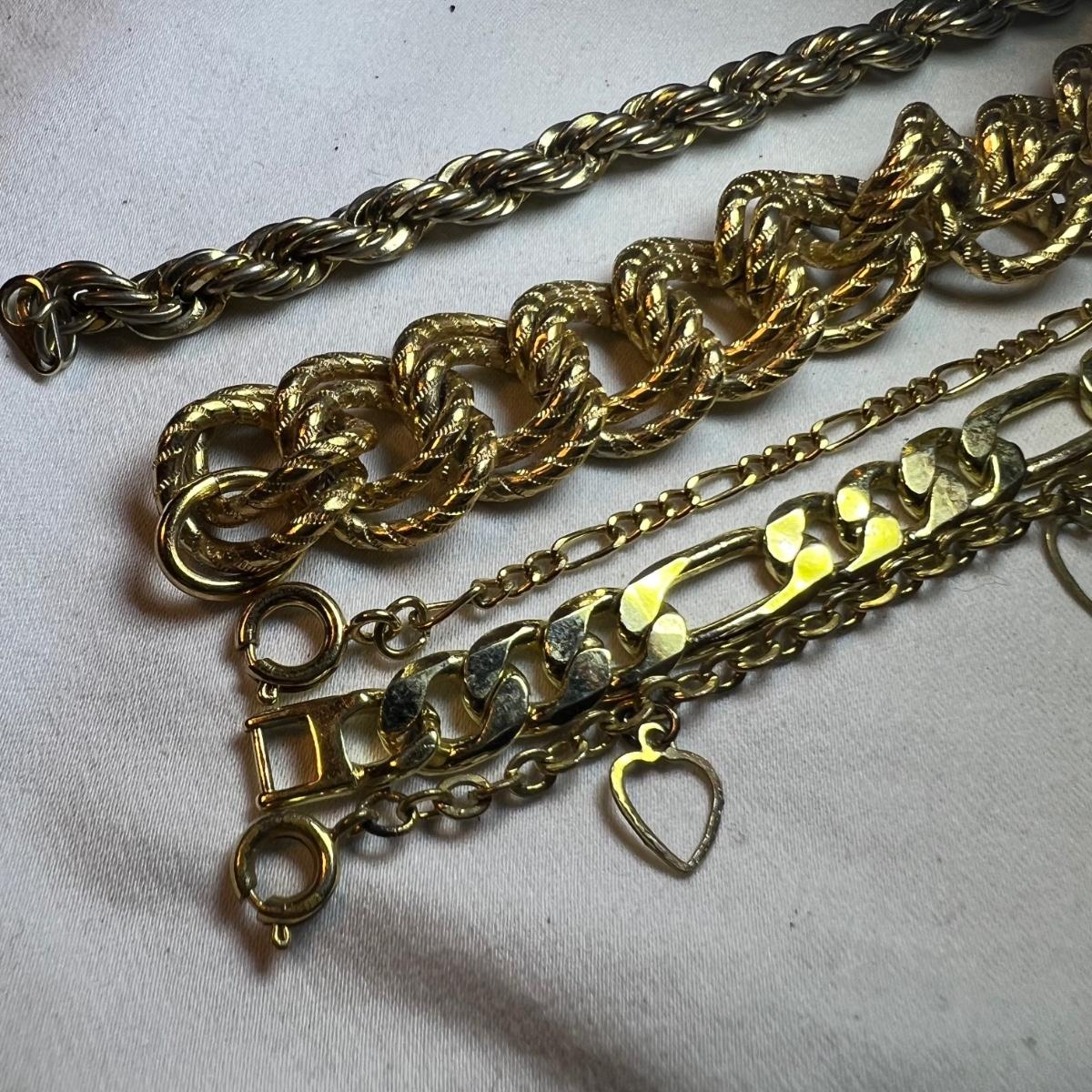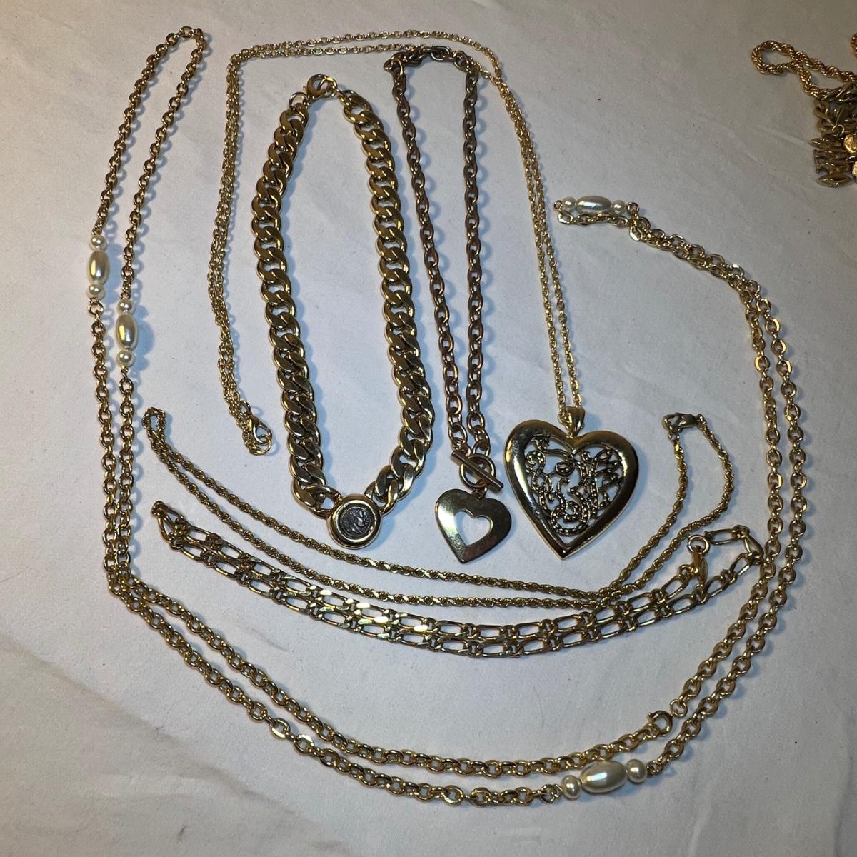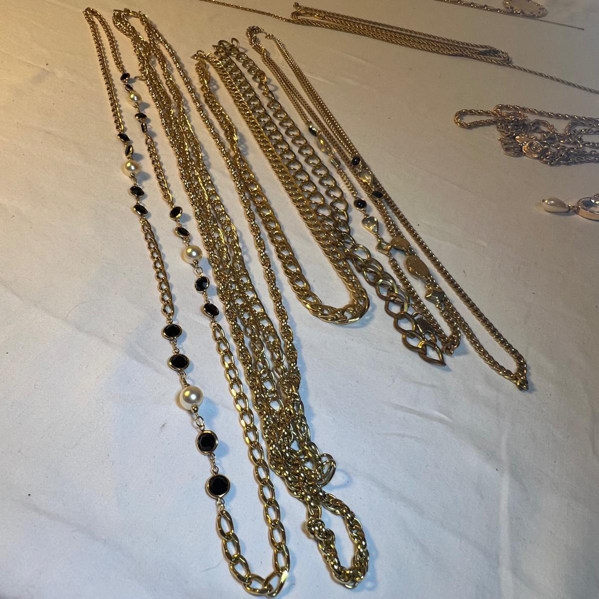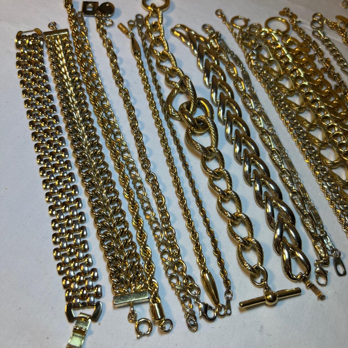 Approximately 40 bracelets and 68 necklaces, all gold toned fashion pieces. Some have simulated diamonds. Necklaces range in length from 16” to 52” long. See images for full inventory. All sales are final, no refunds so please bid accordingly.