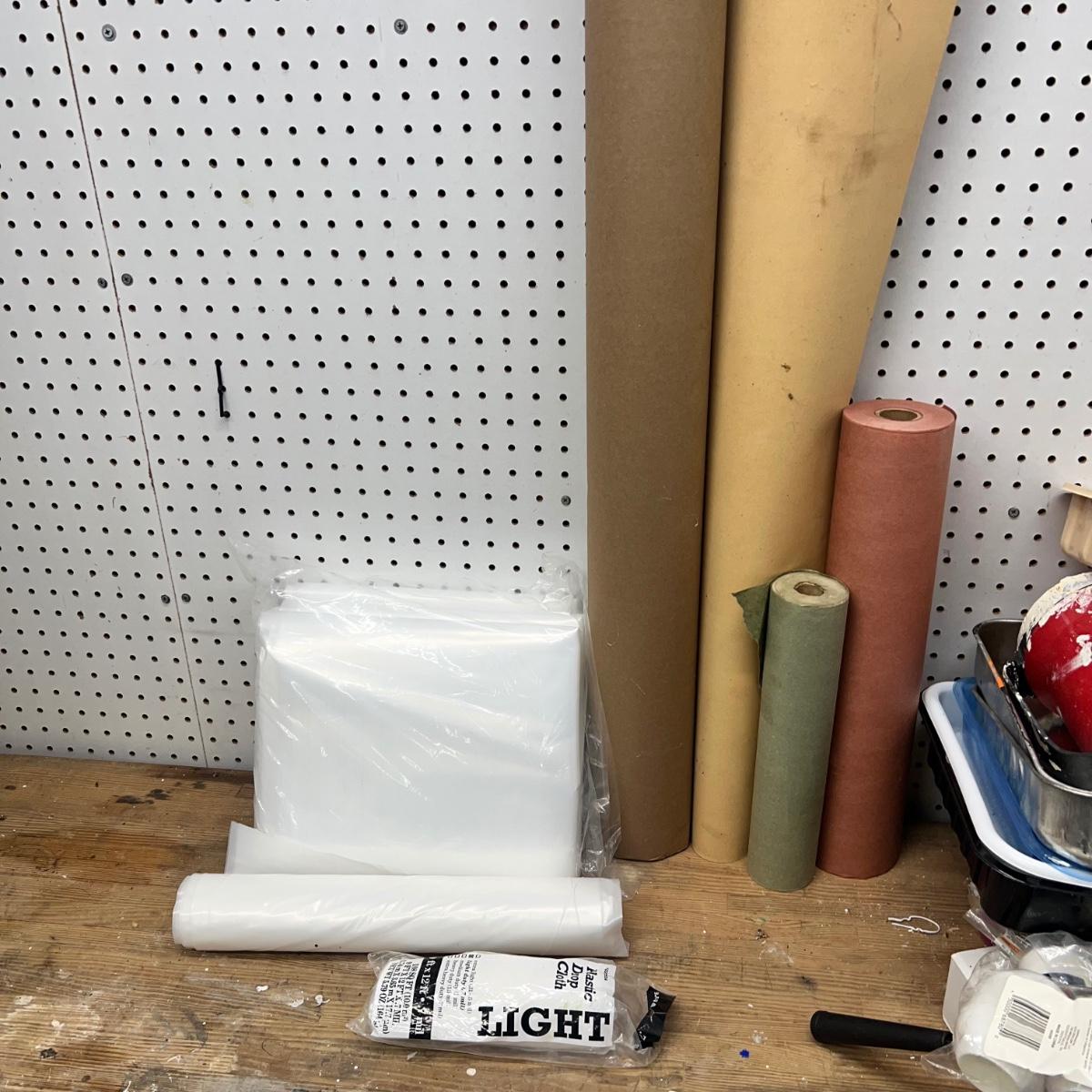 This is a great lot of supplies for painting, drywall and lots more. See images for full inventory. The black plastic mixing tub measures 21” x 26” x 6”H. Last photo shows everything included and boxed up.