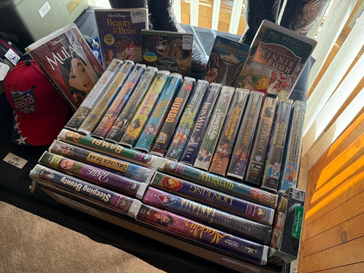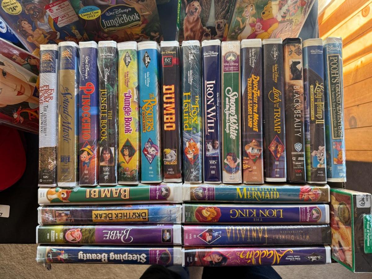 lots of Disney VHS movies in this lot like Aladdin, Fantasia, Lion King, Beauty and the Beast, Dumbo, Iron Will, Snow White, Babe, Sleeping Beauty, Winnie the Pooh, Jungle Book, Pinocchio, Mulan, Black Beauty, Little Mermaid, Brother Bear, Bambi and so many others.
