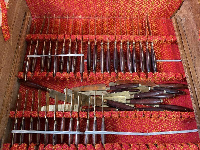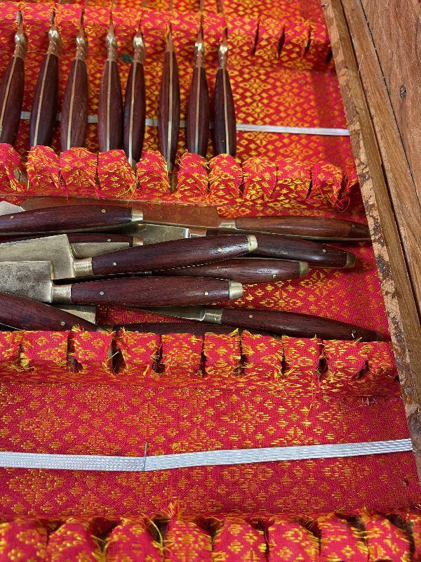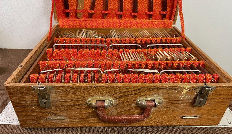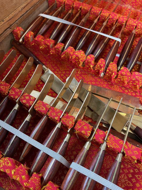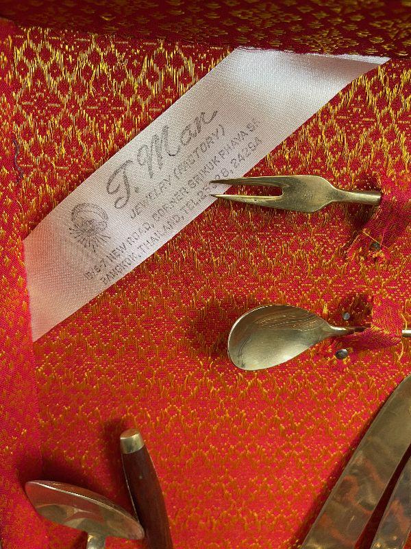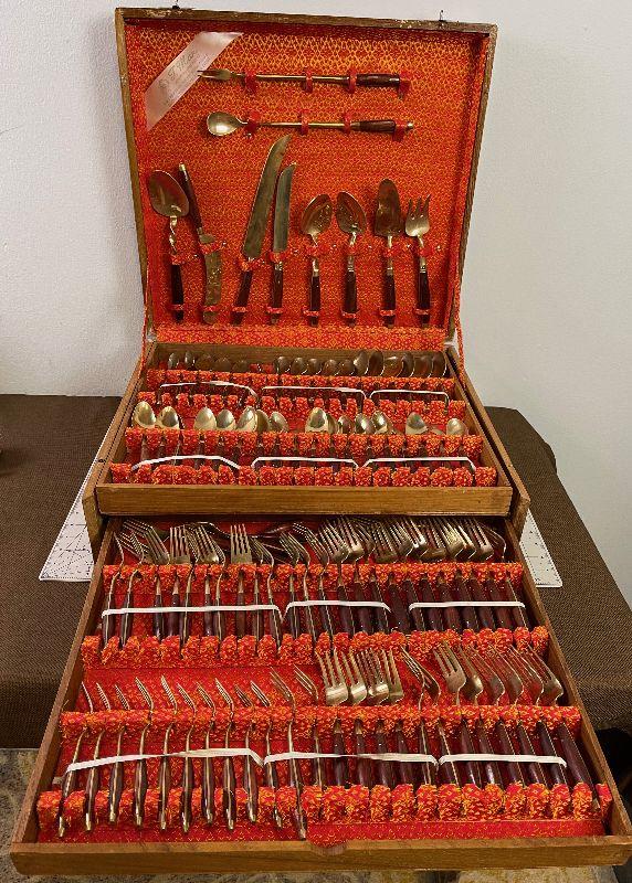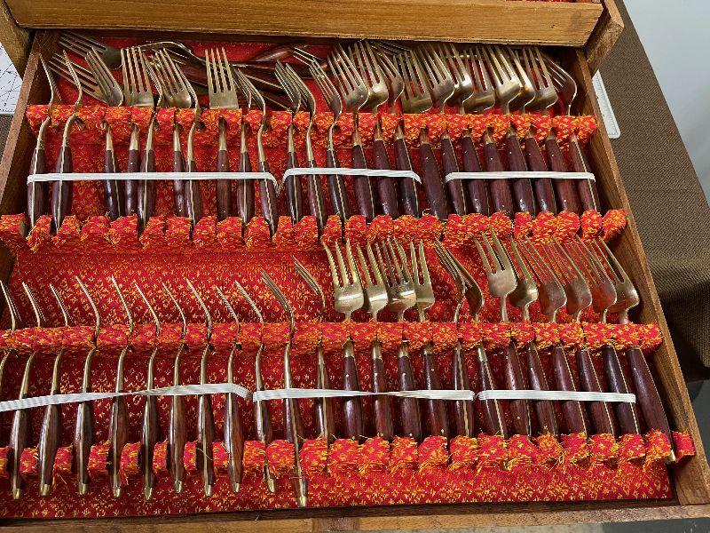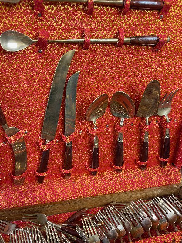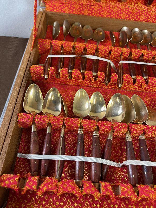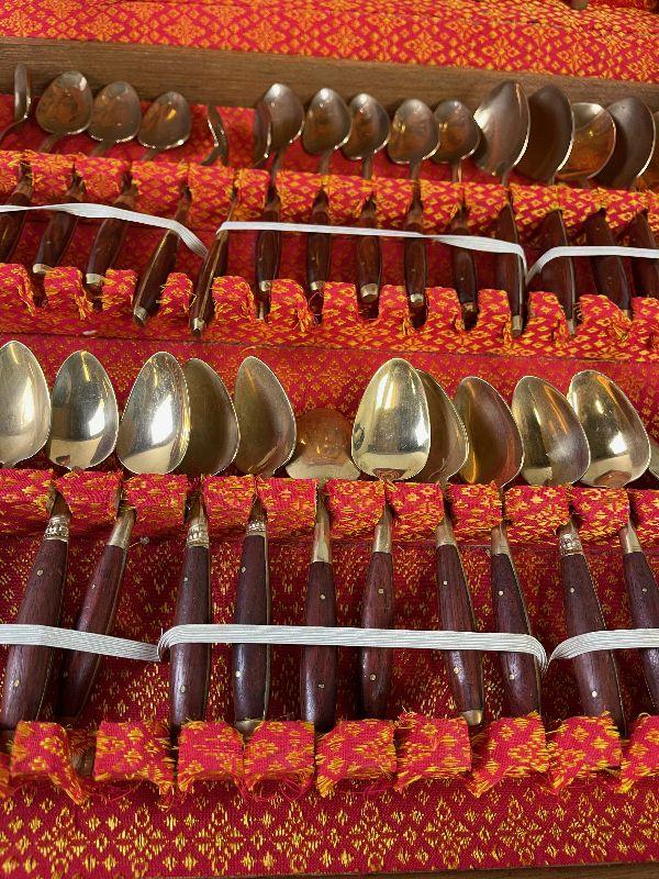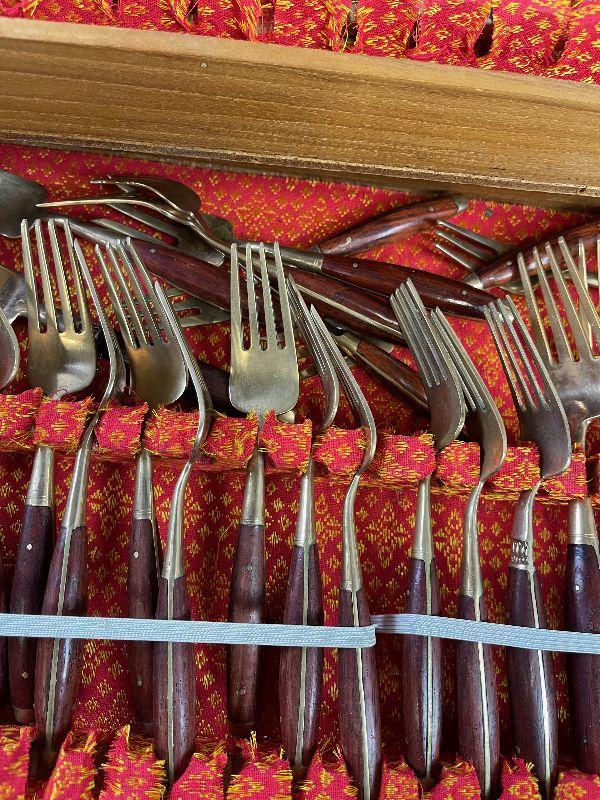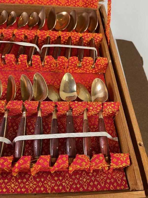 Huge Brass & Teak-wood Flatware Set with teak storage box included. From the estate of an Air Force Officer, acquired on a tour of duty in the 1970's to SE Asia, hand made in Thailand. I will ship this item but be aware it is very heavy 25 plus pounds so it will be expensive to ship especially to the east coast.