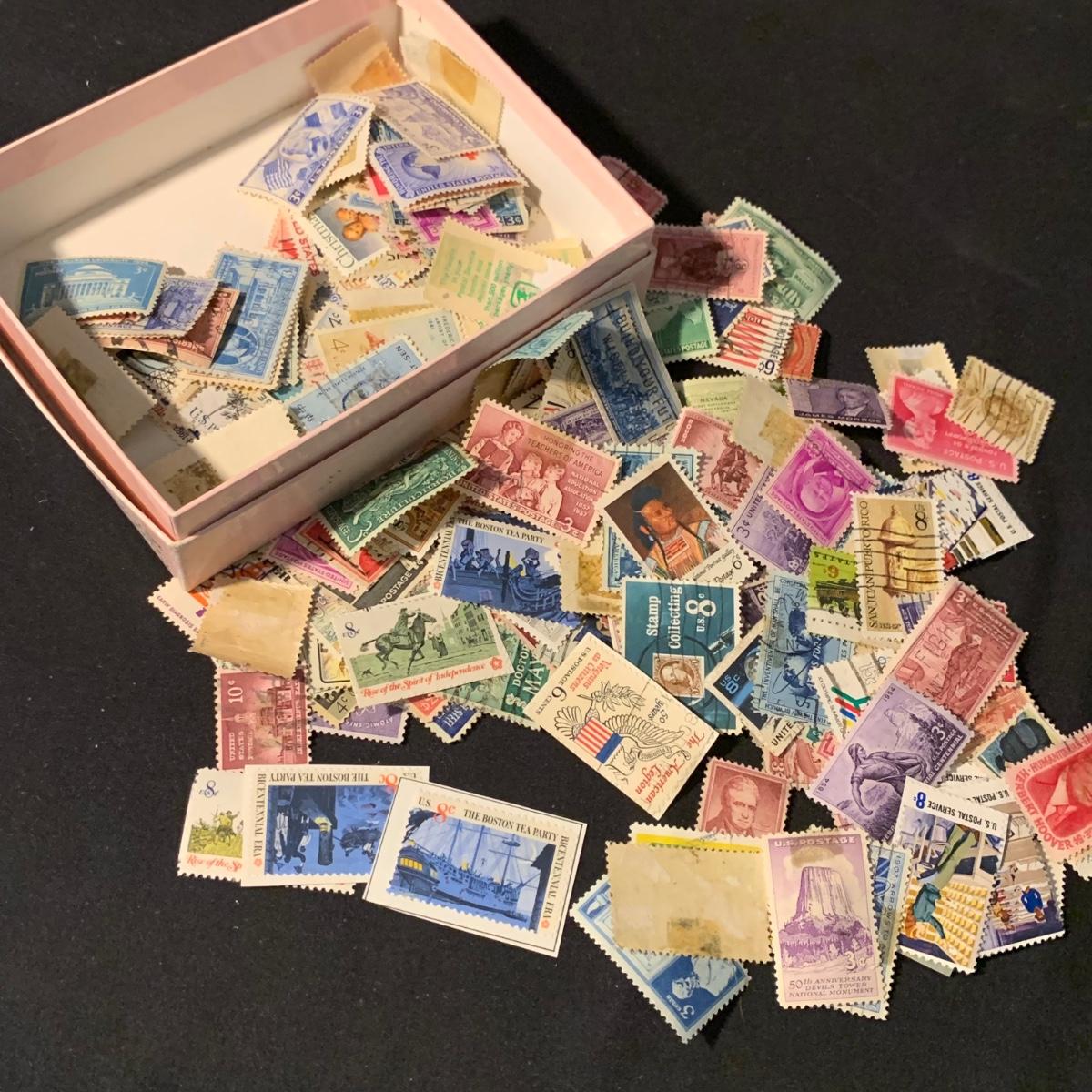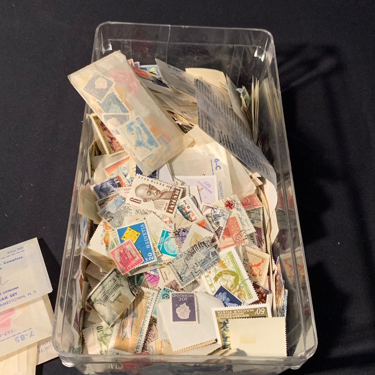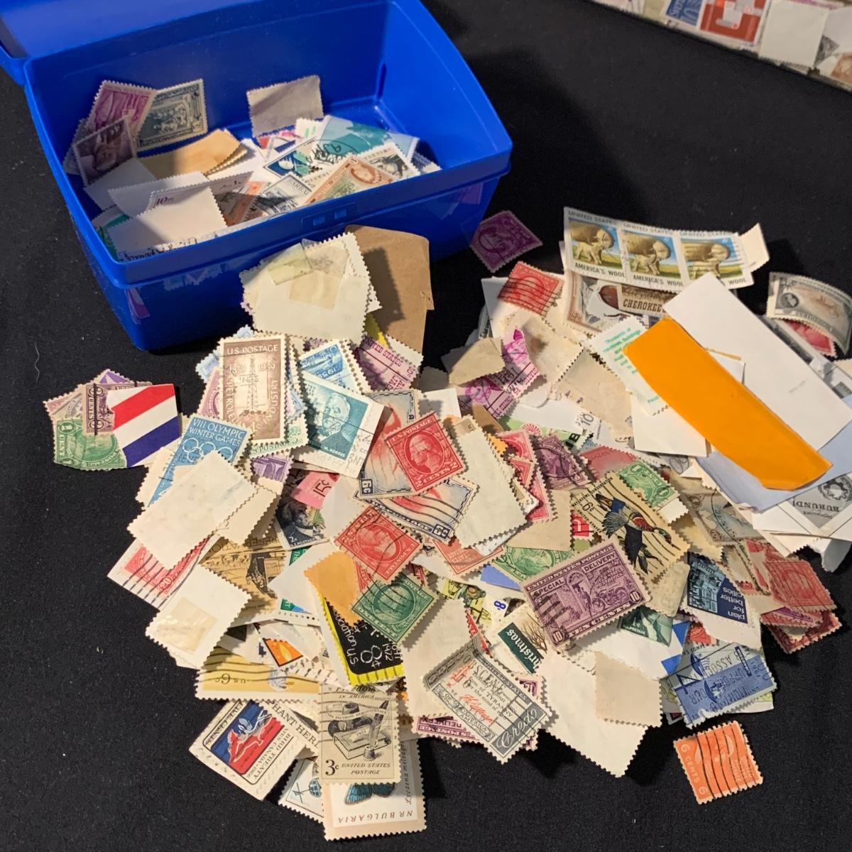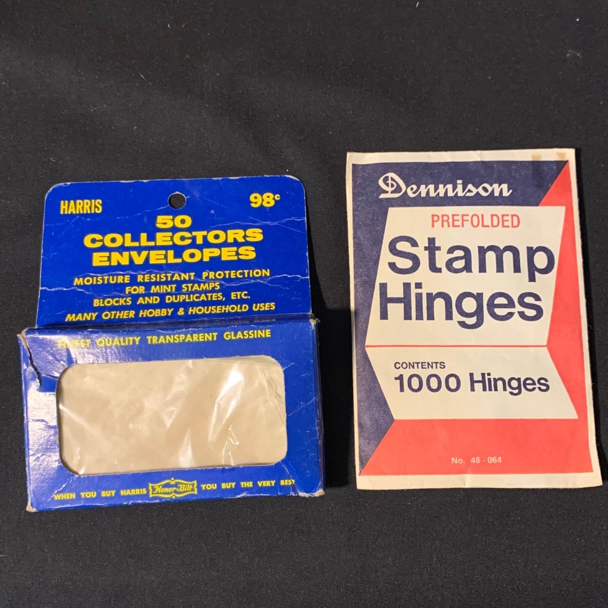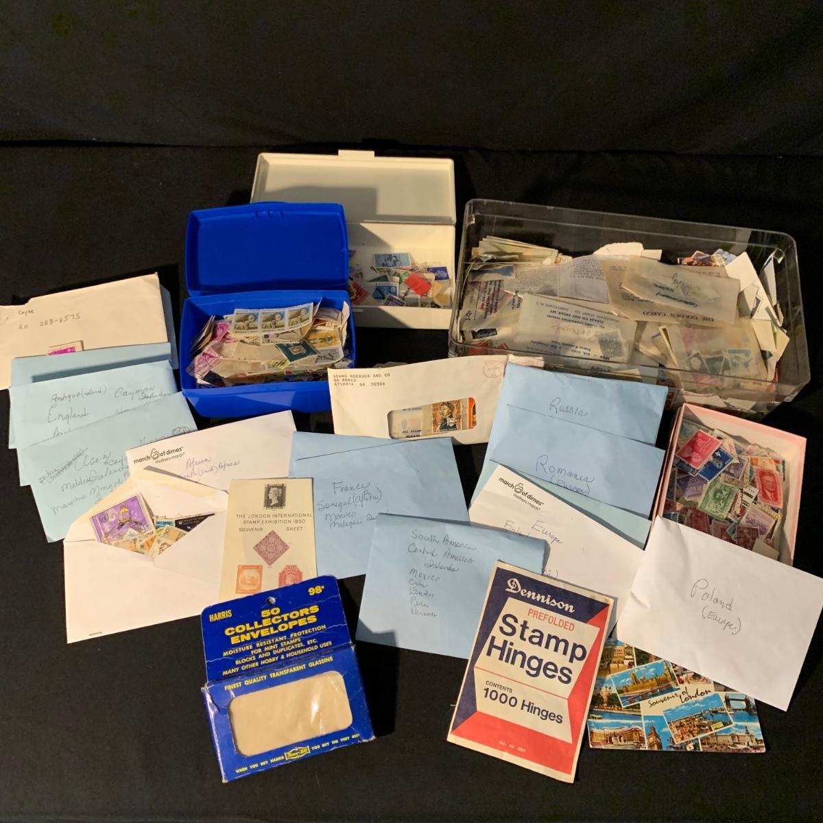 A collection of hundreds (if not thousands!) of loose stamps, as well as a packet of 1,000 prefolded stamp hinges and a box of 50 glassine collectors envelopes. Please see photos for an idea of the stamps included in this collection.