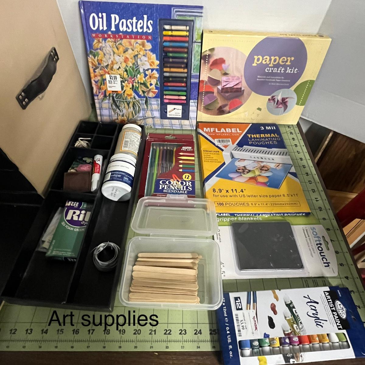 Includes glue gun, paints, markers, scissors, paper, brushes, pastels.