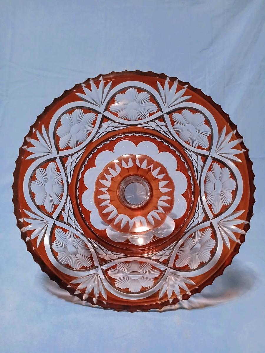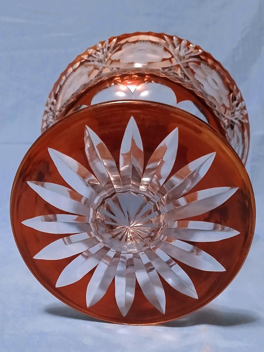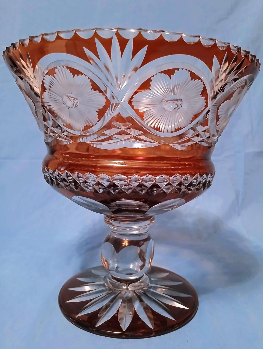 Impressive Large Bohemian Cut Crystal Pedestal Bowl - Orange Flashed/Cased Glass Cut to Clear