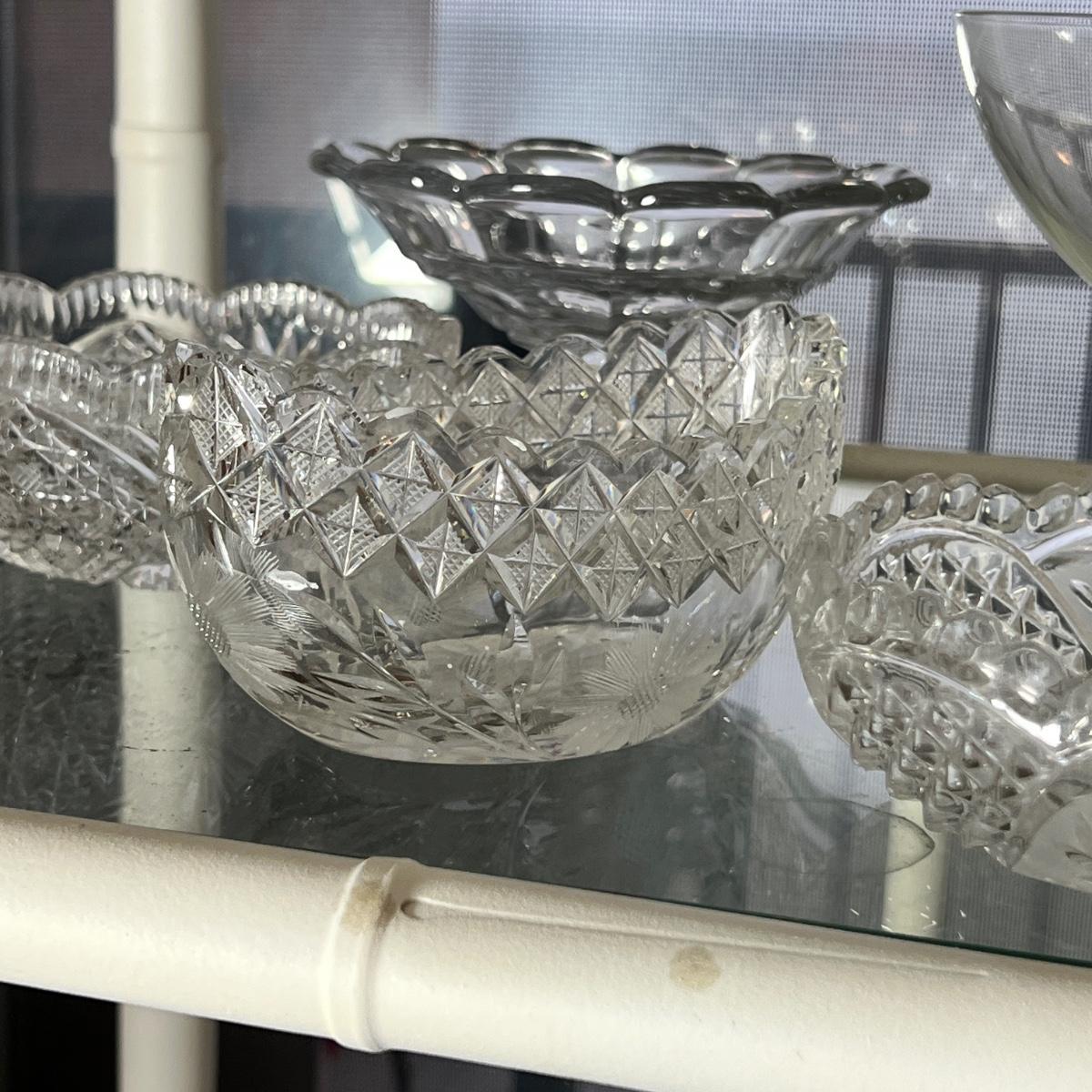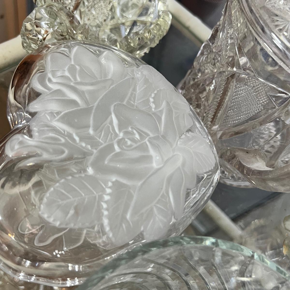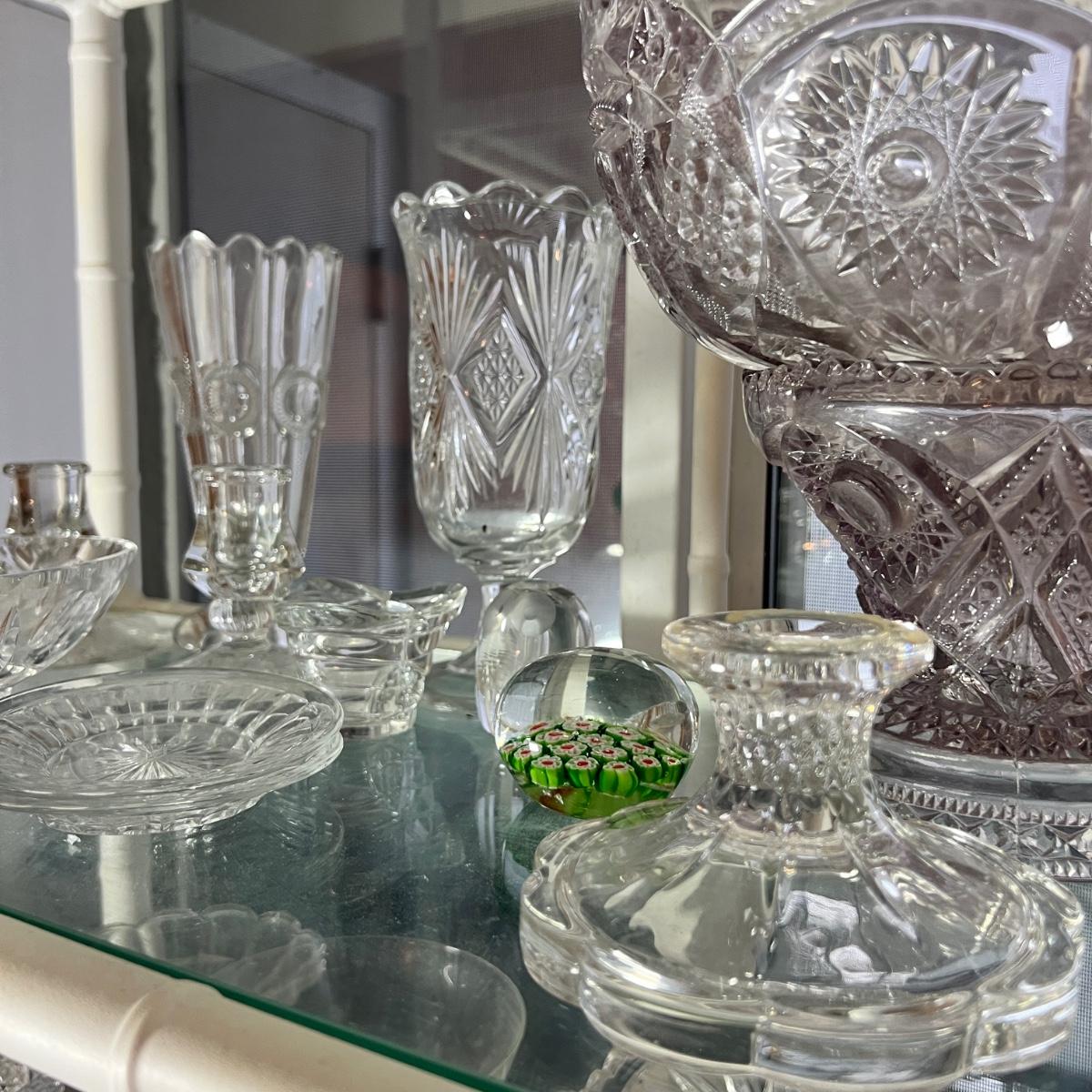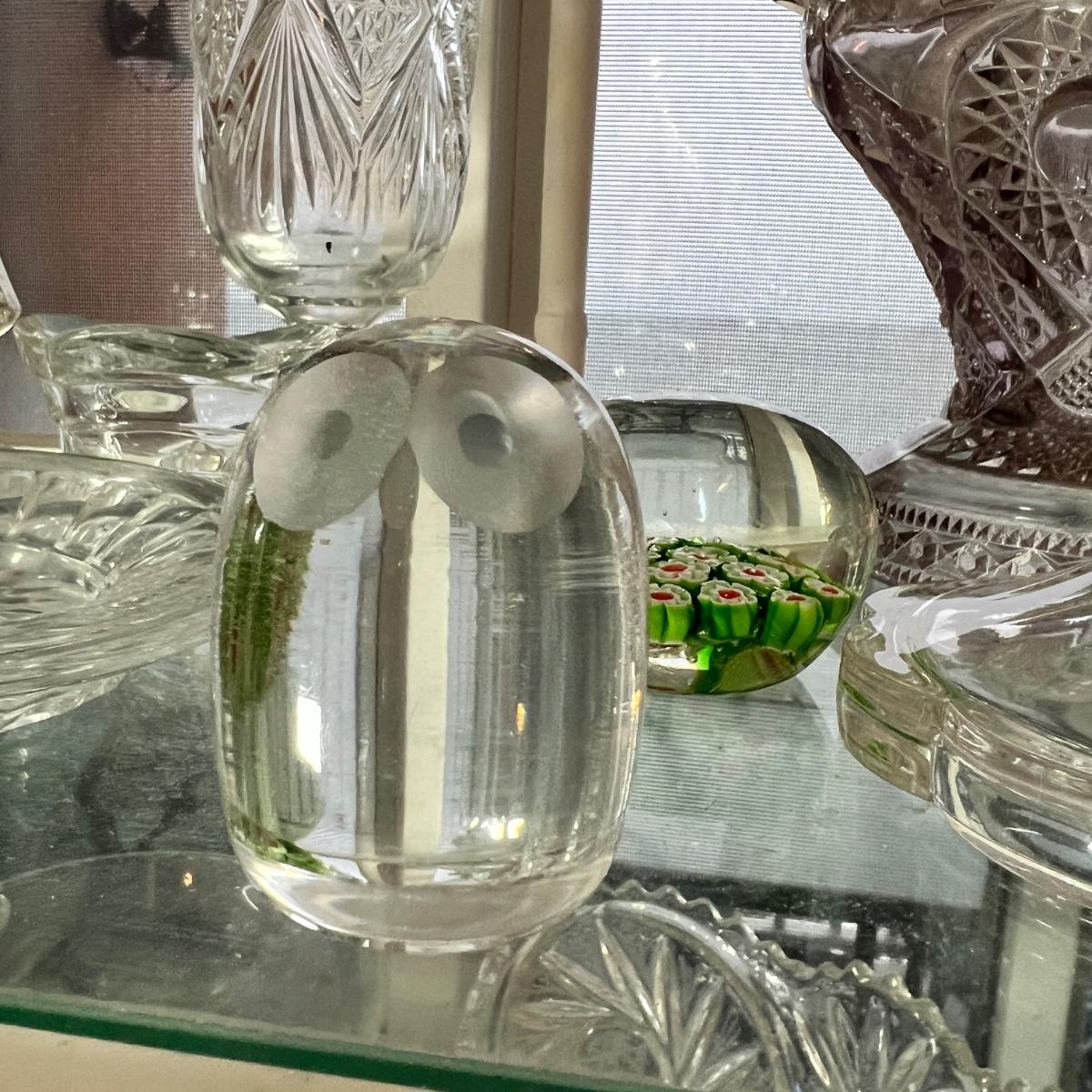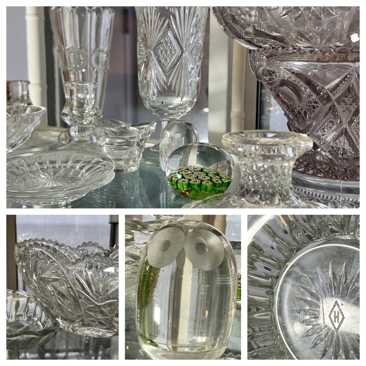 This is an amazing lot! Some pieces are signed or hallmarked like the 2 small Heisey Glass plates and the Hadeland owl. Lot includes 4 shelves of pieces.