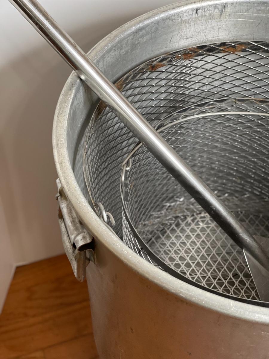 Includes 2 baskets, burner/stand, paddle and lid. Pot alone is 17” H x 19” round.