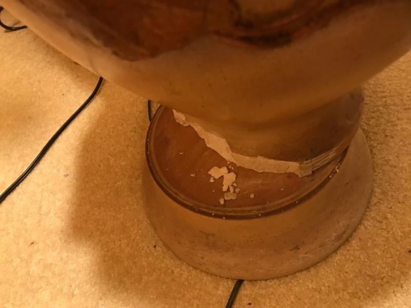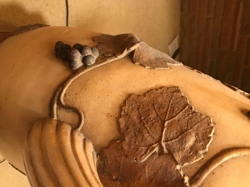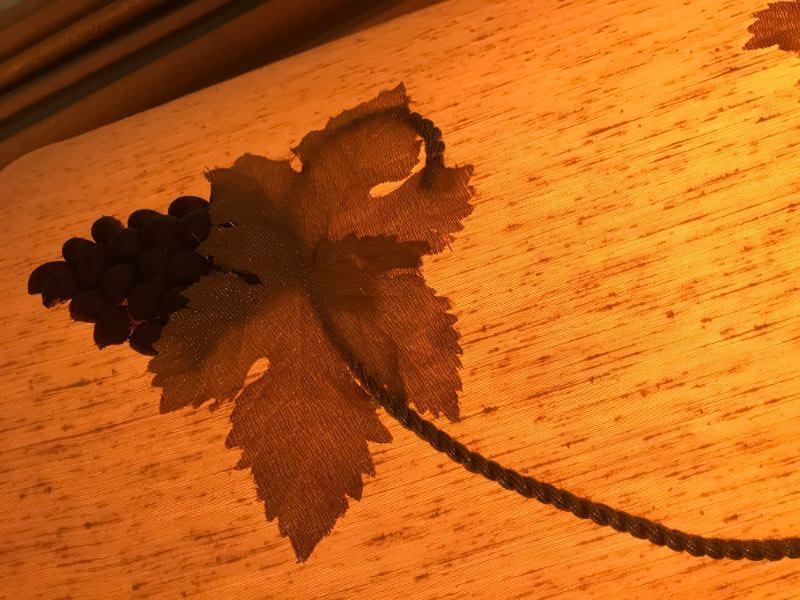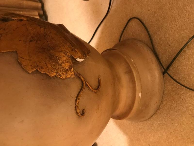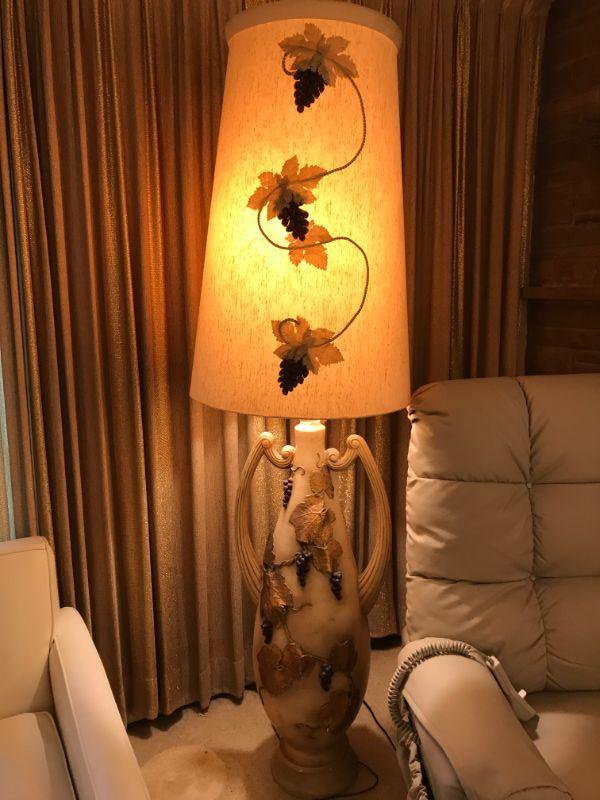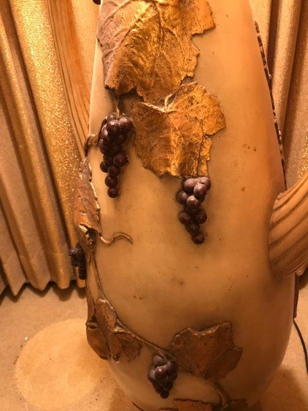 75 inches tall with grape motif. Badly damaged at back and base but shows well. Original Shade in good condition. Hard to find.