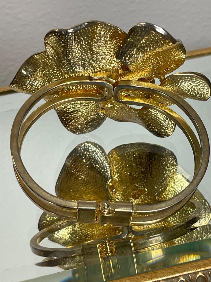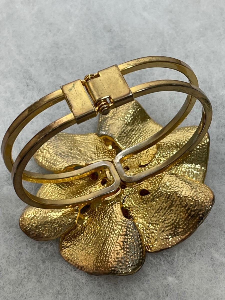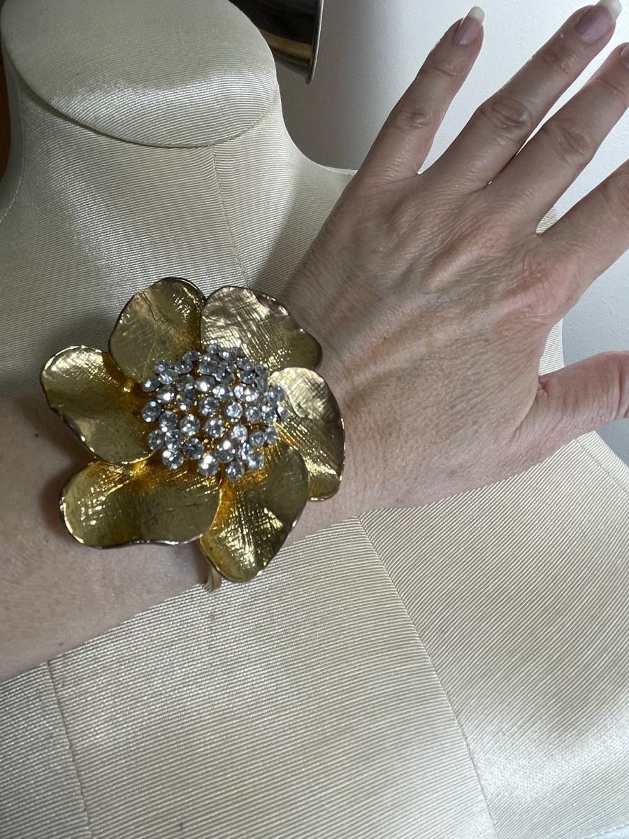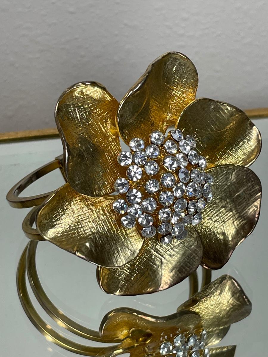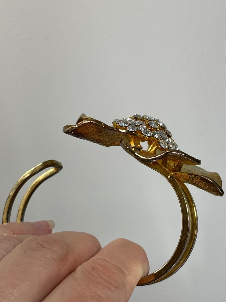 Gold tone metal shows wear underneath. With clear rhinestones.