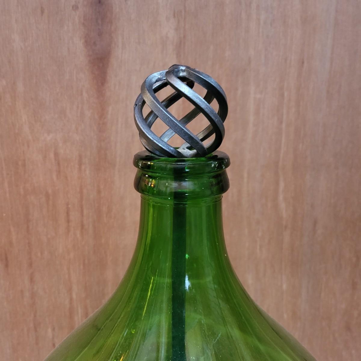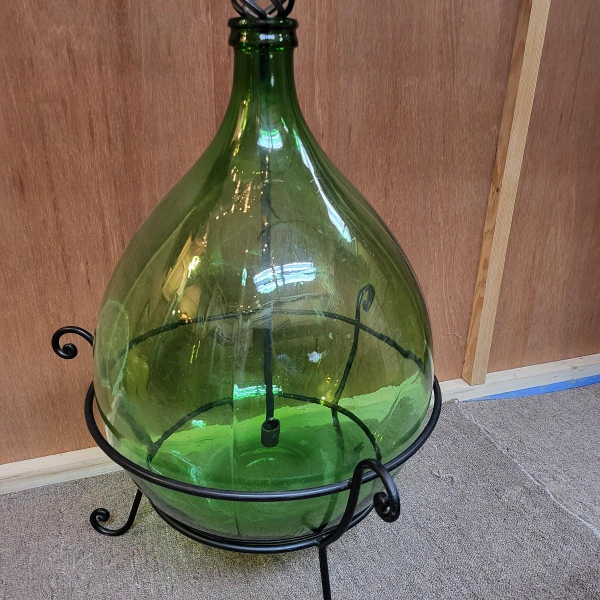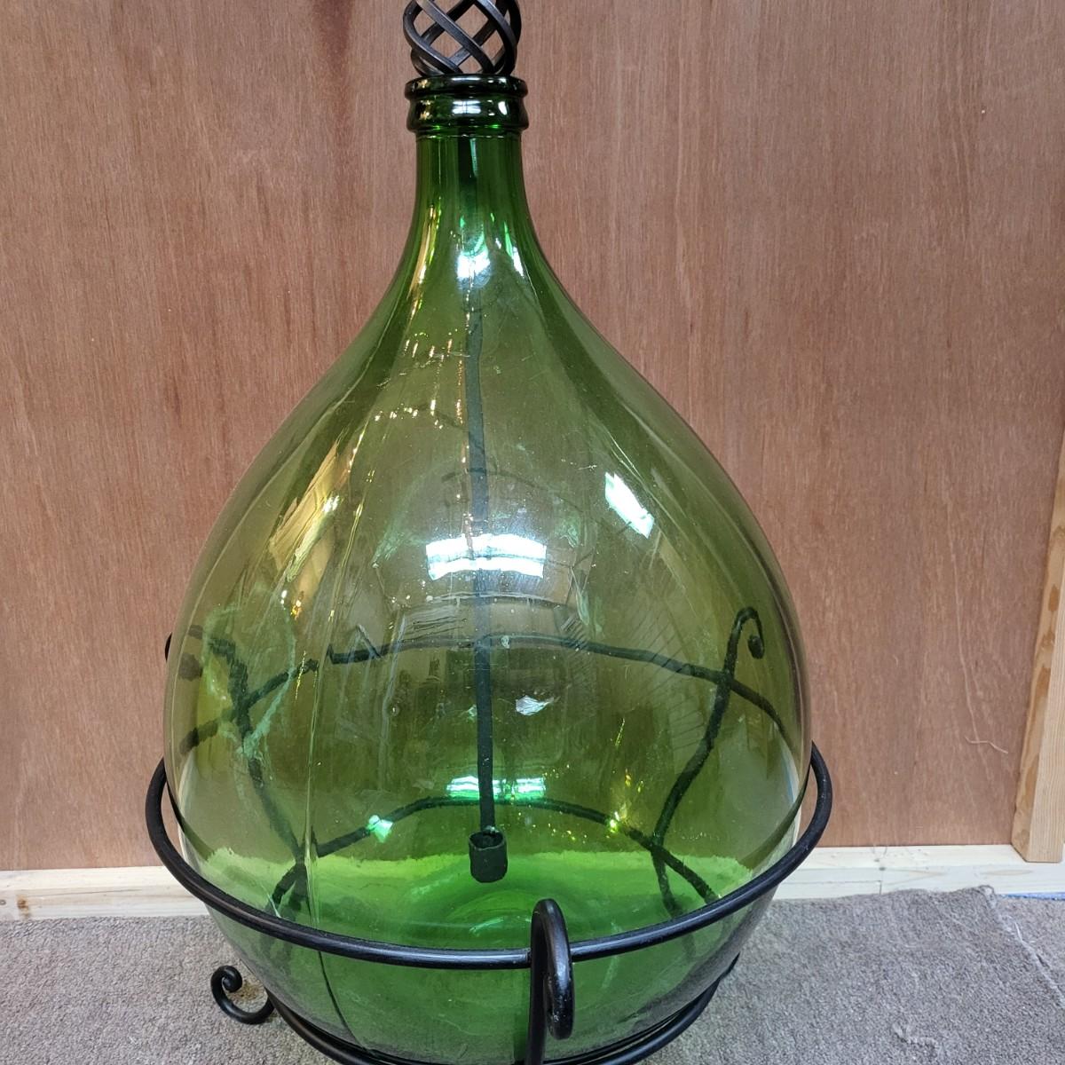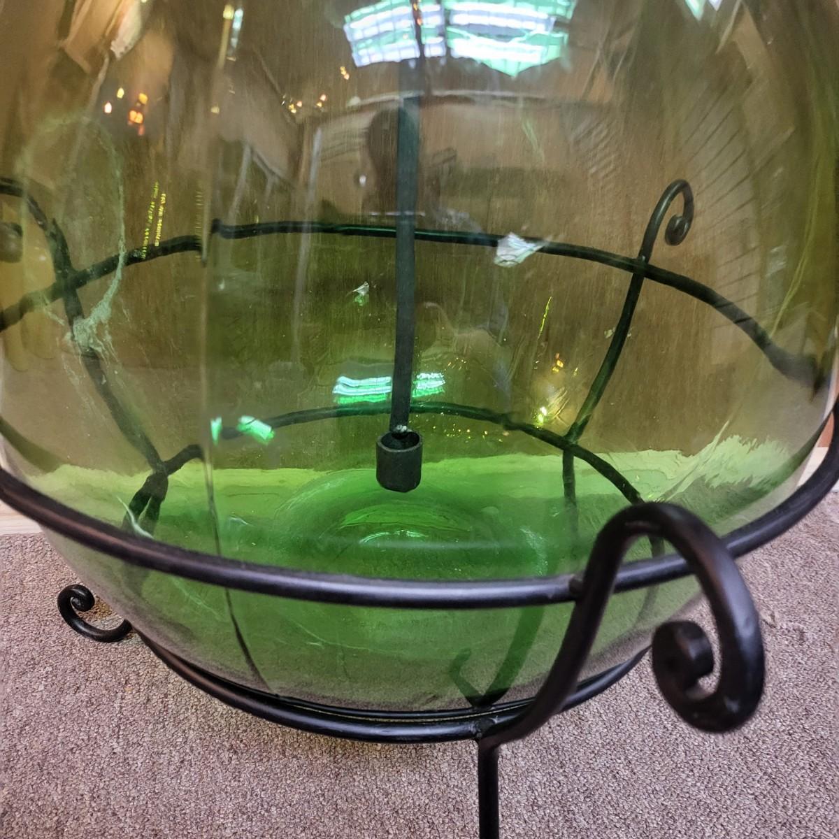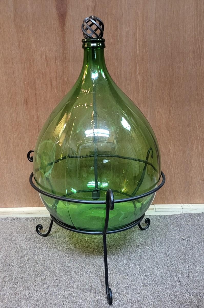 Huge green glass demijohn, bottle/jug resting on a sturdy metal base. Measures about 18"W x 24"T. Has flat bottom, so will free stans without the metal base.