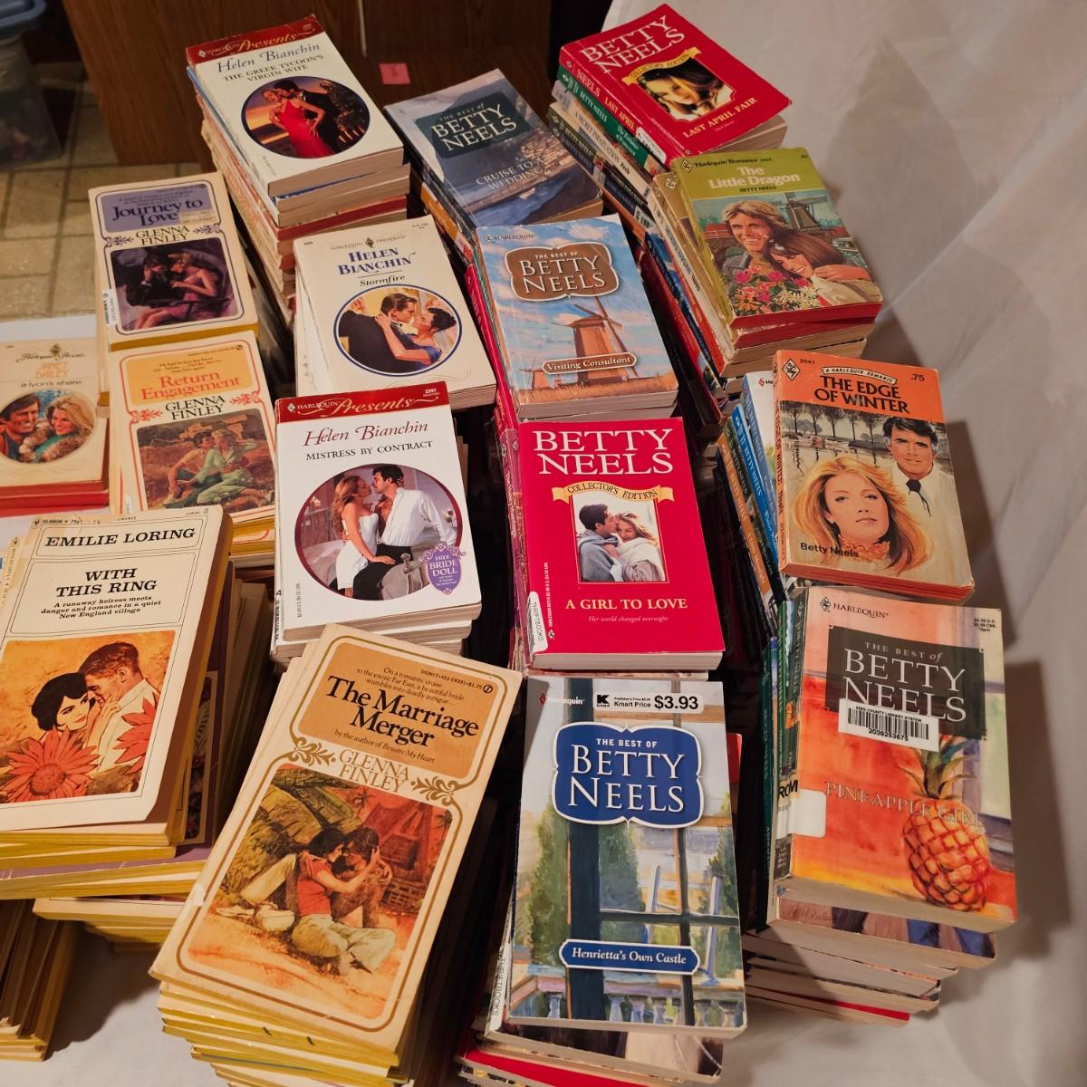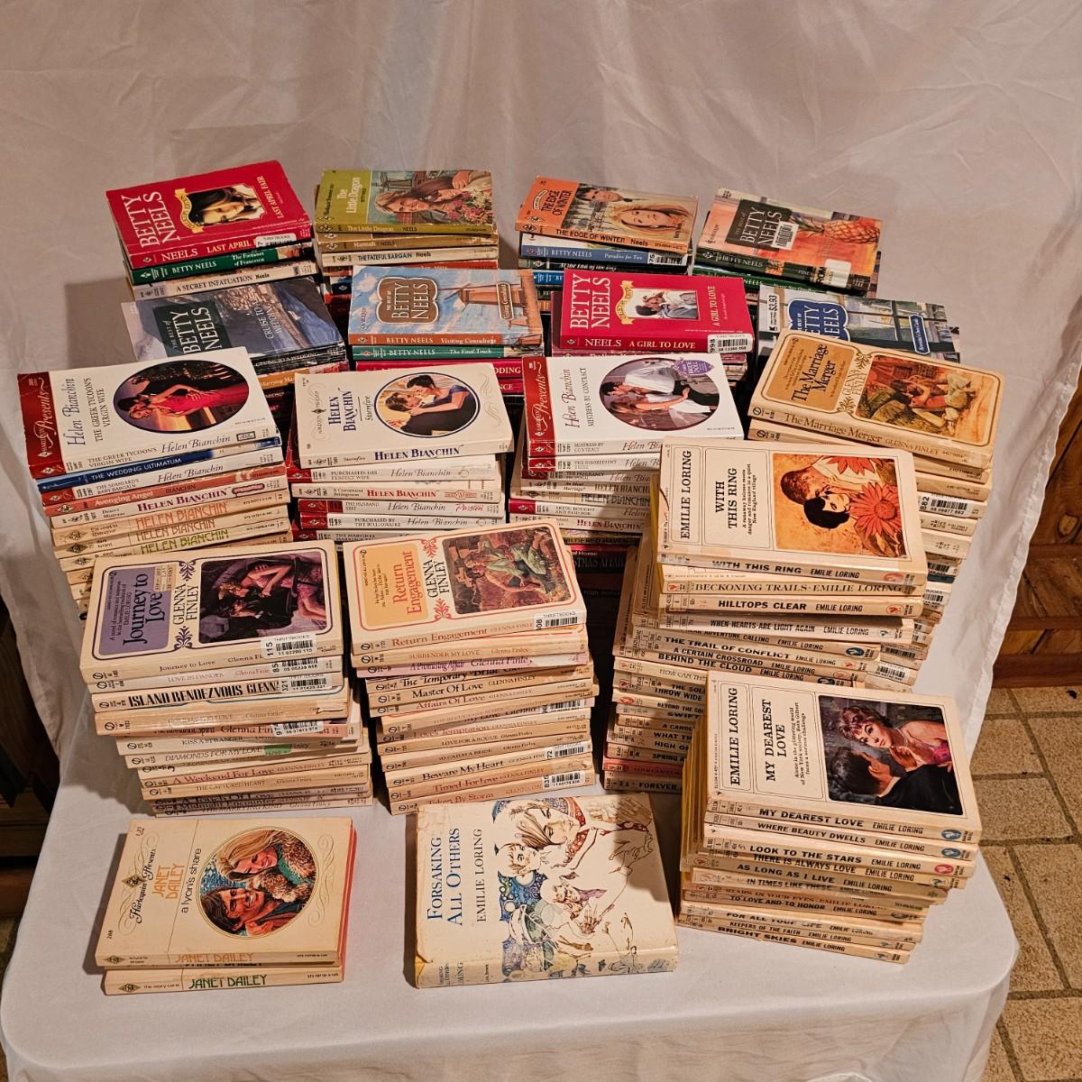 Hours and days worth of reading material here. For those of you fond of Harlequin romance, here is your jackpot! Over 275 books by authors such as Betty Neels, Emilie Loring, Helen Bianchi, Glenn Finley and more. All books are gently used and worn, dating from the 1970's and forward. See photos for details. Shipping available.