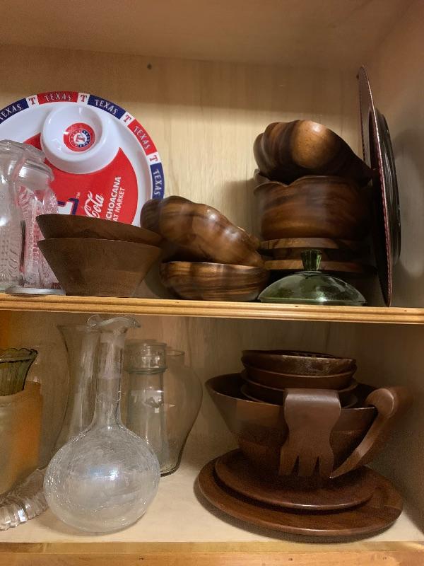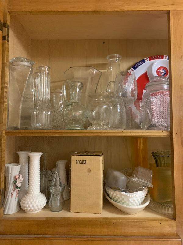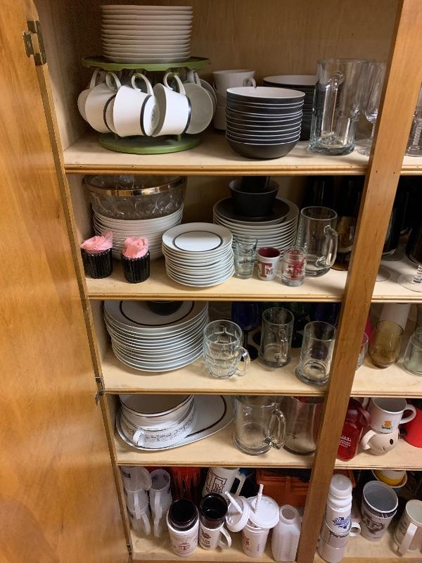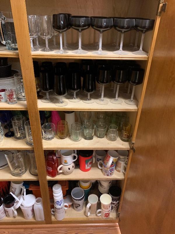 Glassware, milk glass, China, mugs, cups, wine glasses, bamboo trays, plus more