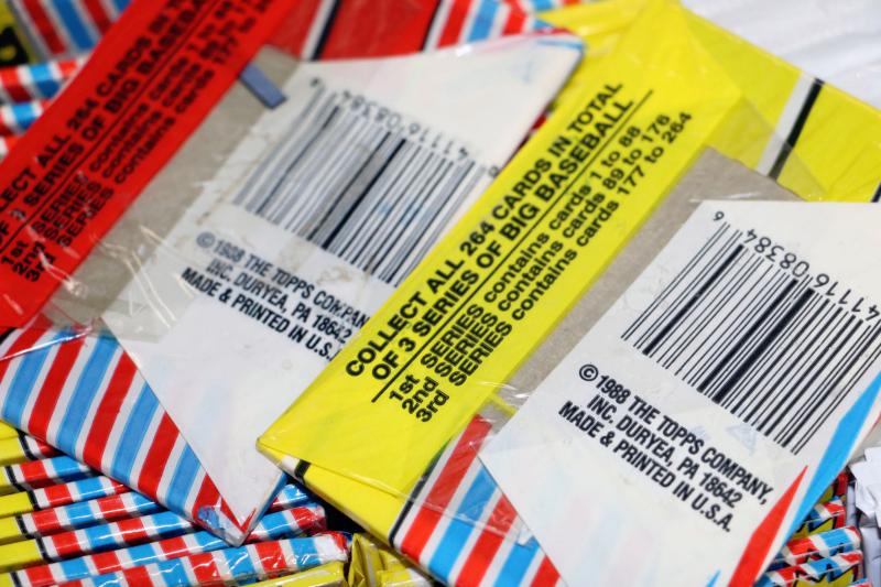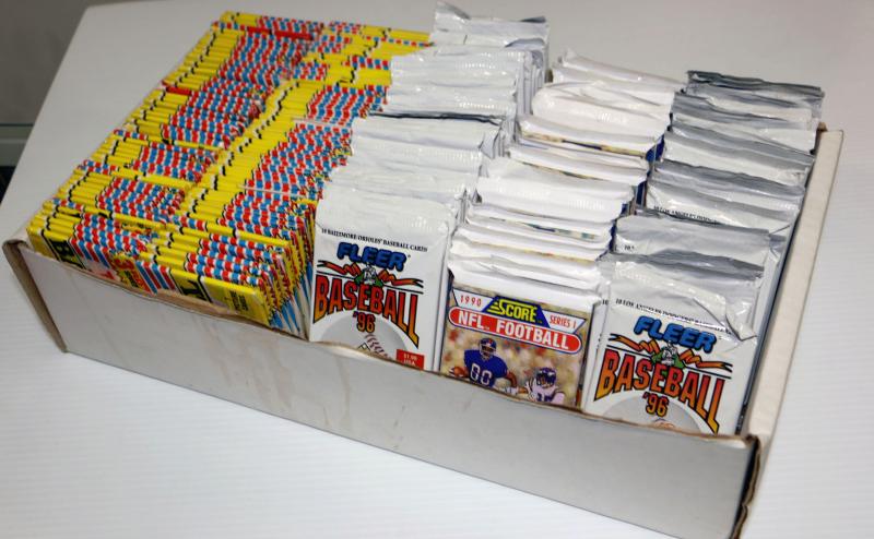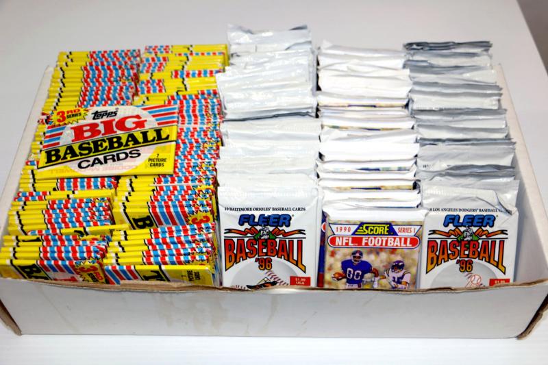 Lot includes 182 factory sealed packs. 1988 Topps Big Baseball Cards - 98 packs x 7 cards = 686 cards, 1996 Fleer Baseball LA Dodgers - 64 packs x 10 cards = 640 cards, 1990 Scoore NFL Football - 20 packs x 16 cards = 320 cards, all packs are factory sealed, in total 1646 cards - Great Buy!