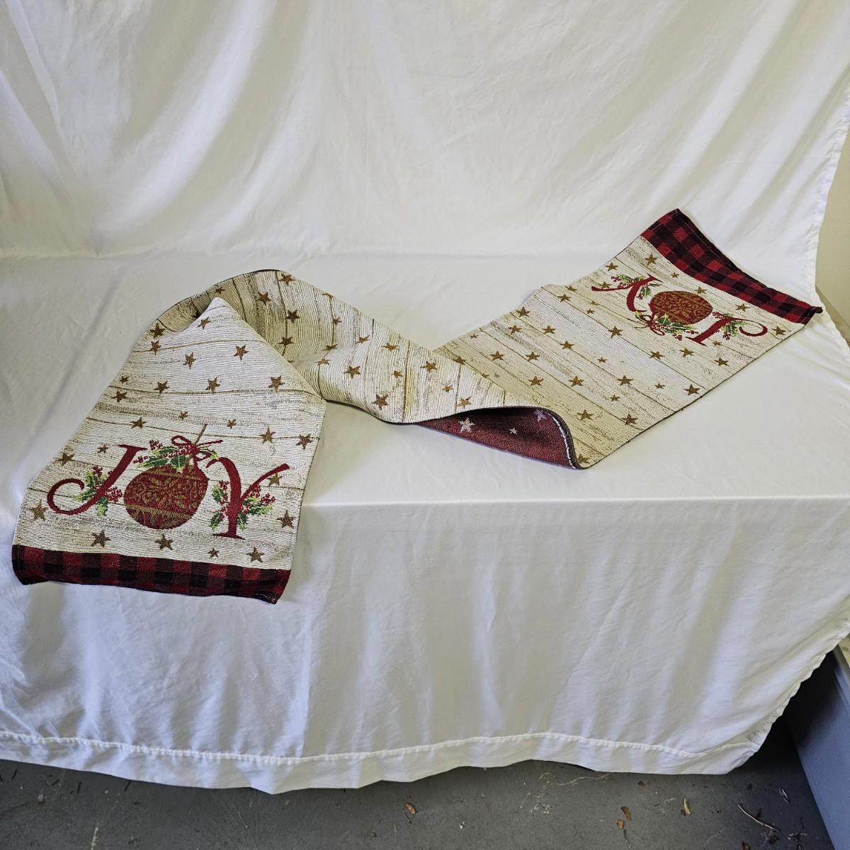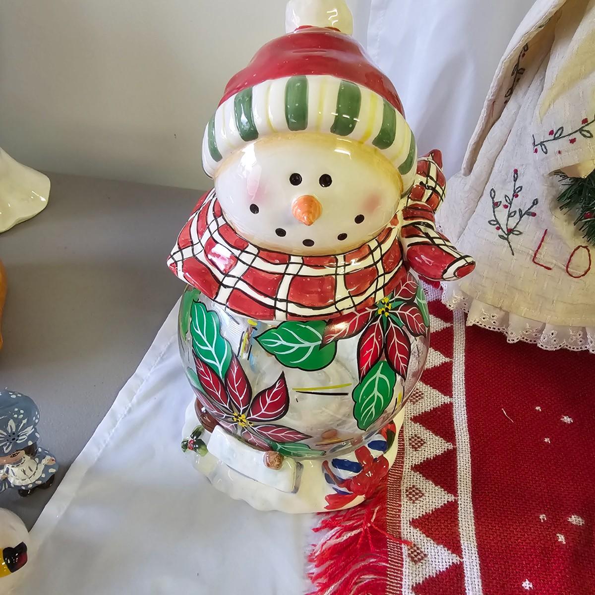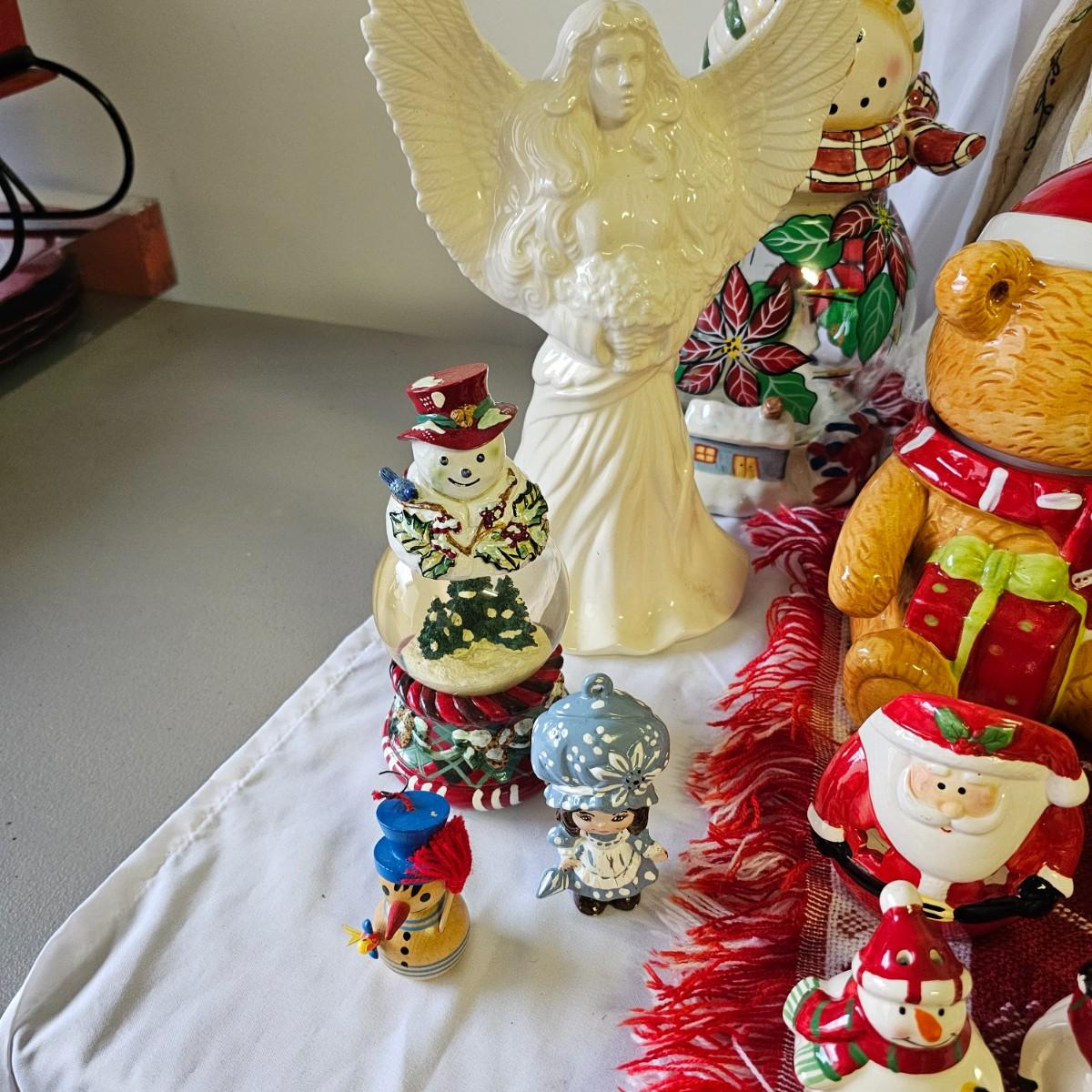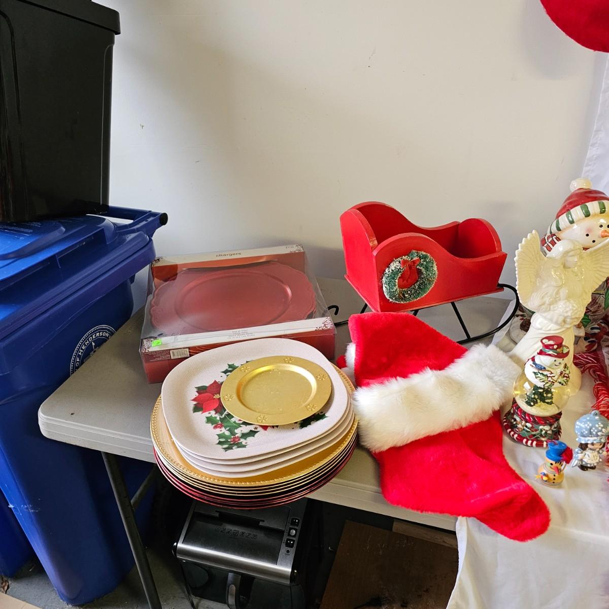 A bunch of fun items to decorate your home with for the holidays. Angels, snowmen, gnomes, teddy bears, more. Candle holders, cookie jars, stockings, table sitters. A dozen plastic charger plates in gold and red, 14"D. Joy table runner, 13" x 70" long. A Santa throw blanket, 44" x 54". See photos for details. Local pickup only.