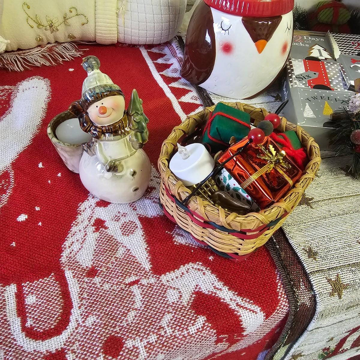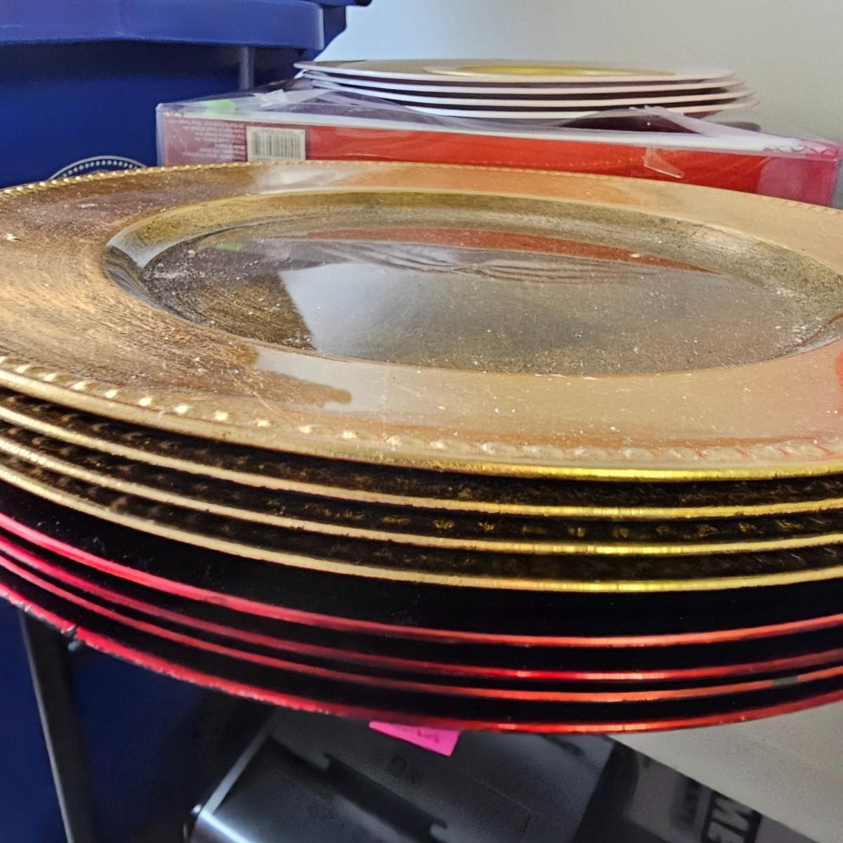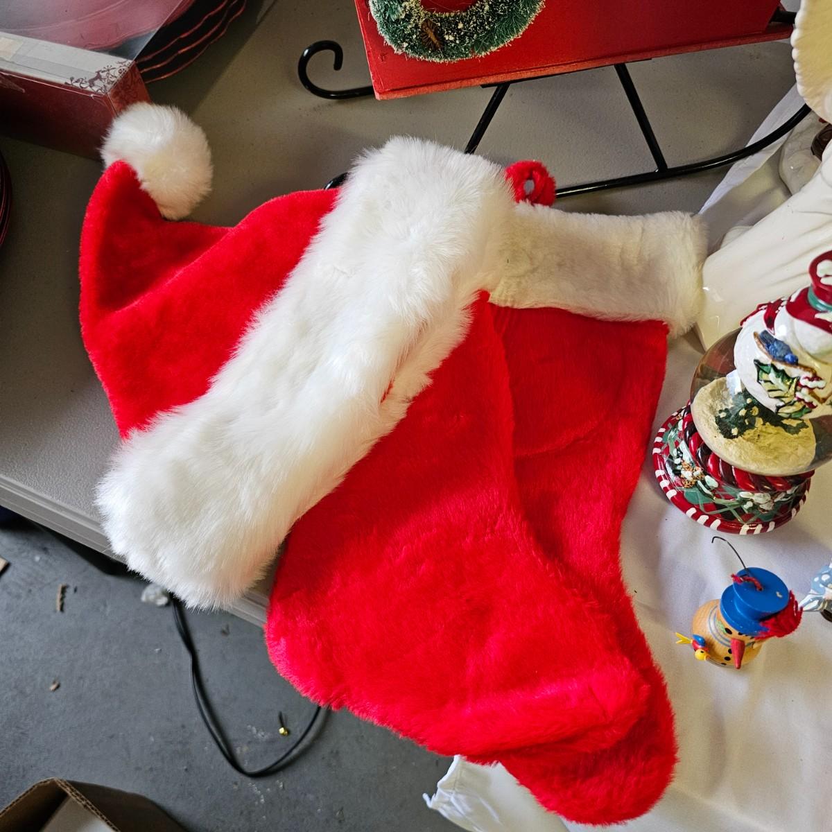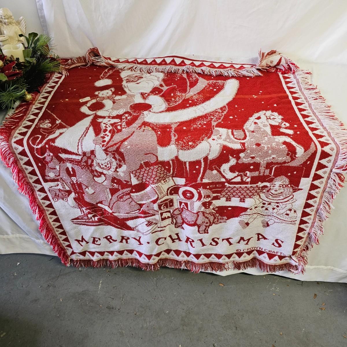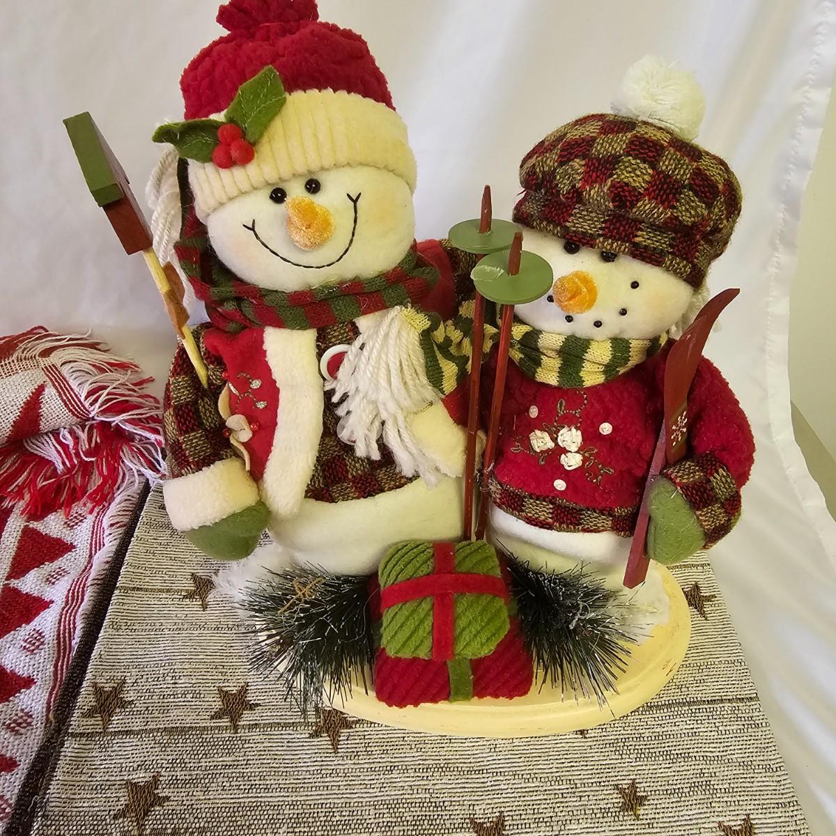 A bunch of fun items to decorate your home with for the holidays. Angels, snowmen, gnomes, teddy bears, more. Candle holders, cookie jars, stockings, table sitters. A dozen plastic charger plates in gold and red, 14"D. Joy table runner, 13" x 70" long. A Santa throw blanket, 44" x 54". See photos for details. Local pickup only.