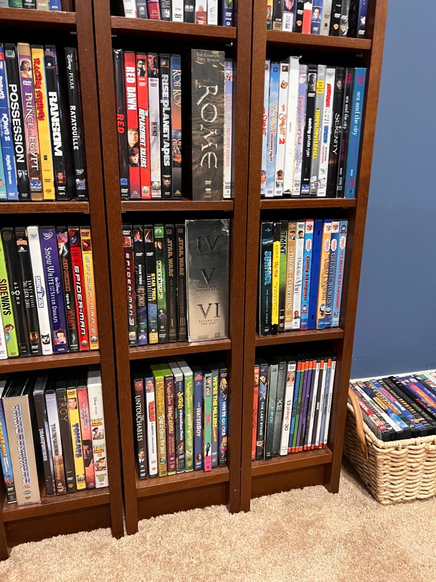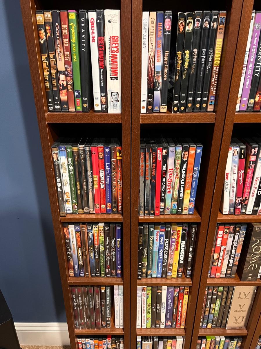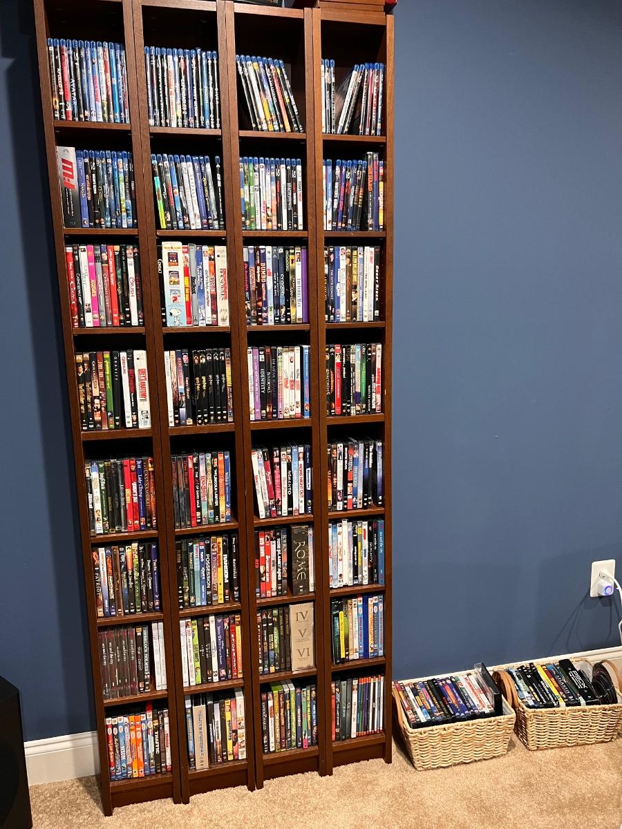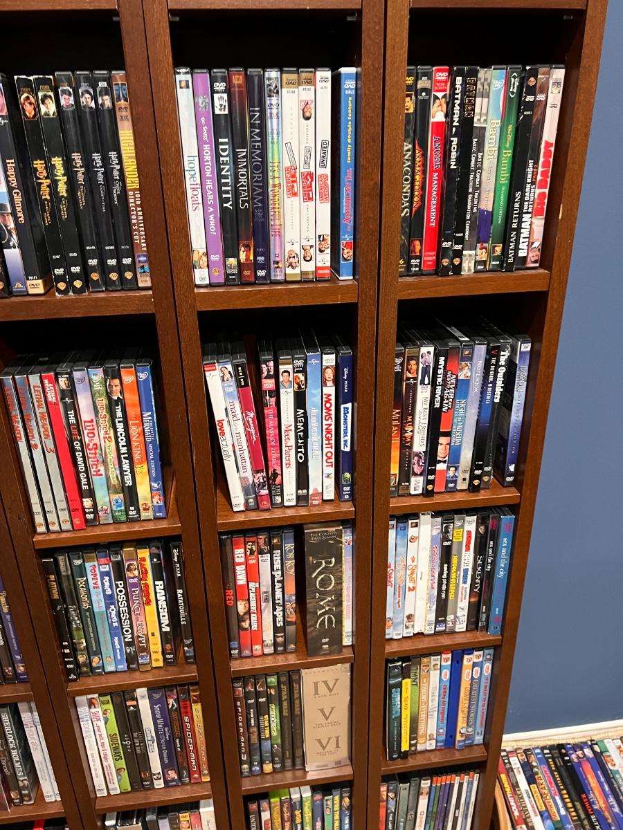 Shelves are not included but are in this auction. Multiple genres. Boxes have not been checked but owner says they’re all there and there is a stack of discs without boxes.
