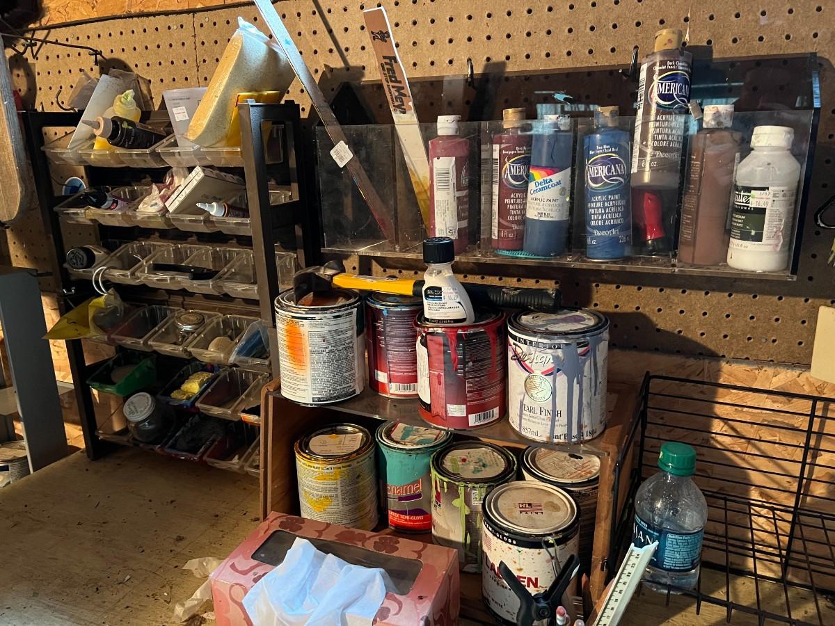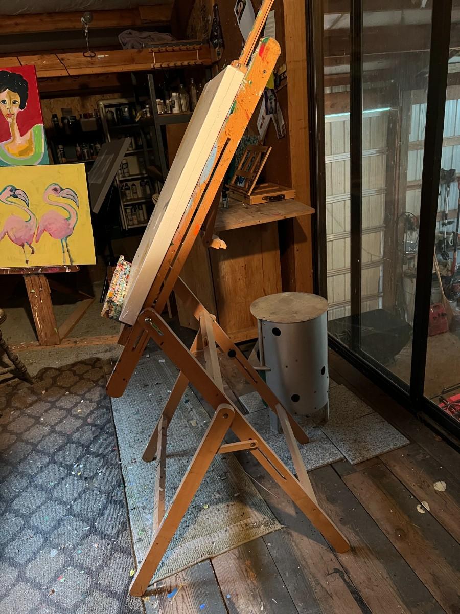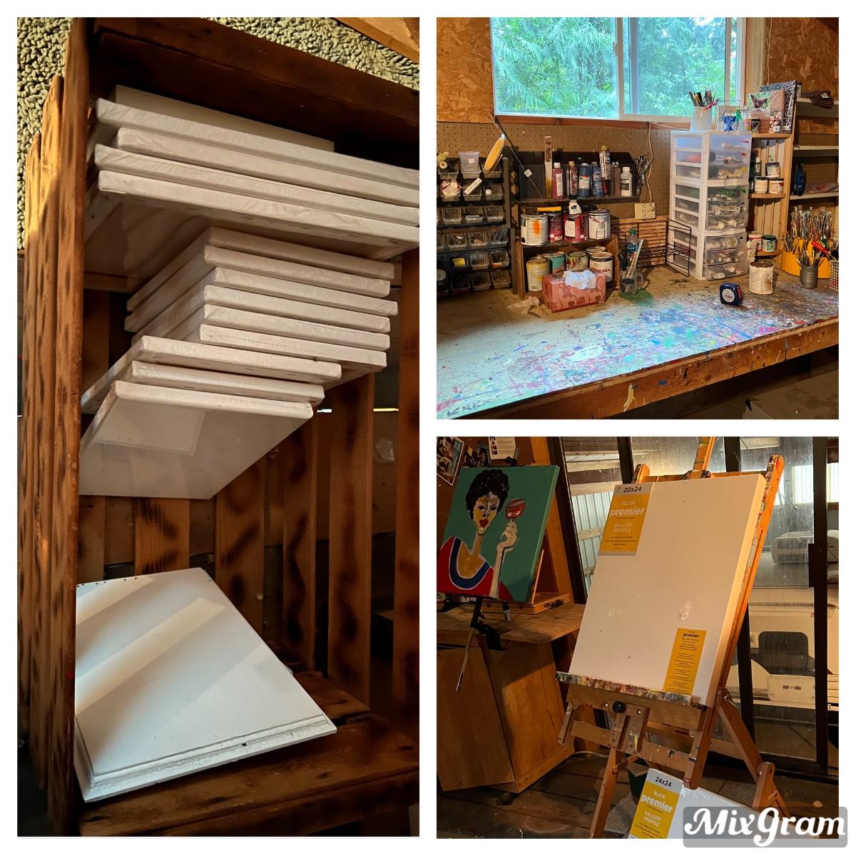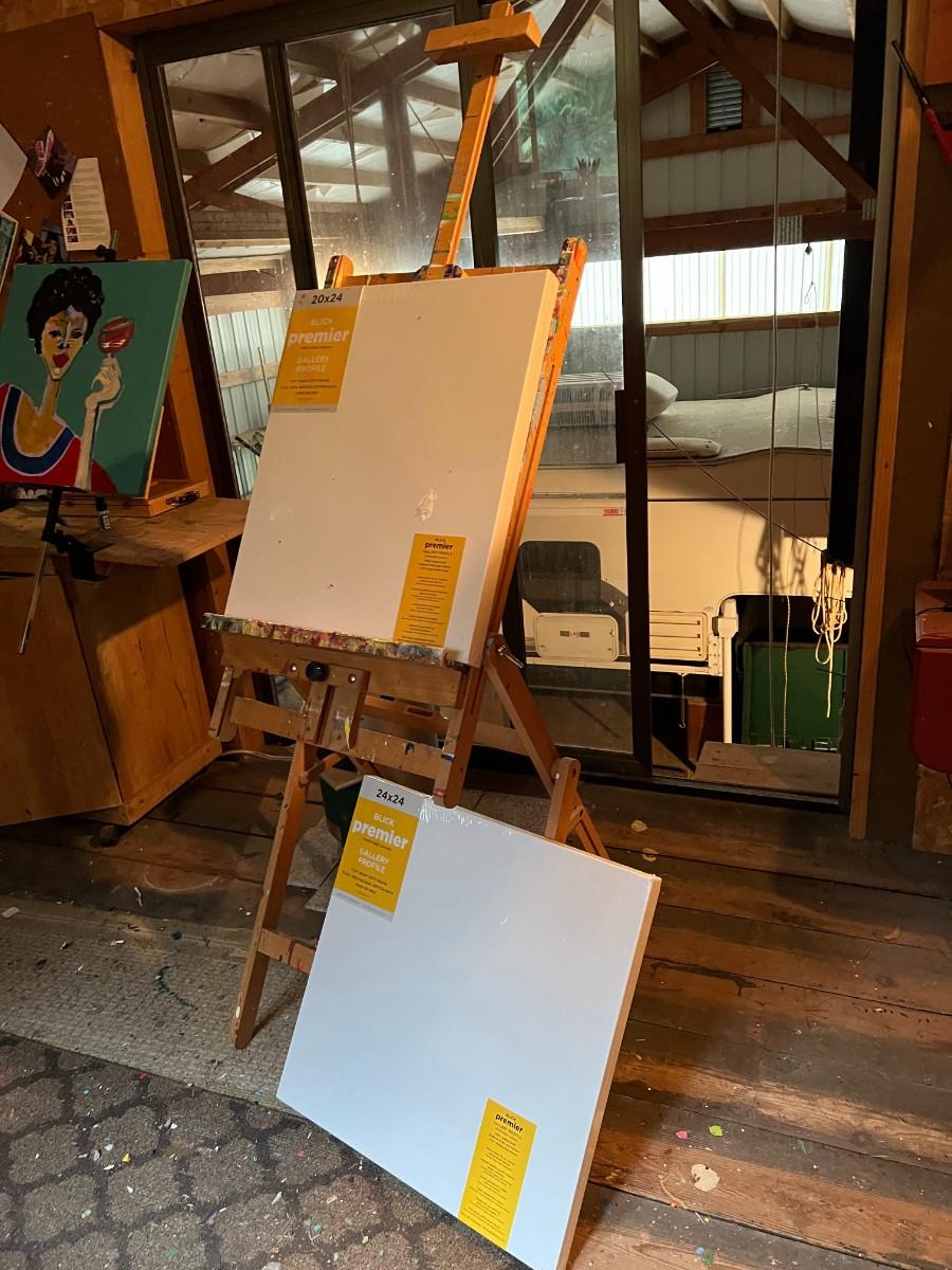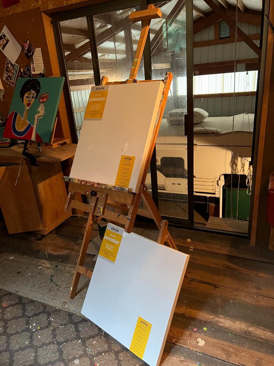 Huge Lot of Art Painting Supplies incl. Easles, Canvases, Paintbrushes, and Assorted Paint. Includes all art supplies shown in photos. Condition as shown. **Please note, these items are all in a loft space with a pull-down ladder access, and are being sold as-is, where-is**