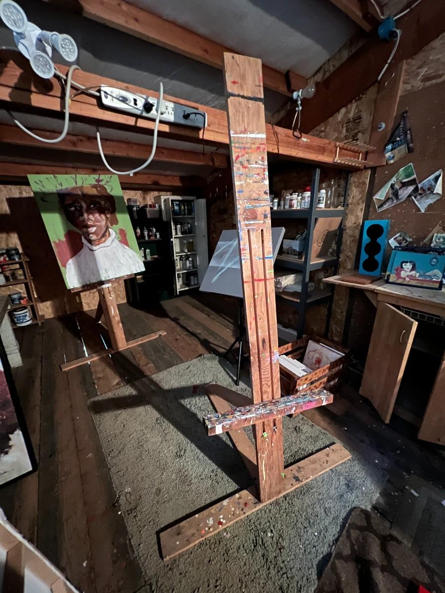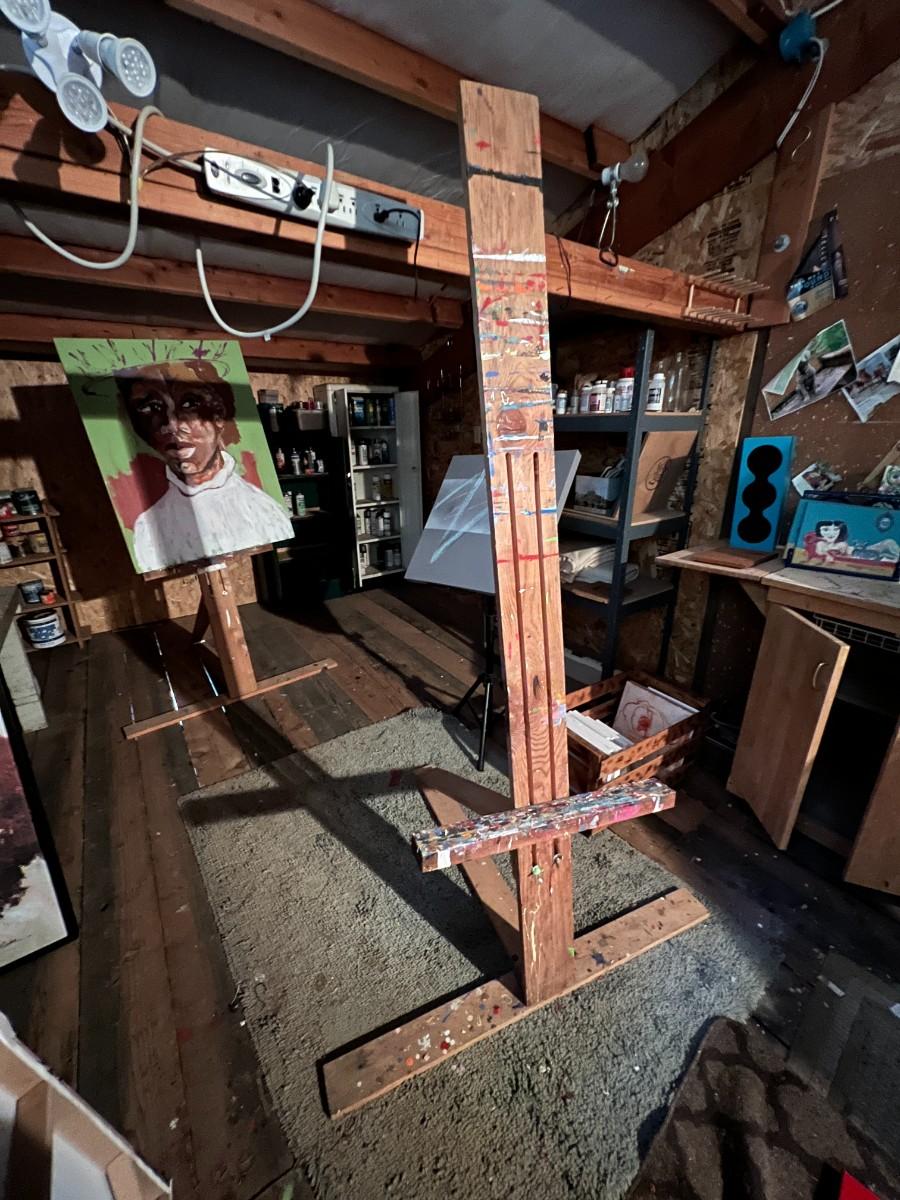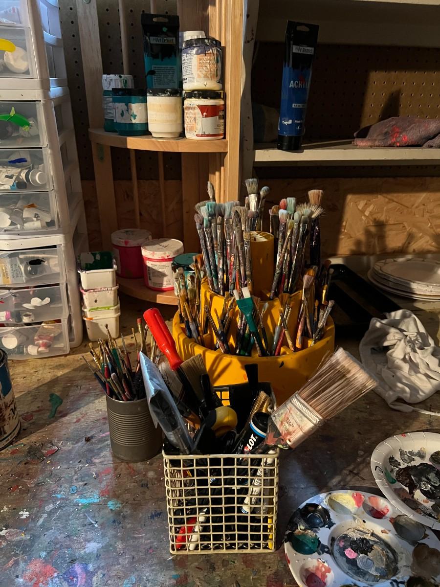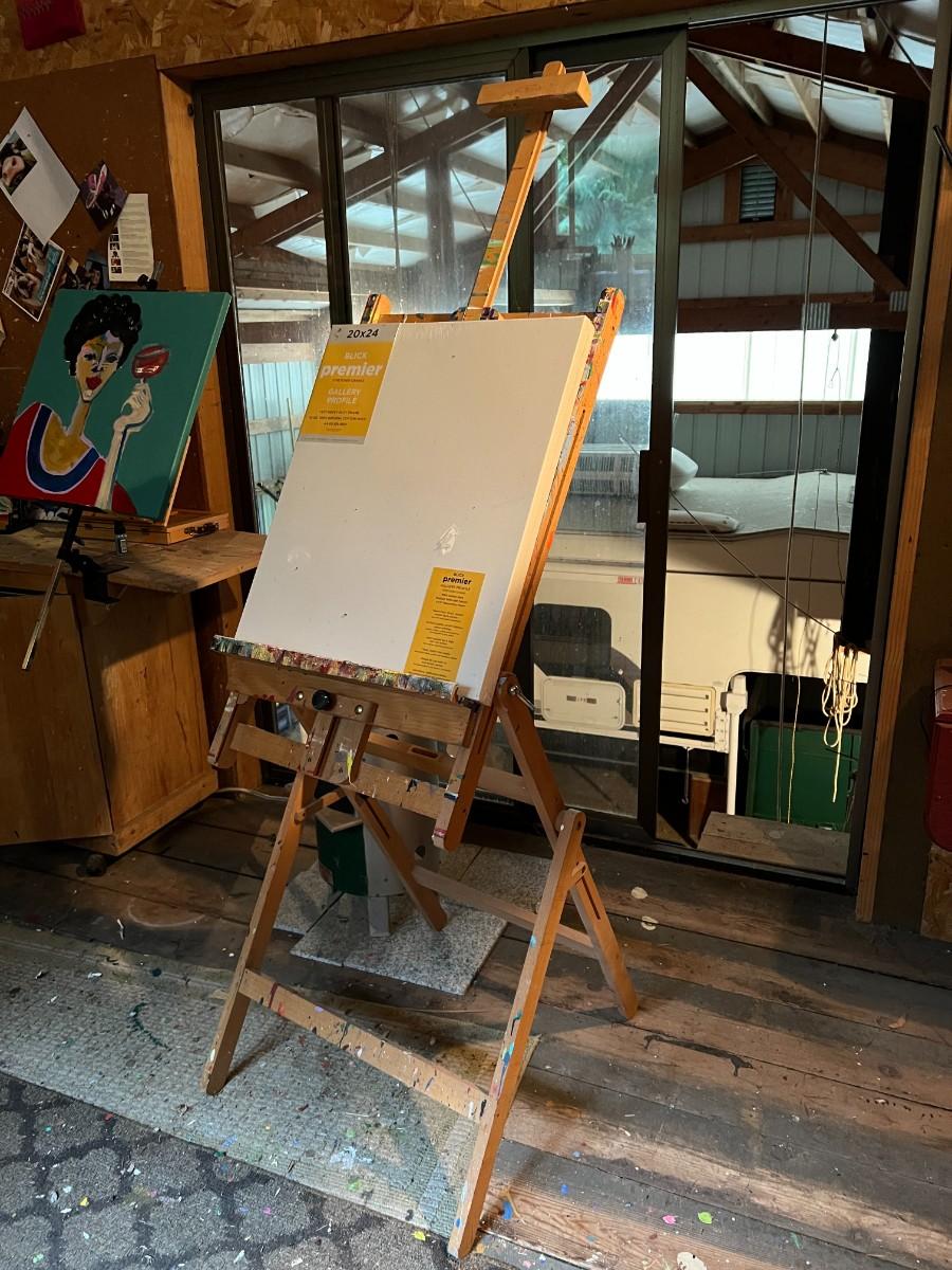 Huge Lot of Art Painting Supplies incl. Easles, Canvases, Paintbrushes, and Assorted Paint. Includes all art supplies shown in photos. Condition as shown. **Please note, these items are all in a loft space with a pull-down ladder access, and are being sold as-is, where-is**