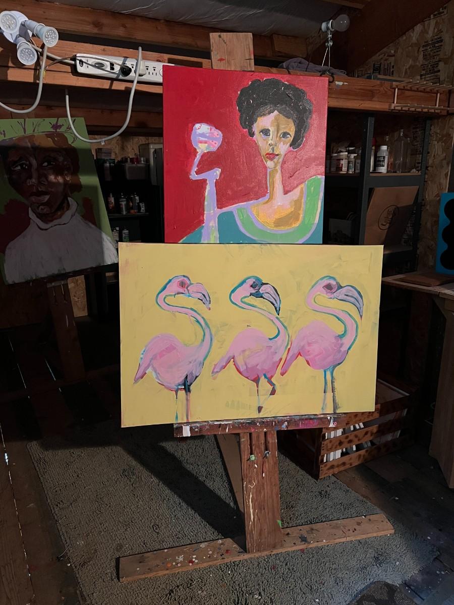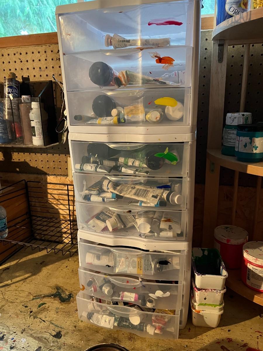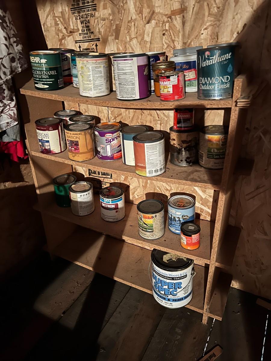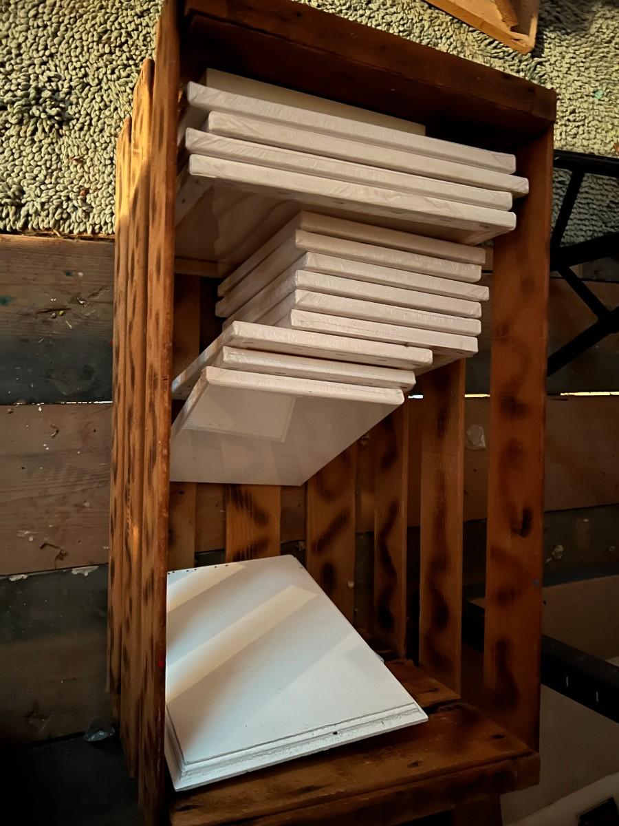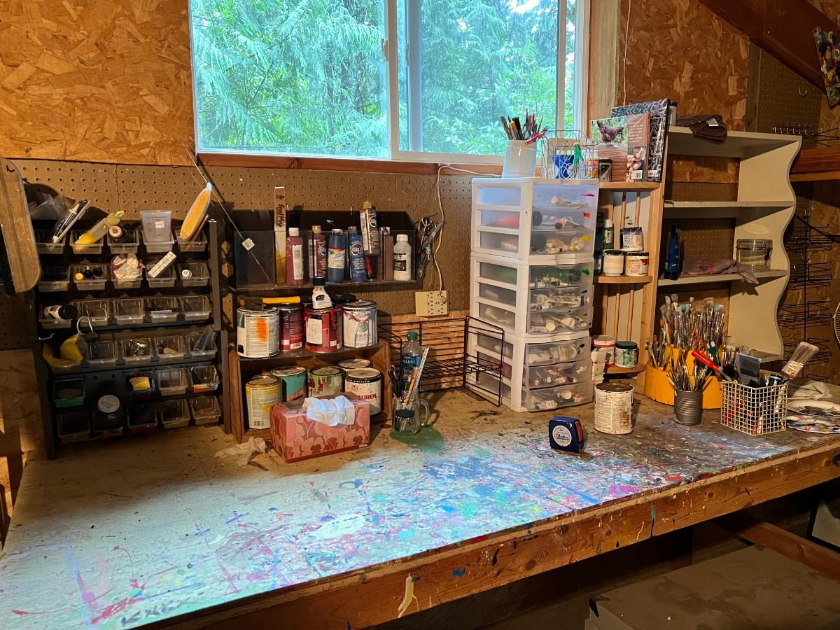 Huge Lot of Art Painting Supplies incl. Easles, Canvases, Paintbrushes, and Assorted Paint. Includes all art supplies shown in photos. Condition as shown. **Please note, these items are all in a loft space with a pull-down ladder access, and are being sold as-is, where-is**