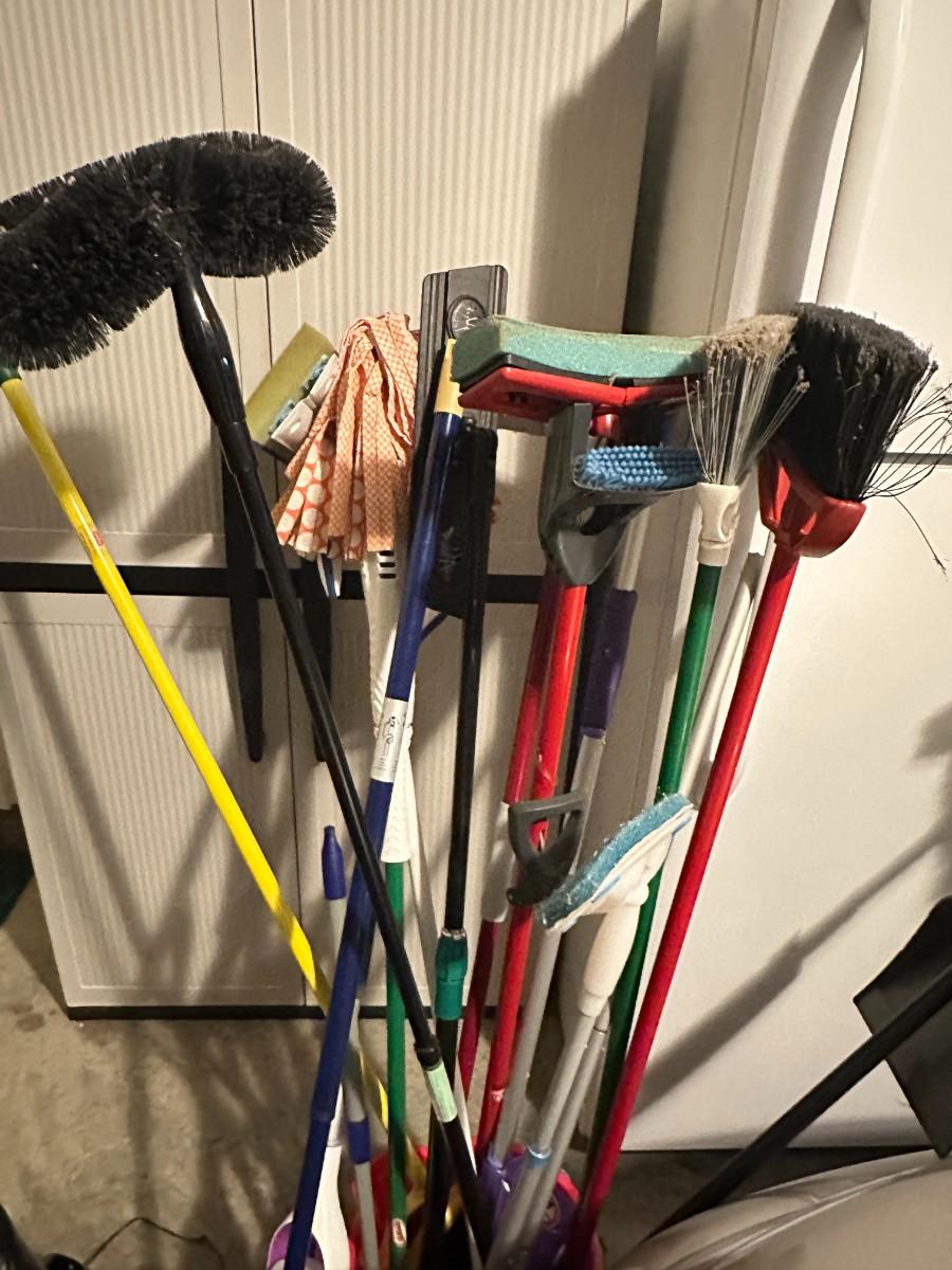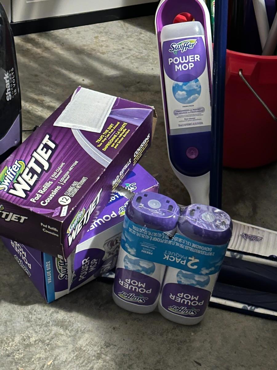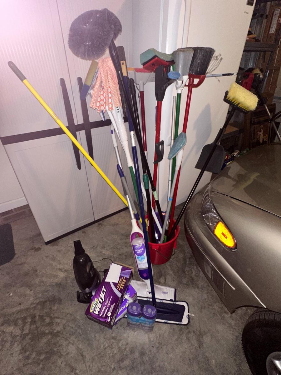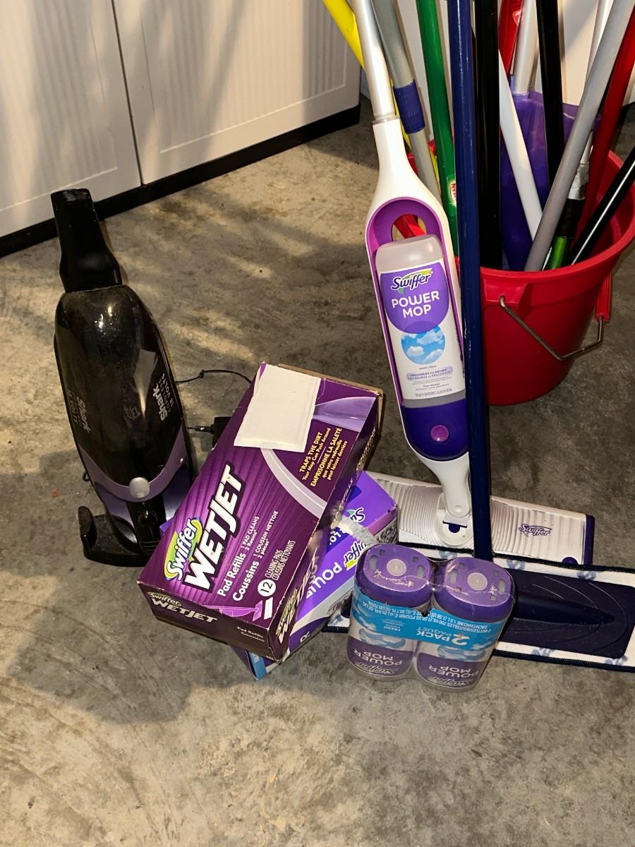 Huge Lot of Cleaning Supplies- brooms, mops, bucket, Swiffer Including Power Mop and Refills), Shark cordless handi-vac