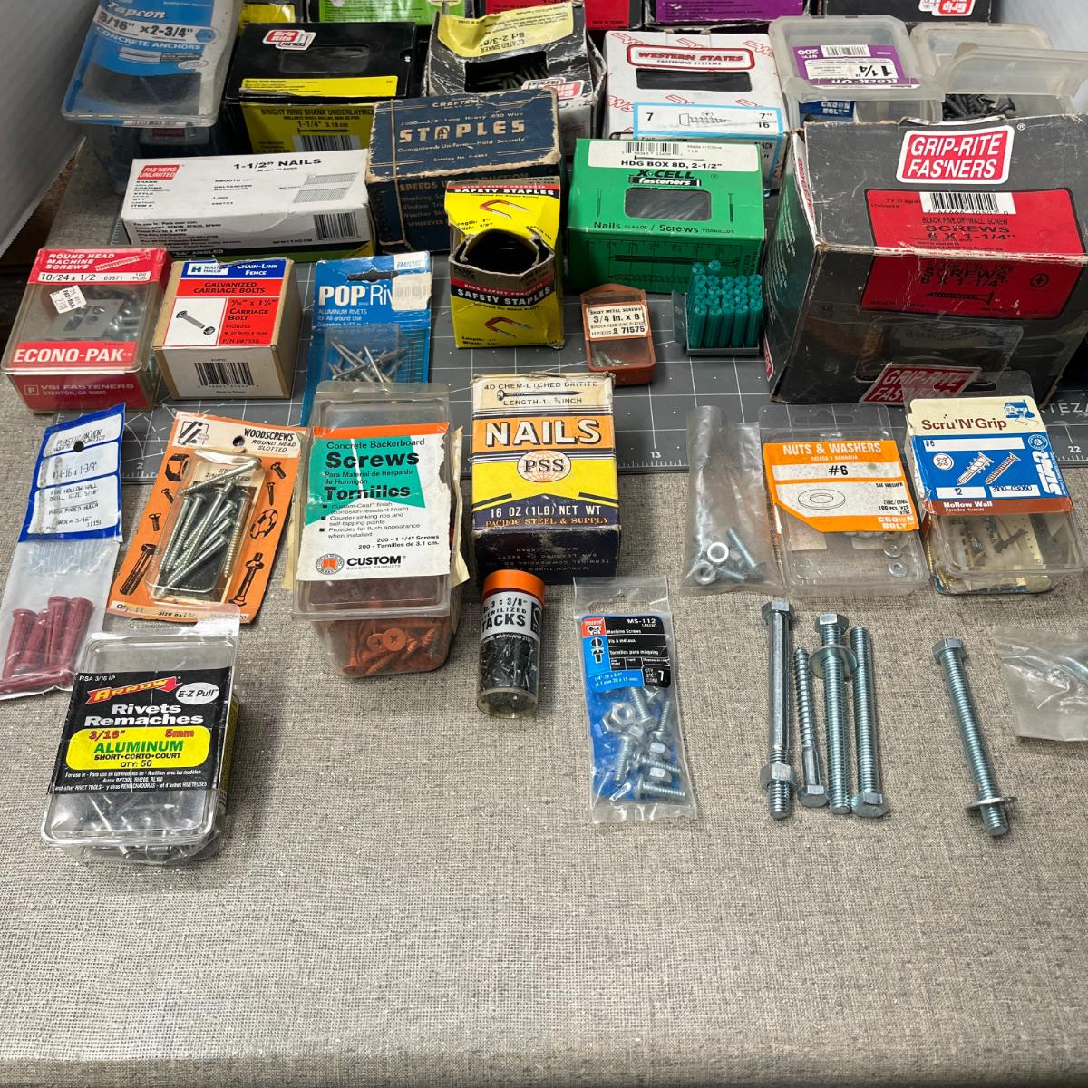 Large assorted lot of nails, screws, bolts, nuts, and fasteners etc.