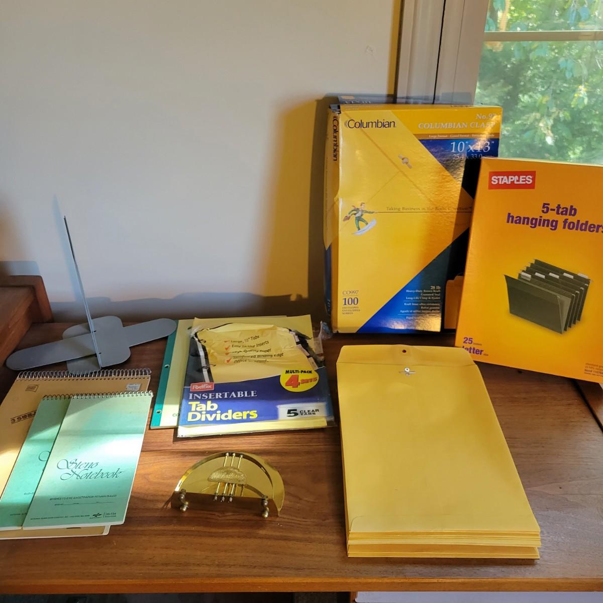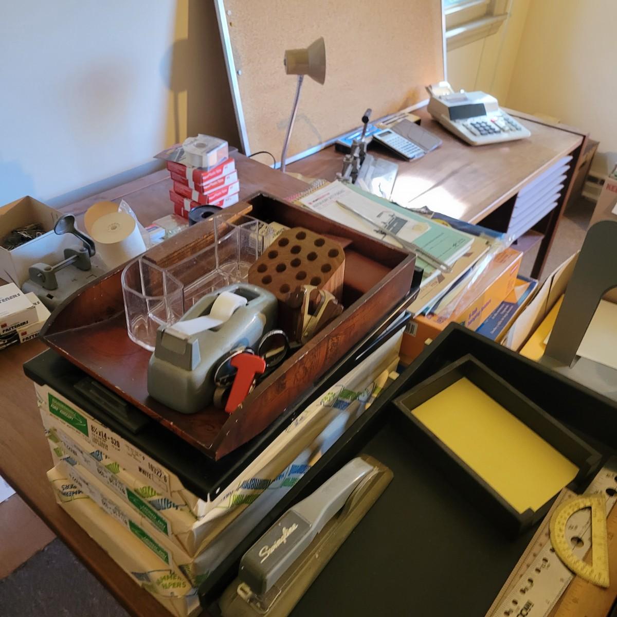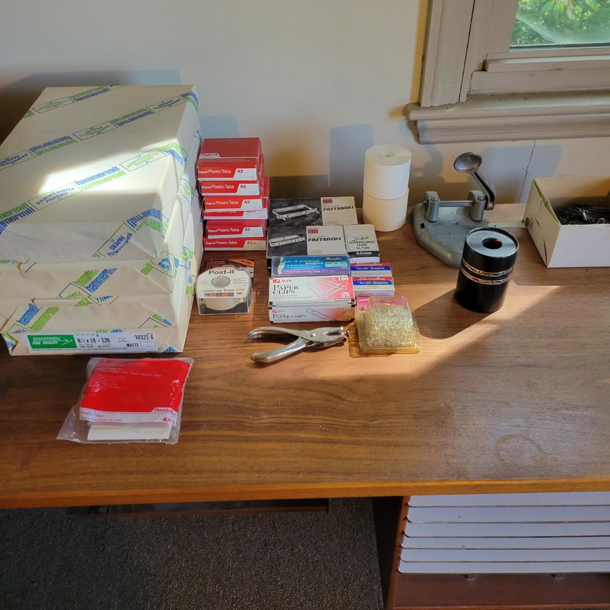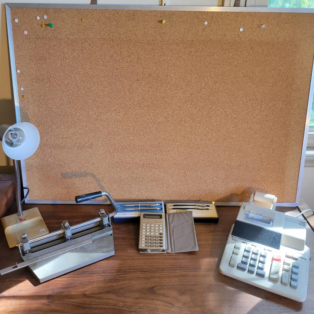Staplers, cork board, lamps, file folders, reems of paper and so much morein this lotnof office supplies. Most items are in good condition or unused. Includes letter trays, rulers, calculator, adding machine, pens, pen holders. Full inventory included in attached pictures. Cork board measures approximately 36" x 24" and has hanging brackets at the top. Adding machine did not power on. Local pickup only