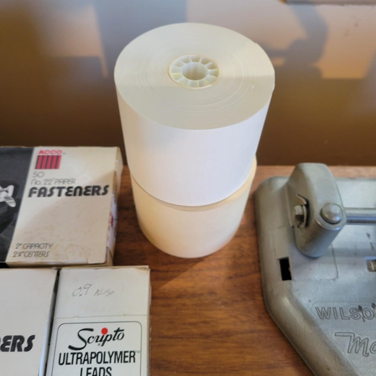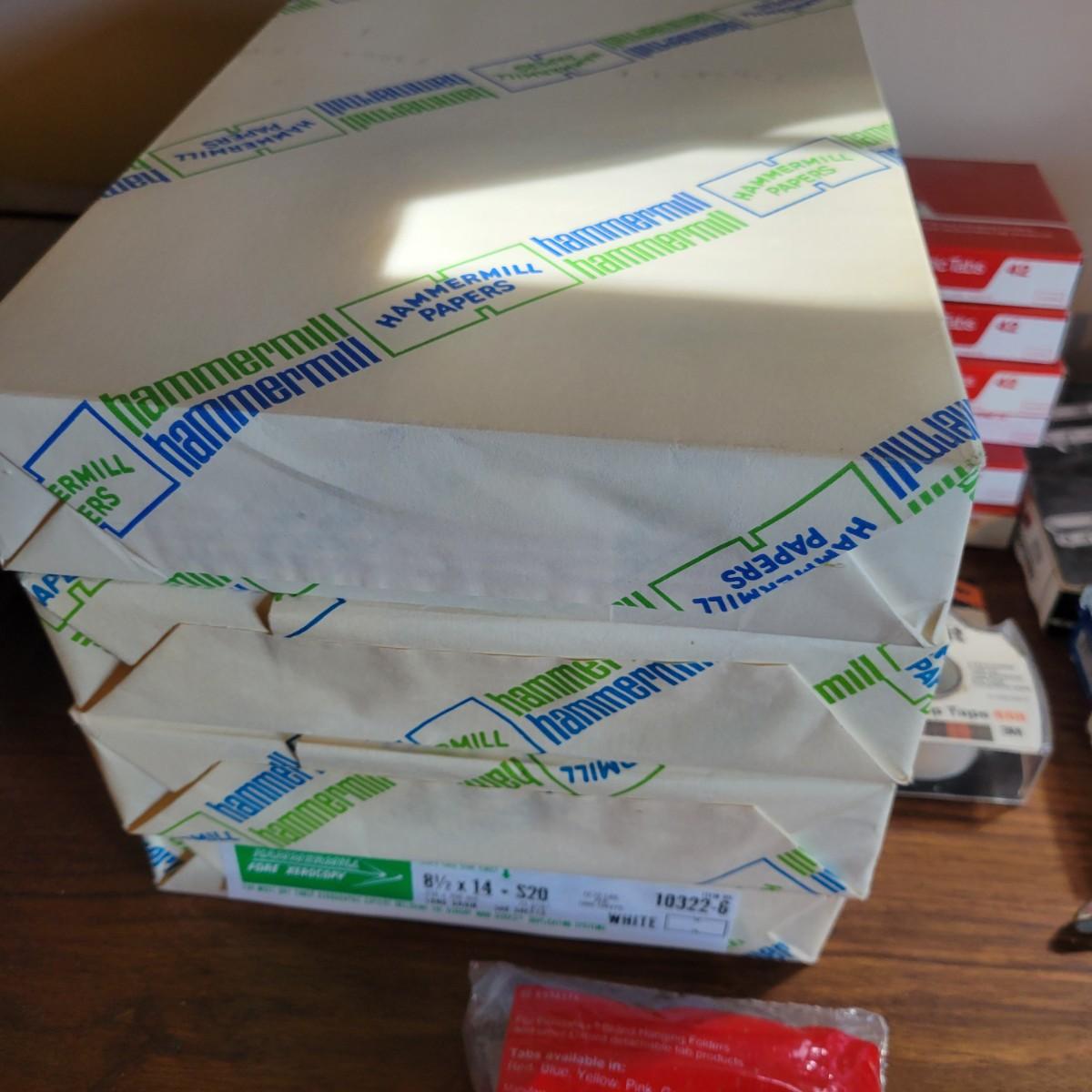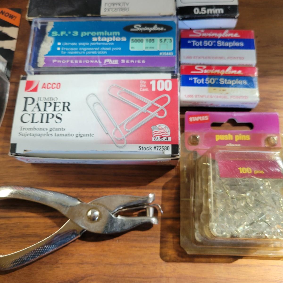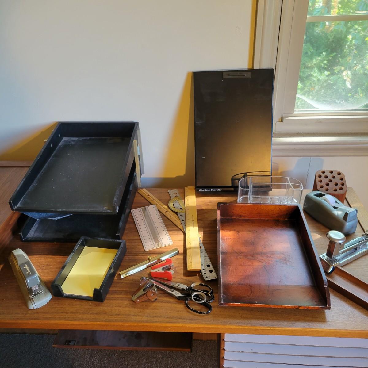 Staplers, cork board, lamps, file folders, reems of paper and so much morein this lotnof office supplies. Most items are in good condition or unused. Includes letter trays, rulers, calculator, adding machine, pens, pen holders. Full inventory included in attached pictures. Cork board measures approximately 36" x 24" and has hanging brackets at the top. Adding machine did not power on. Local pickup only