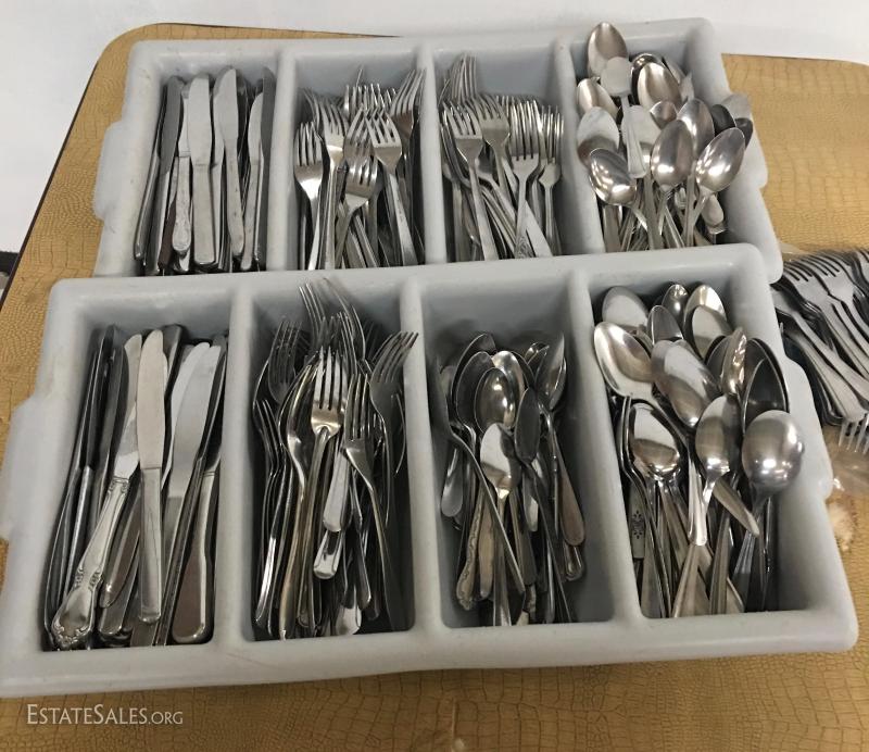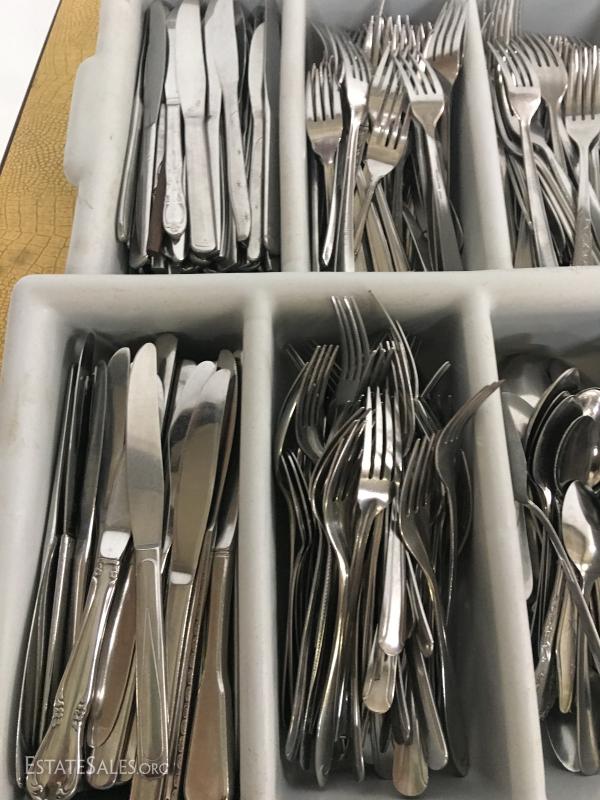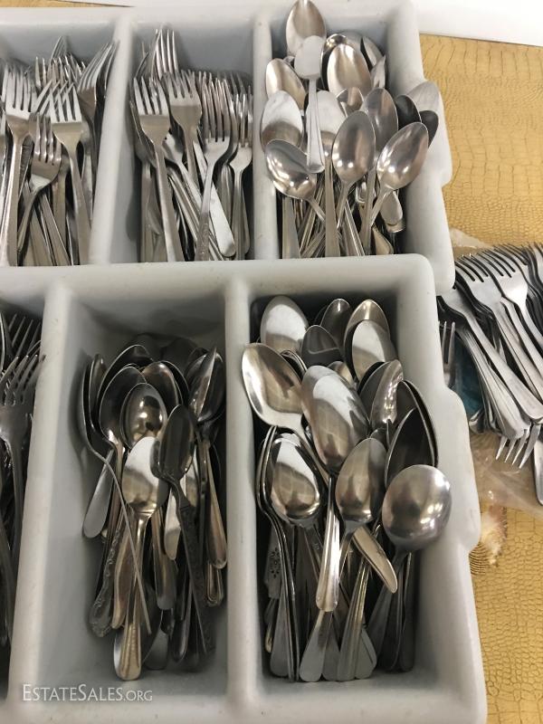 Several hundred pieces of stainless steel restaurant ware. Forks, knives, spoons, salad forks, with storage bins.