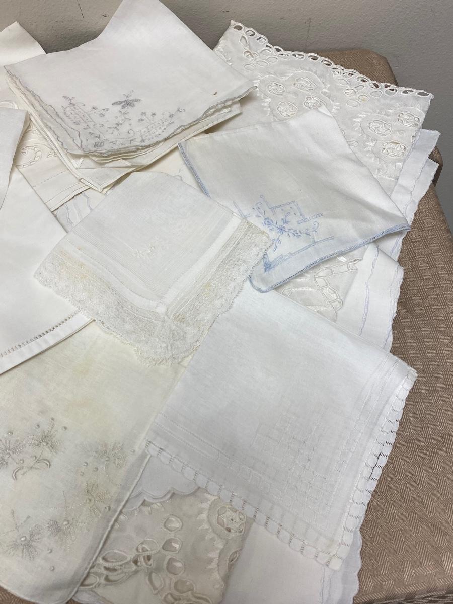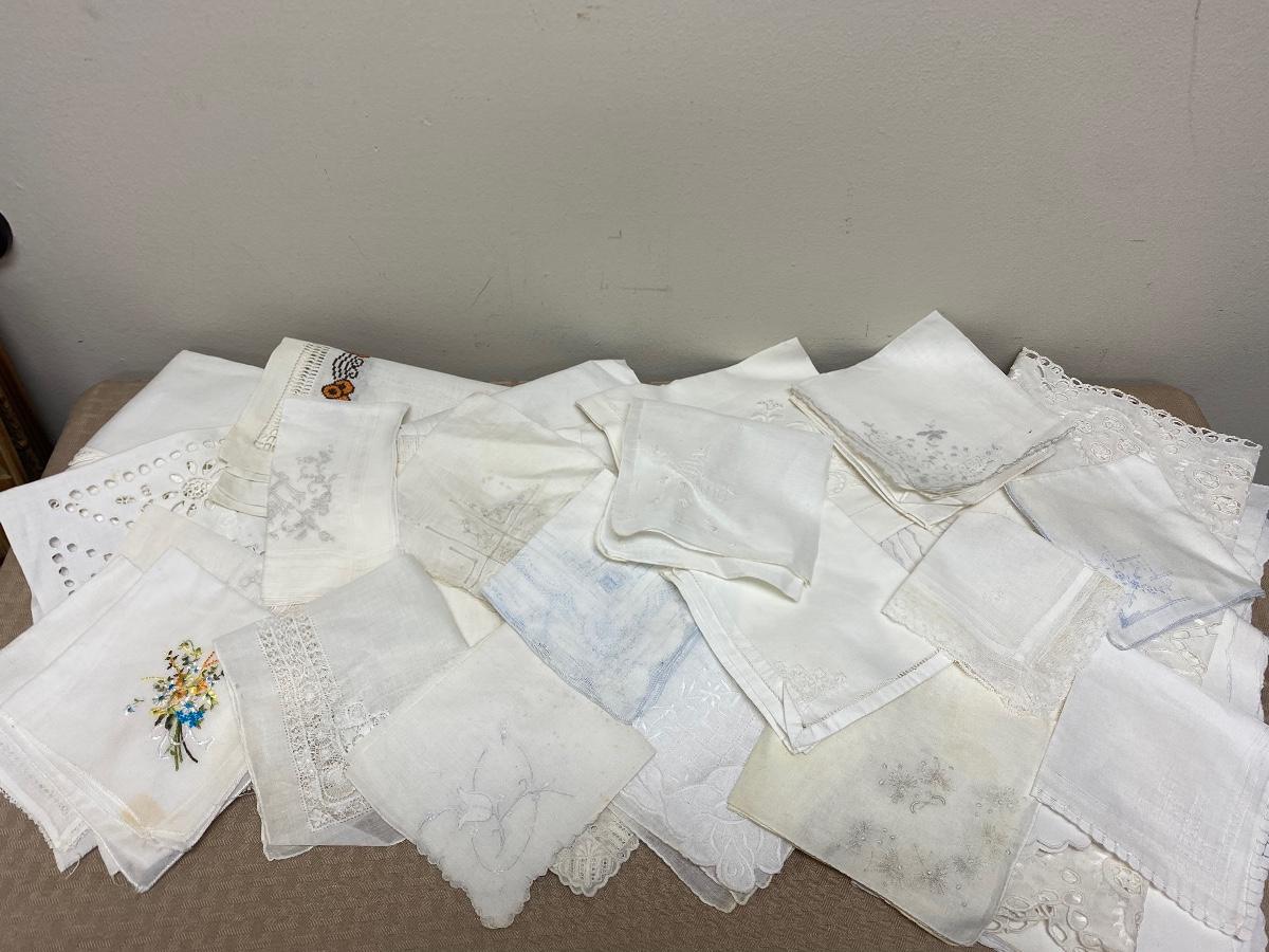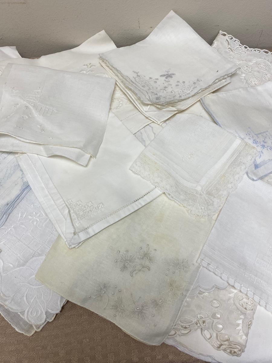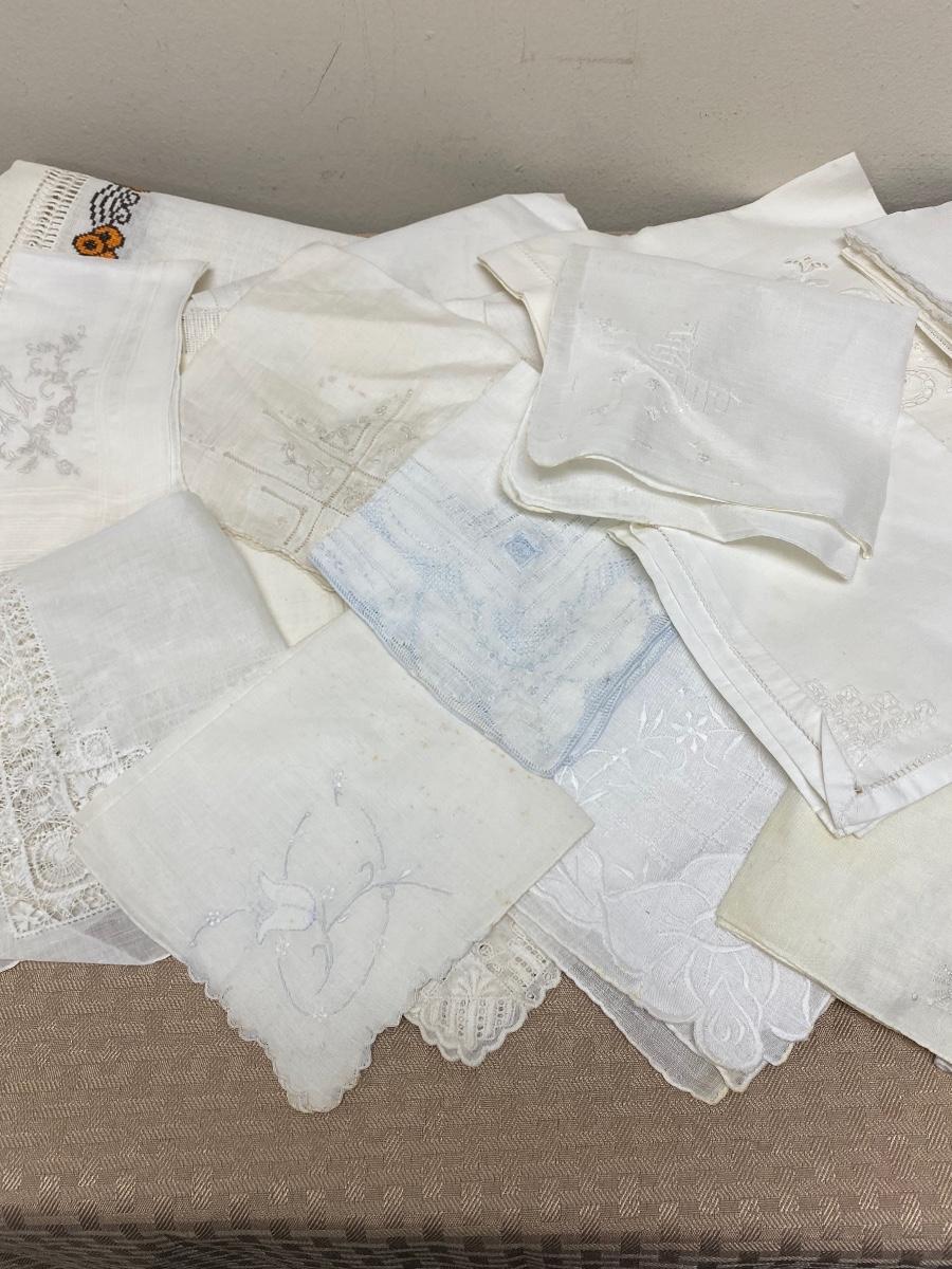 Huge mixed lot of vintage handkerchiefs. White with embroidered details. May have light discolor or spots.