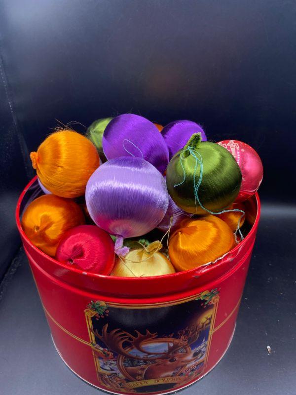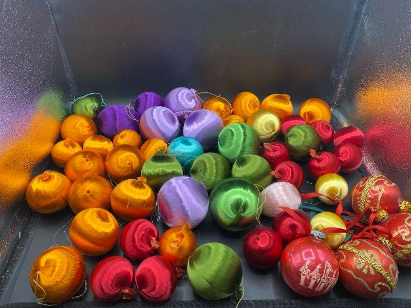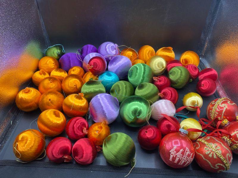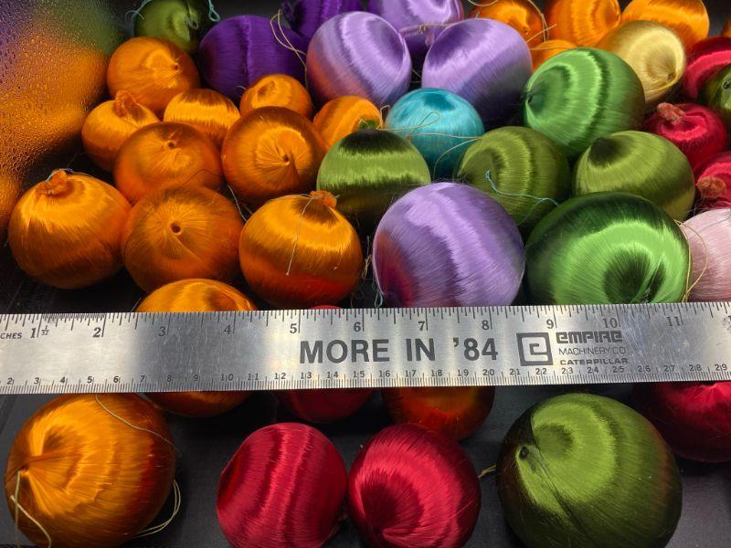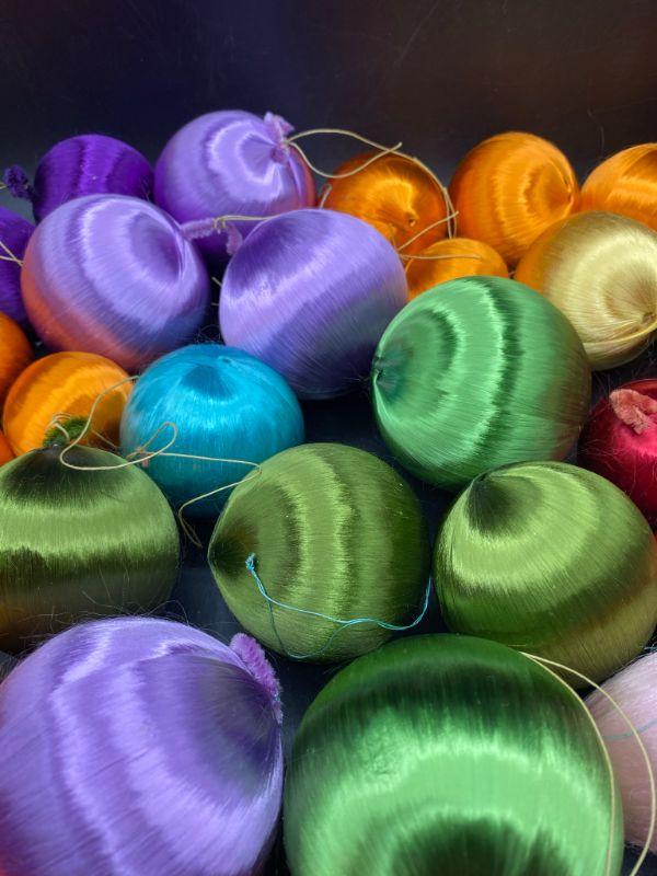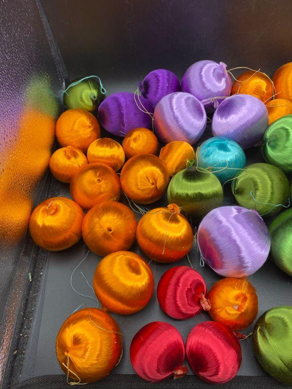 Huge lot of thread ornaments. Wrapped in bright jewel tones. Come with the tin. See photos. There is a couple random glass balls mixed in.