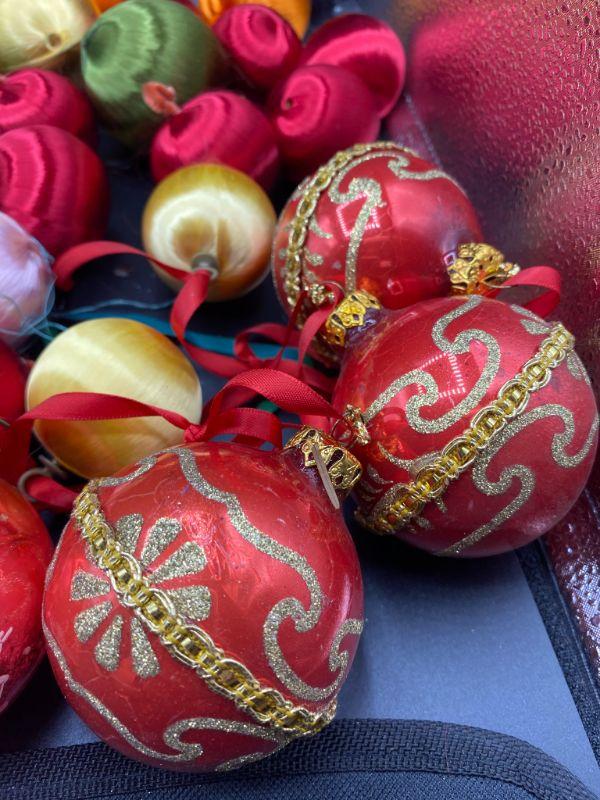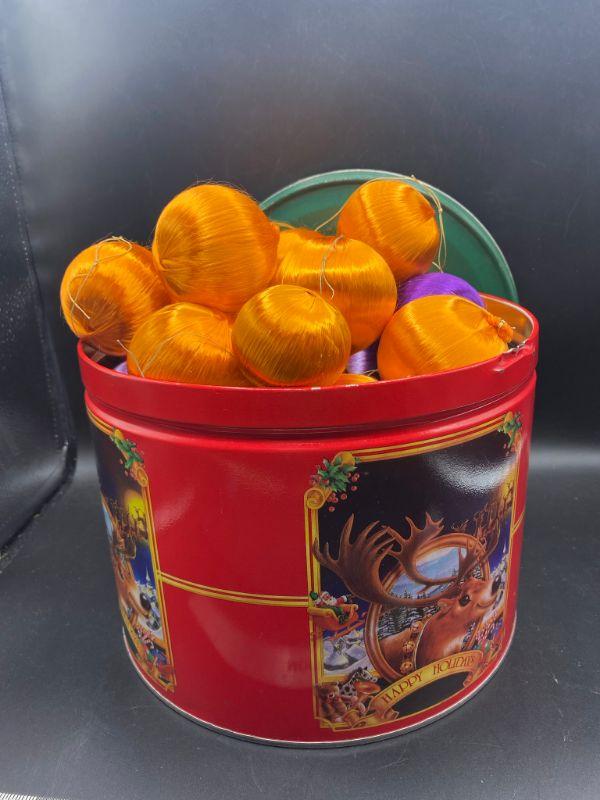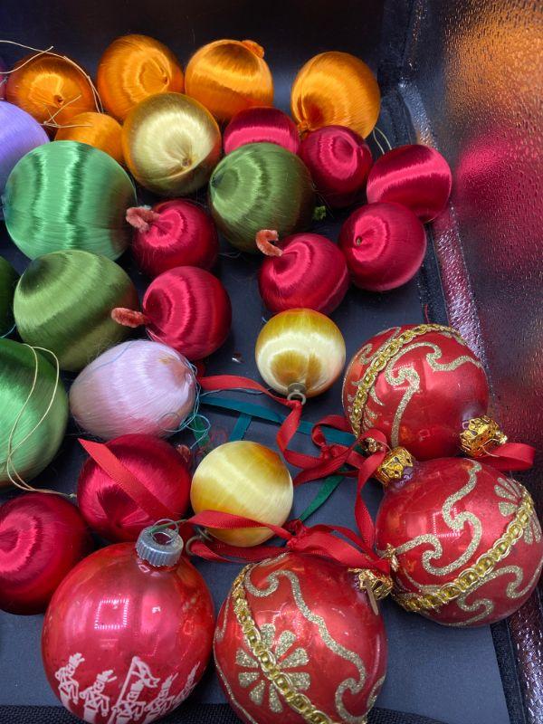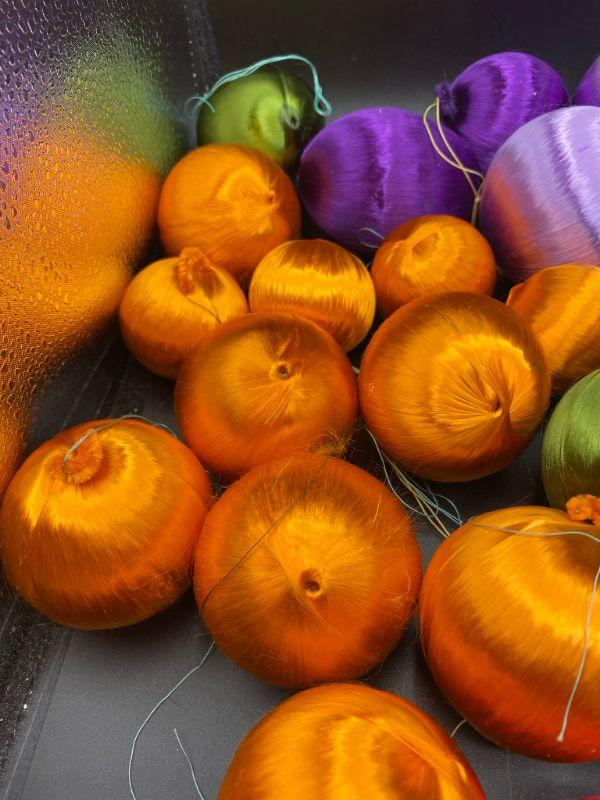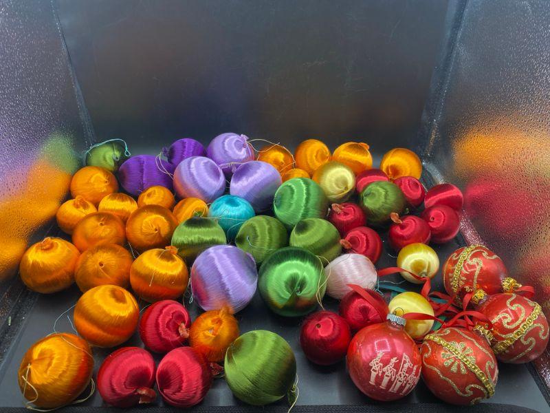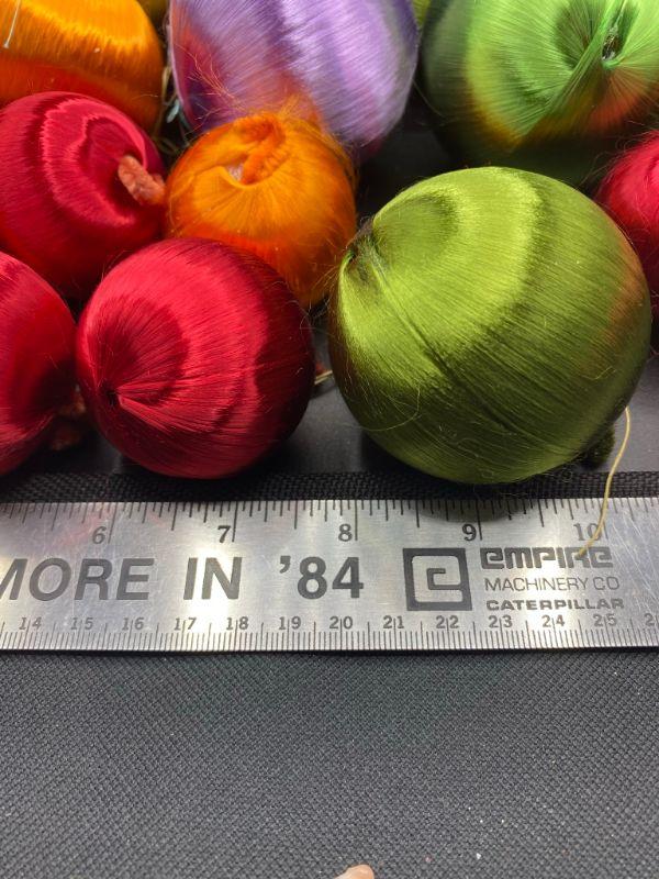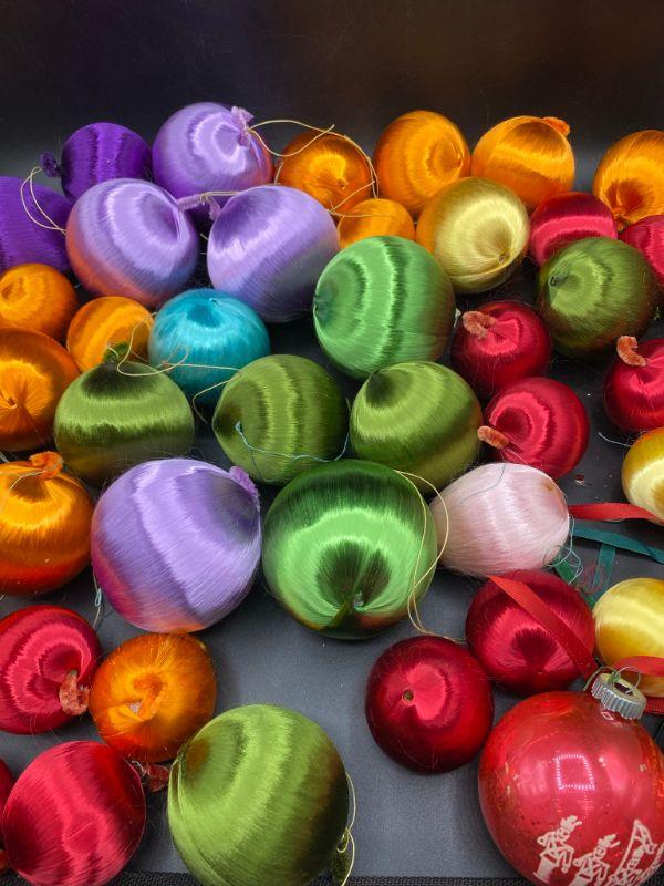 Huge lot of thread ornaments. Wrapped in bright jewel tones. Come with the tin. See photos. There is a couple random glass balls mixed in.