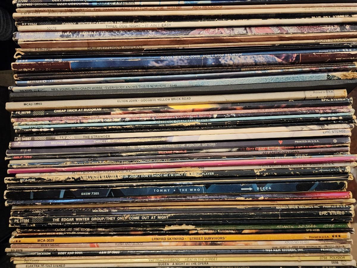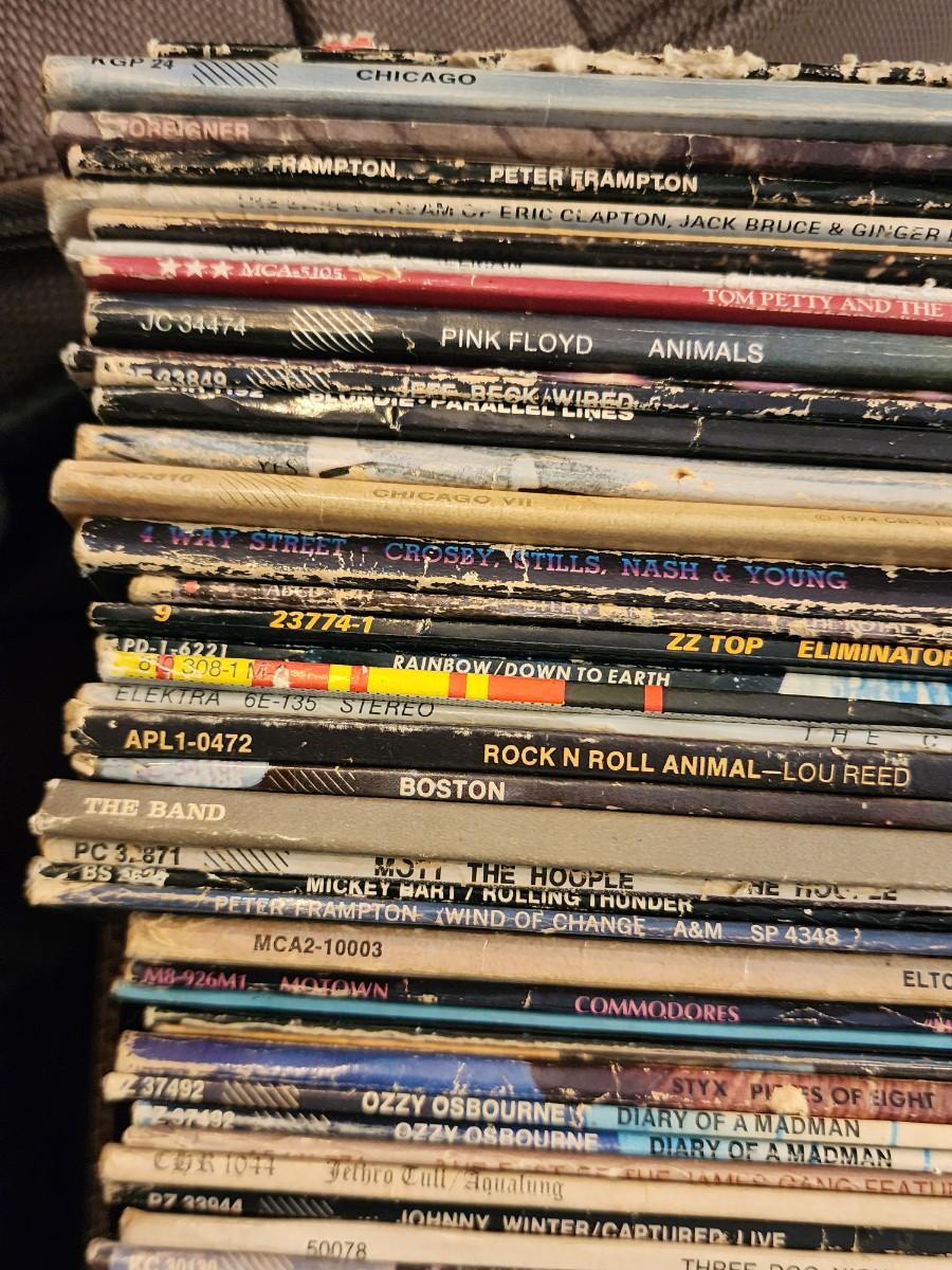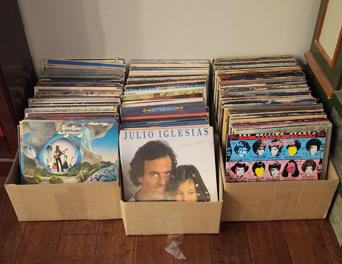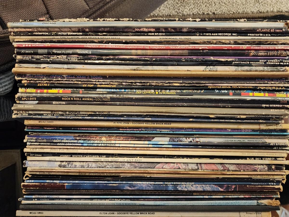 Of the 3 boxes in the first picture, the box on the right (over 150 albums) is all rock & roll. The others are a combination of soft rock and pop and folk music with a very small amount of classical, swing, Christmas, crooner and other "retiree music". We have taken pictures of the spines of the sleeves so you can look more closely at the titles. A cross-section of some of the artists included (not an exhaustive list): Rolling Stones, Elton John, Yes, Crosby Stills & Nash, Neil Young, Fleetwood Mack, Jefferson Airplane, Boston, Foghat, Scorpion, Peter Frampton, Foreigner, Cheap Trick, Ozzy Osbourne, ZZ Top, Michael Jackson, Julio Iglesias, John Denver, Carol King, Olivia Newton-John, Helen Reddy, Barry Manilow, Frank Sinatra. Not pictured, but will be included - a few empty sleeves.