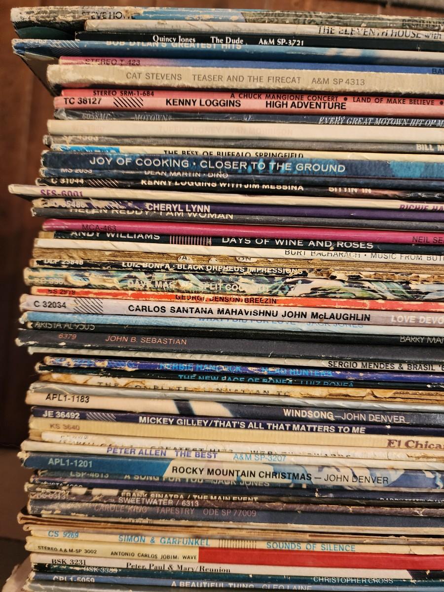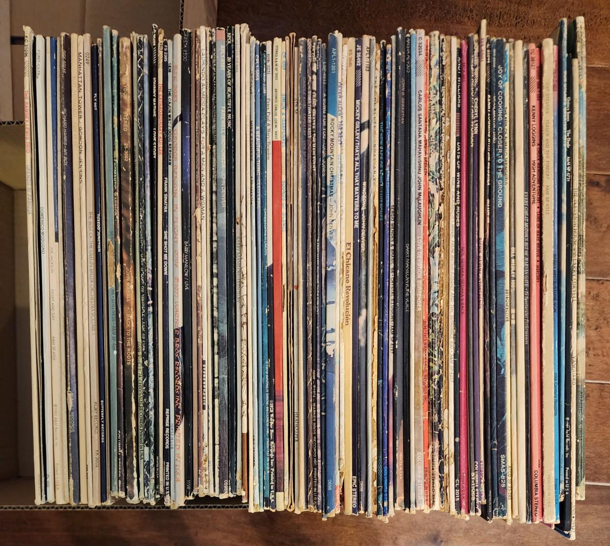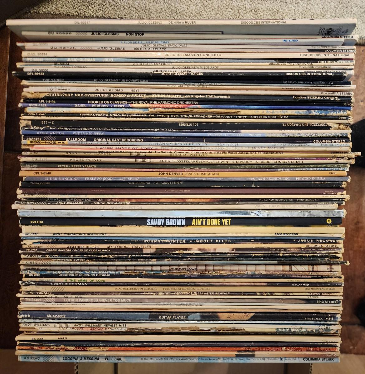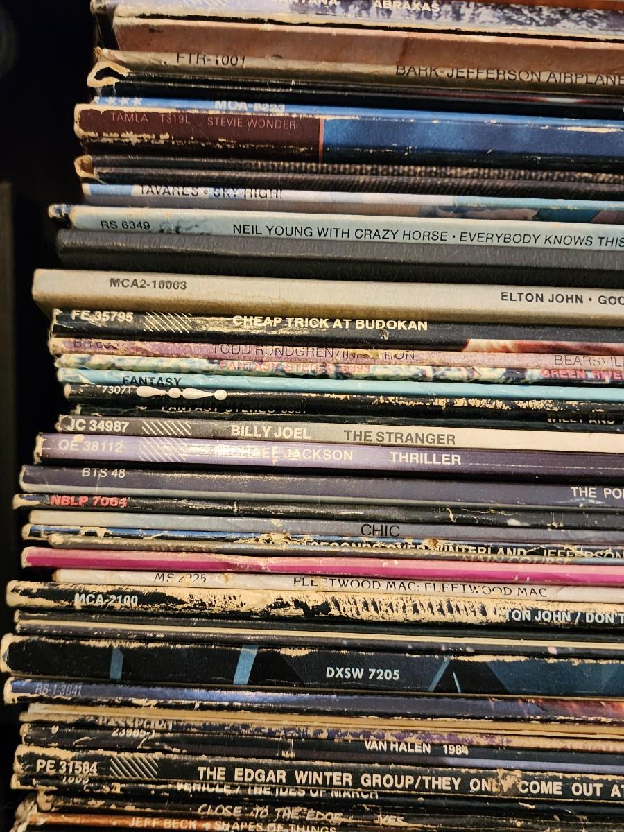 Of the 3 boxes in the first picture, the box on the right (over 150 albums) is all rock & roll. The others are a combination of soft rock and pop and folk music with a very small amount of classical, swing, Christmas, crooner and other "retiree music". We have taken pictures of the spines of the sleeves so you can look more closely at the titles. A cross-section of some of the artists included (not an exhaustive list): Rolling Stones, Elton John, Yes, Crosby Stills & Nash, Neil Young, Fleetwood Mack, Jefferson Airplane, Boston, Foghat, Scorpion, Peter Frampton, Foreigner, Cheap Trick, Ozzy Osbourne, ZZ Top, Michael Jackson, Julio Iglesias, John Denver, Carol King, Olivia Newton-John, Helen Reddy, Barry Manilow, Frank Sinatra. Not pictured, but will be included - a few empty sleeves.