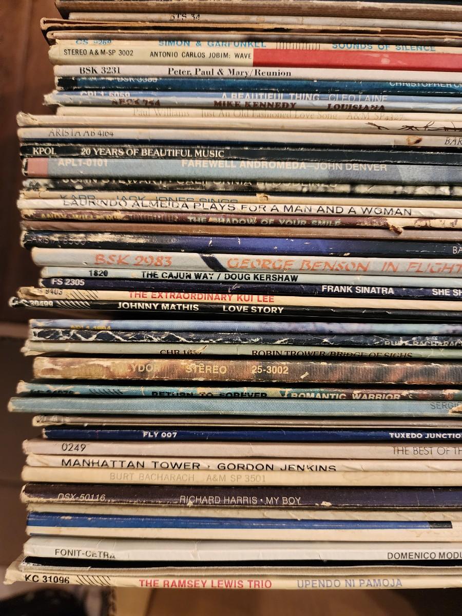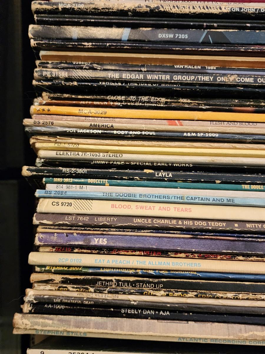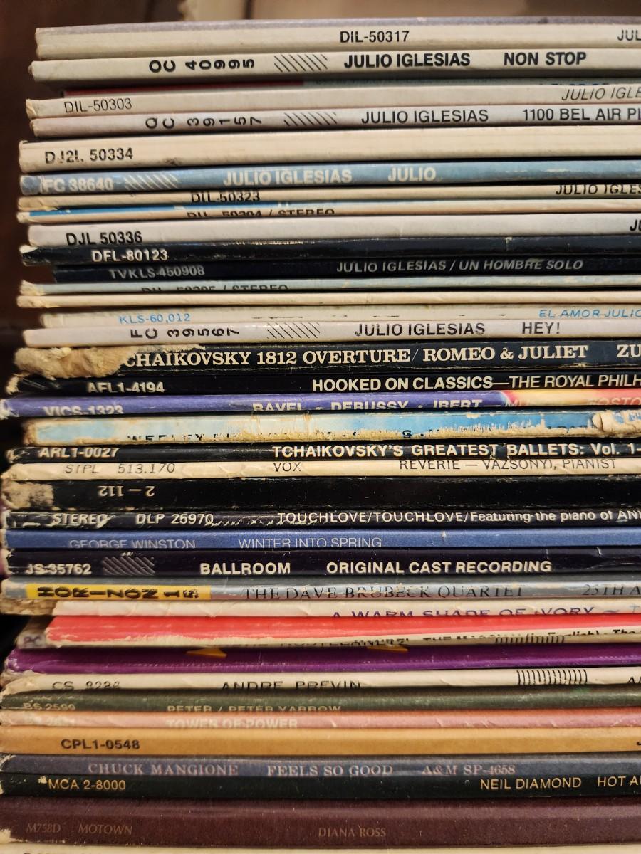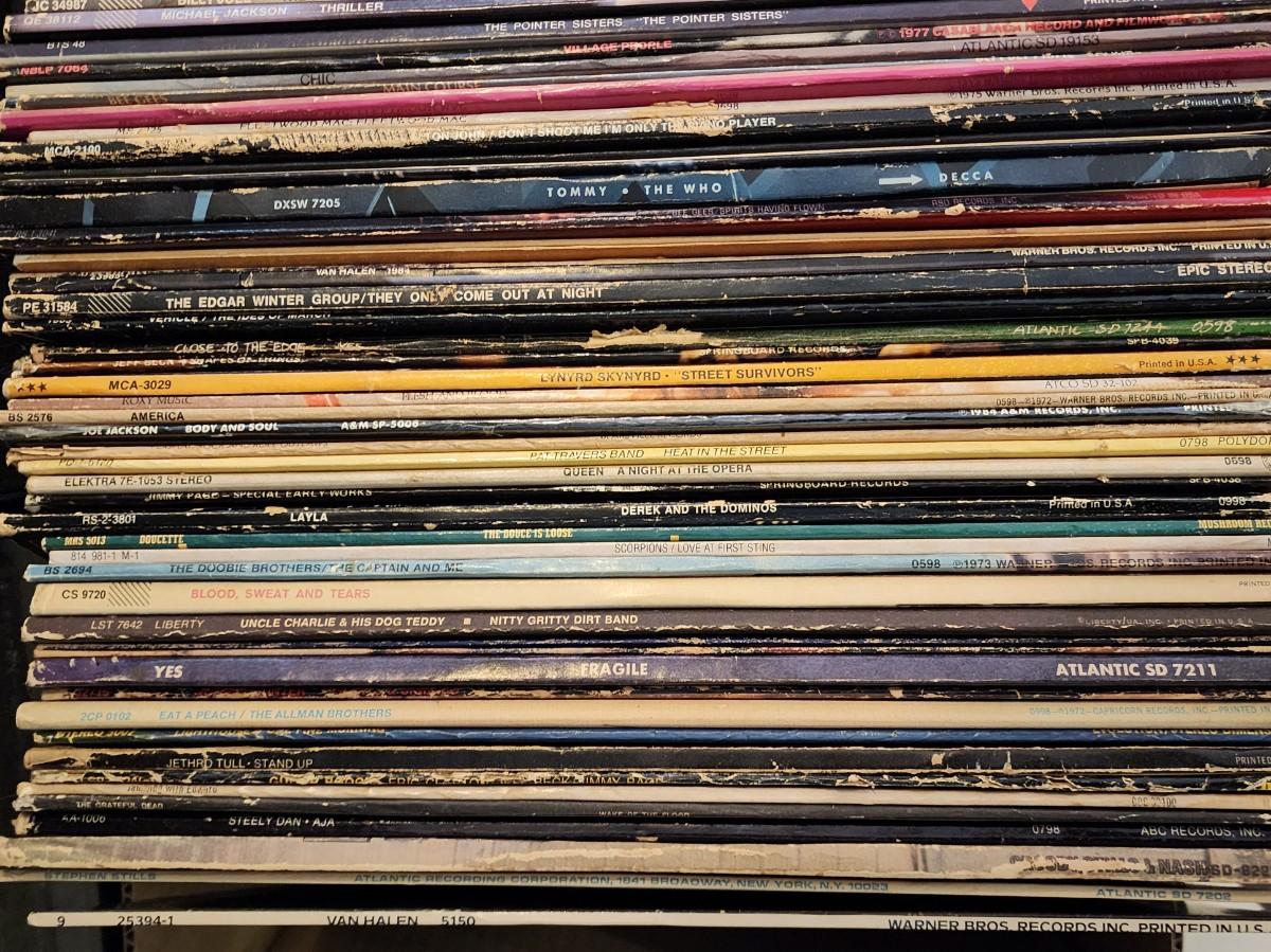 Of the 3 boxes in the first picture, the box on the right (over 150 albums) is all rock & roll. The others are a combination of soft rock and pop and folk music with a very small amount of classical, swing, Christmas, crooner and other "retiree music". We have taken pictures of the spines of the sleeves so you can look more closely at the titles. A cross-section of some of the artists included (not an exhaustive list): Rolling Stones, Elton John, Yes, Crosby Stills & Nash, Neil Young, Fleetwood Mack, Jefferson Airplane, Boston, Foghat, Scorpion, Peter Frampton, Foreigner, Cheap Trick, Ozzy Osbourne, ZZ Top, Michael Jackson, Julio Iglesias, John Denver, Carol King, Olivia Newton-John, Helen Reddy, Barry Manilow, Frank Sinatra. Not pictured, but will be included - a few empty sleeves.