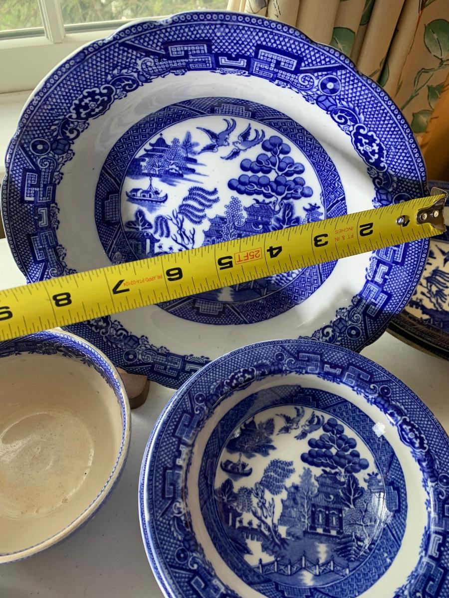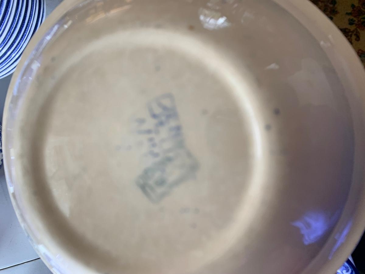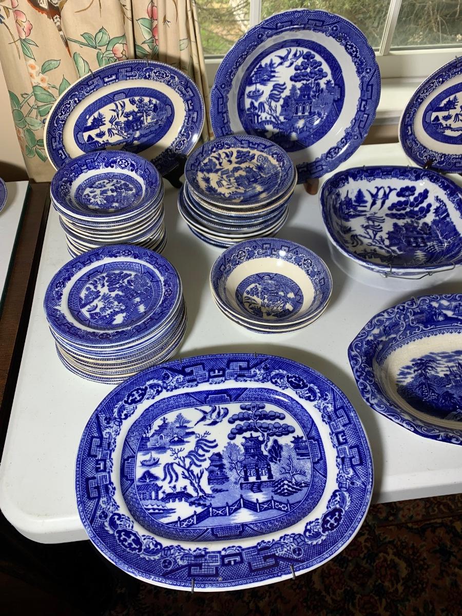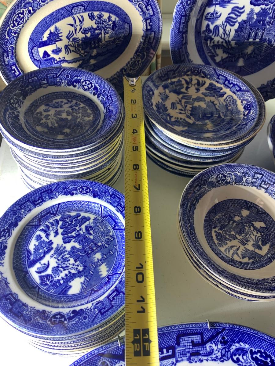 HUGE LOT - Approx 80 pieces of vintage flow blue pieces. Mix of several makers - some may have minor flaws. See MANY PHOTOS for details. Buying as is as found in this wonderful, old estate packed with antiques & collectibles. See many photos for content, condition, and measurements.