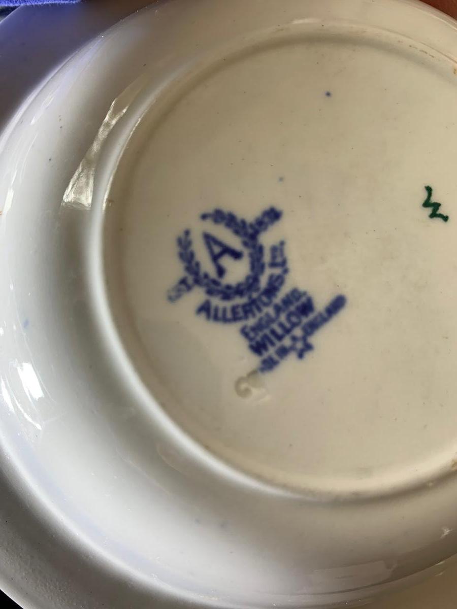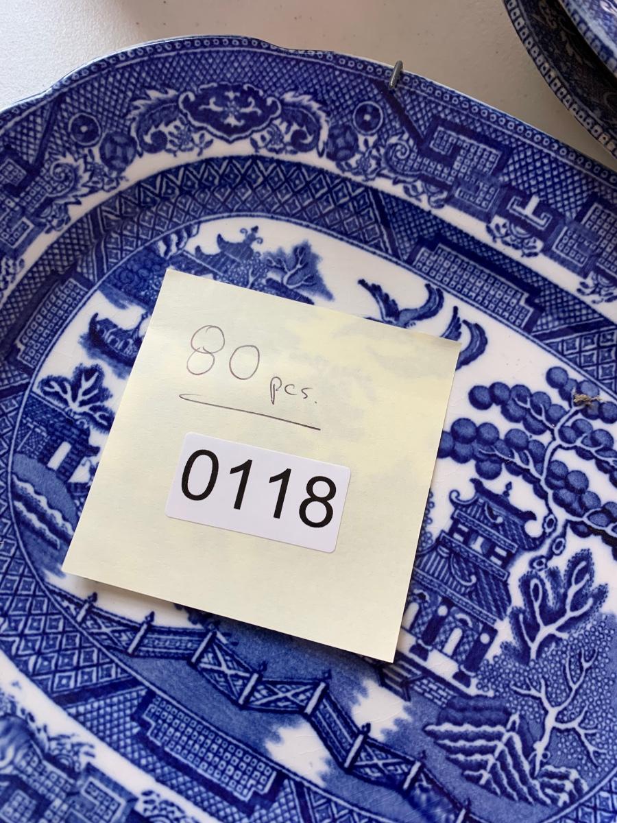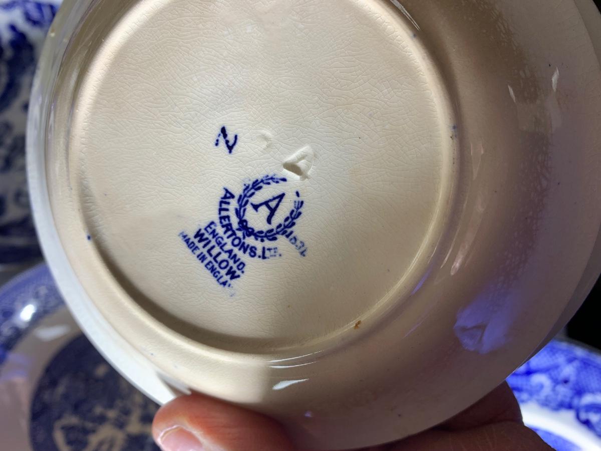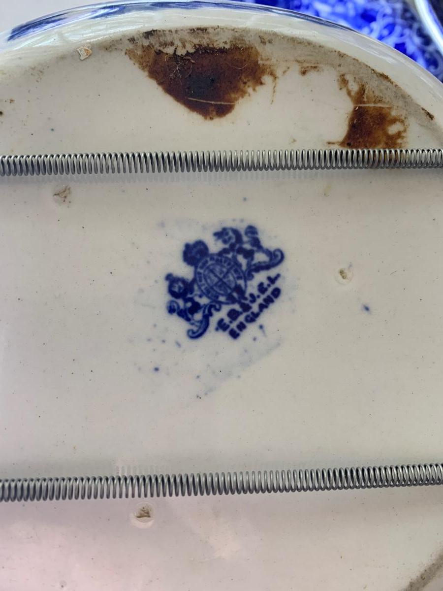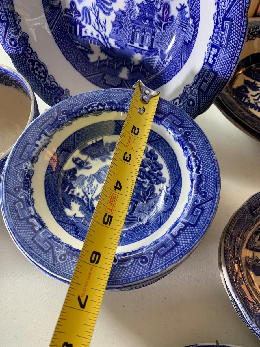 HUGE LOT - Approx 80 pieces of vintage flow blue pieces. Mix of several makers - some may have minor flaws. See MANY PHOTOS for details. Buying as is as found in this wonderful, old estate packed with antiques & collectibles. See many photos for content, condition, and measurements.