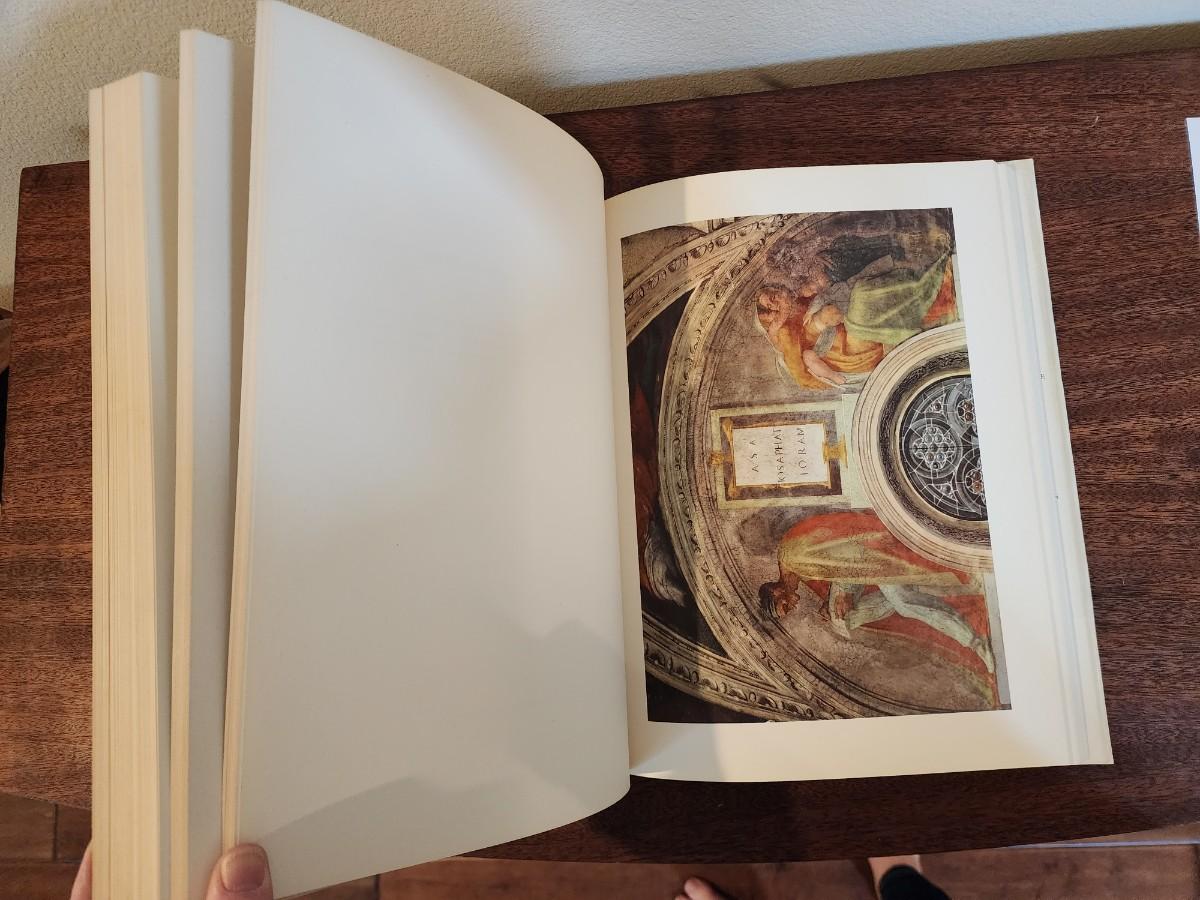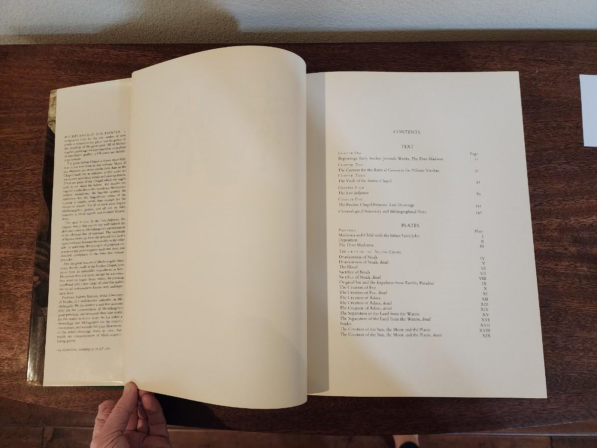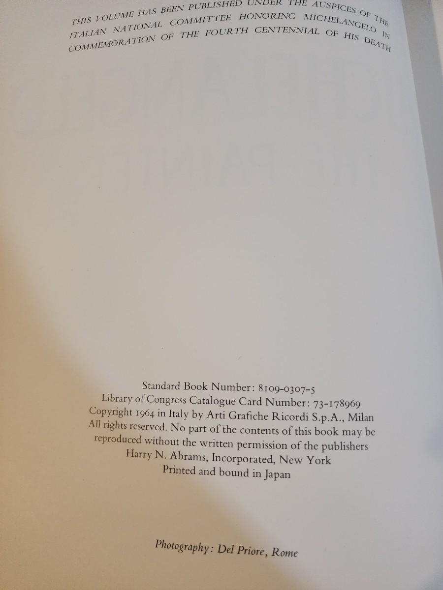 Michelangelo the Painter 14" x 11" coffee table book. Near fine condition in near fine dust jacket. "Christmas 1976" written in pen in flyleaf. 109 illustrations, including 95 in full color. Harry N. Abrams, Inc., publisher. Accompanying text by professor Valerio Mariani.