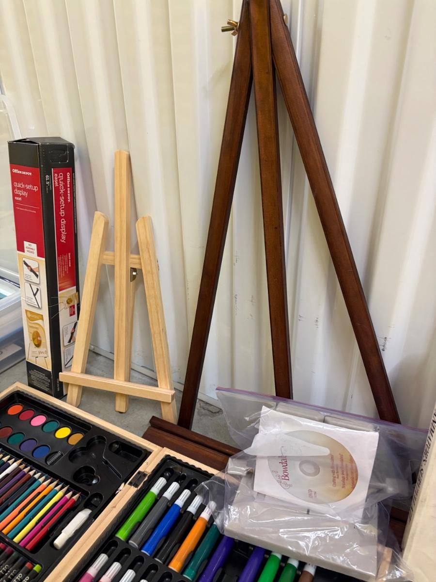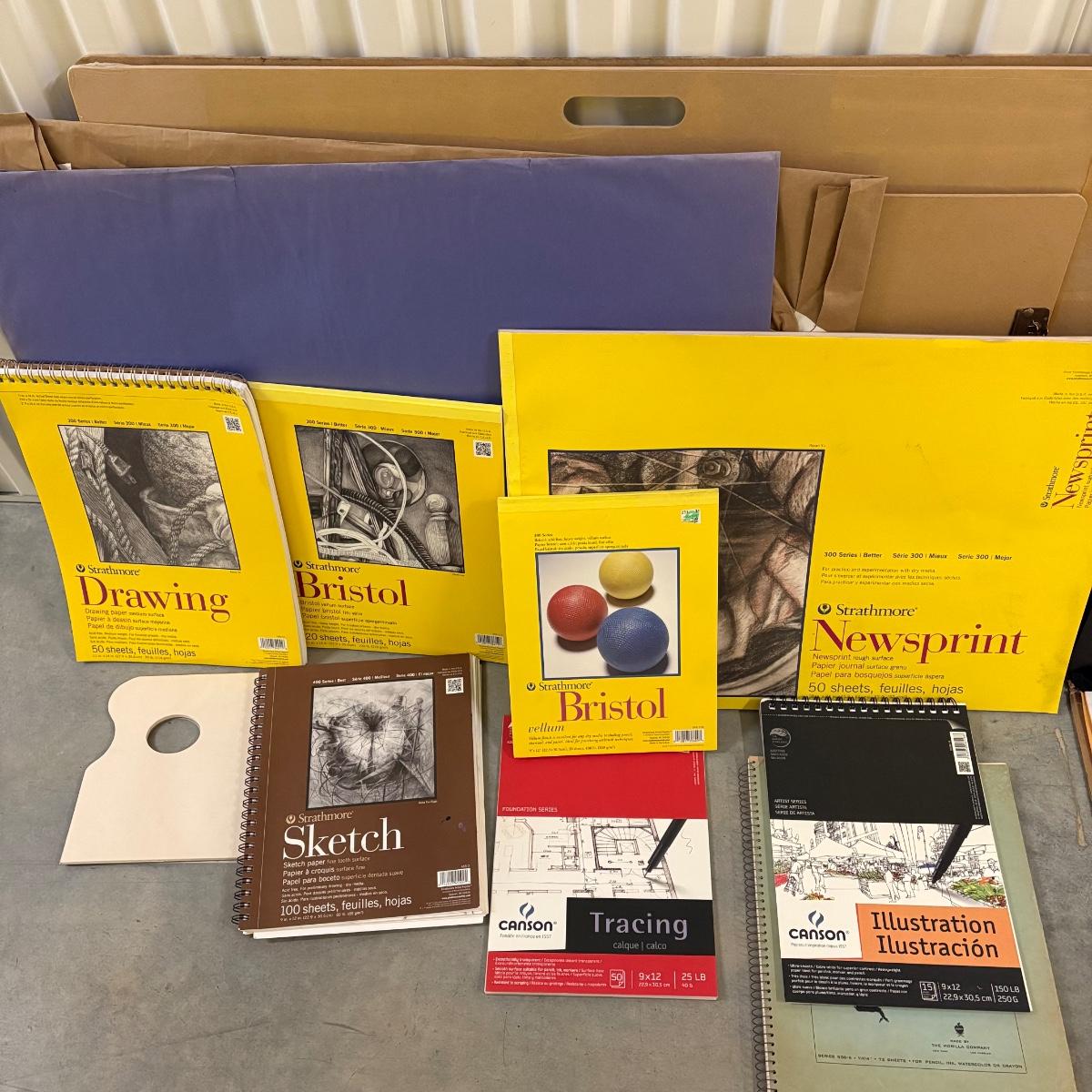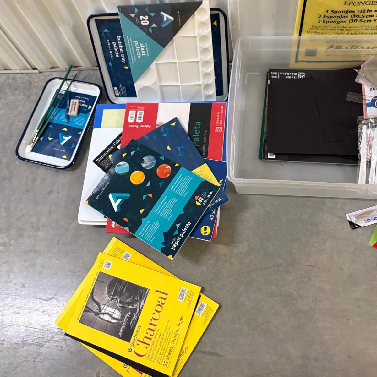 New lots of watercolor paper (30”x 23”), paper & tablets for drawing, illustration & more. Foam core pieces, cardstock. Paper/pads are almost completely new or unused. Large (38” x 26”) & medium (24.5 x 22”) format drawing boards. Clean & sturdy storage boxes with pencils, charcoal, acrylic paints, glue and staple guns, brushes and more! Drawing books, kids’ art/ school supplies, palettes for many media, new paint cups, craft knives & blades. Office supplies. Because of the size of this lot there is not one photo to show all, but all items pictured are included. Most items are like new and appear unused, while a few have been opened and used. We cannot guarantee the quality of any open pens, paints or other supplies.