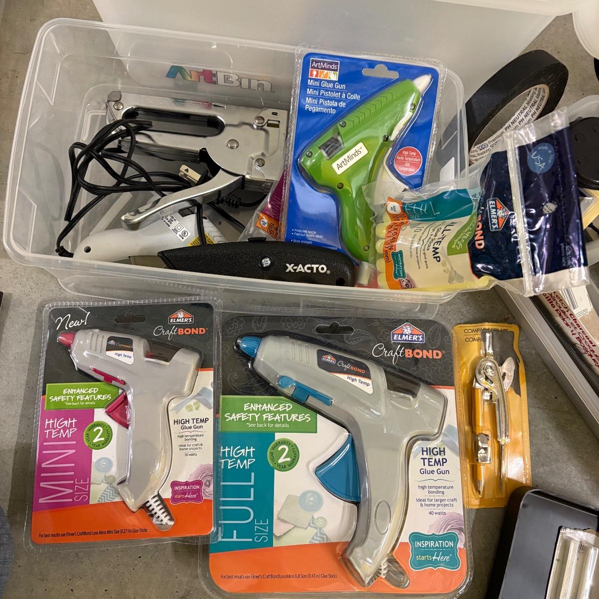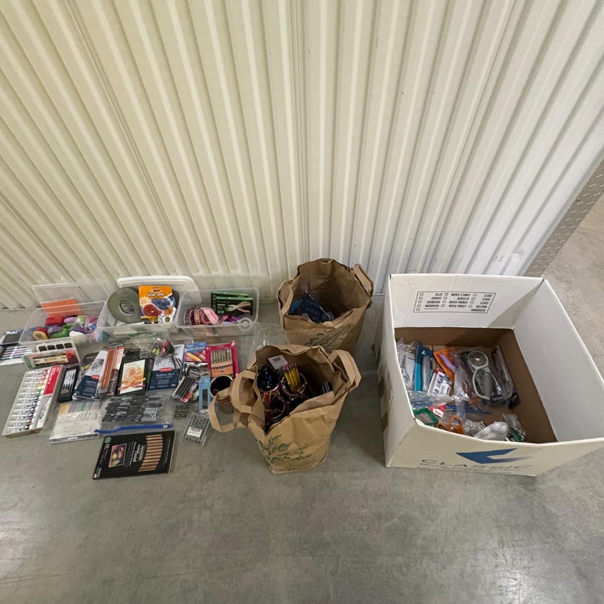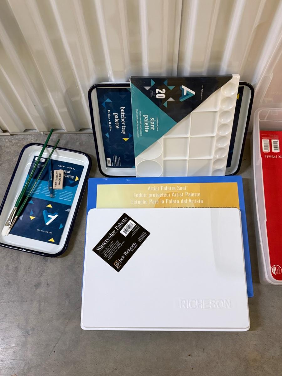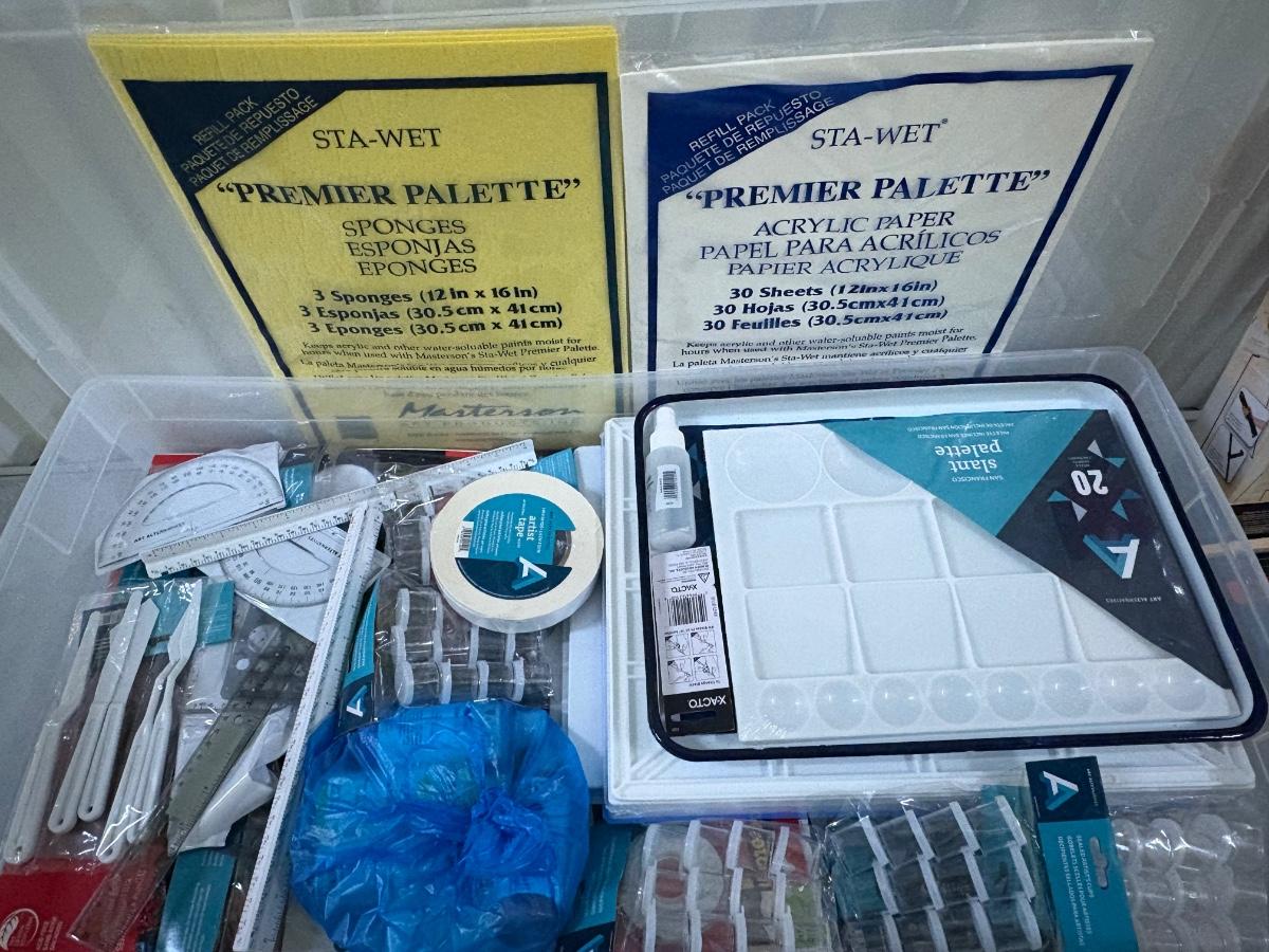 New lots of watercolor paper (30”x 23”), paper & tablets for drawing, illustration & more. Foam core pieces, cardstock. Paper/pads are almost completely new or unused. Large (38” x 26”) & medium (24.5 x 22”) format drawing boards. Clean & sturdy storage boxes with pencils, charcoal, acrylic paints, glue and staple guns, brushes and more! Drawing books, kids’ art/ school supplies, palettes for many media, new paint cups, craft knives & blades. Office supplies. Because of the size of this lot there is not one photo to show all, but all items pictured are included. Most items are like new and appear unused, while a few have been opened and used. We cannot guarantee the quality of any open pens, paints or other supplies.