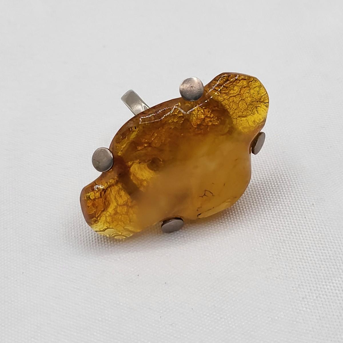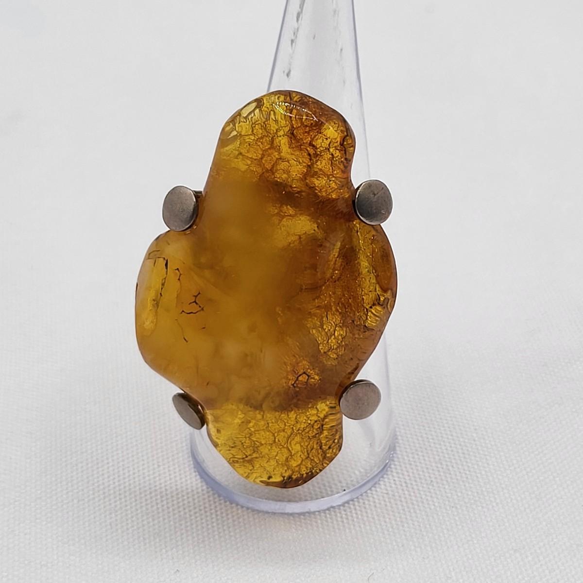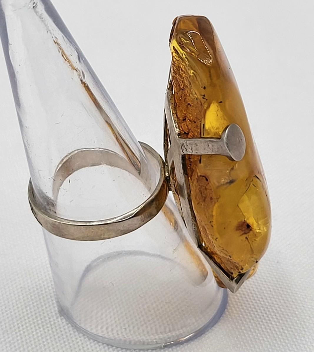 Huge natural freeform artisan amber ring, unique handmade 925 setting and prongs. Amber measures 1" x 1.75". Size 5.75. Weighs 9.76 grams.