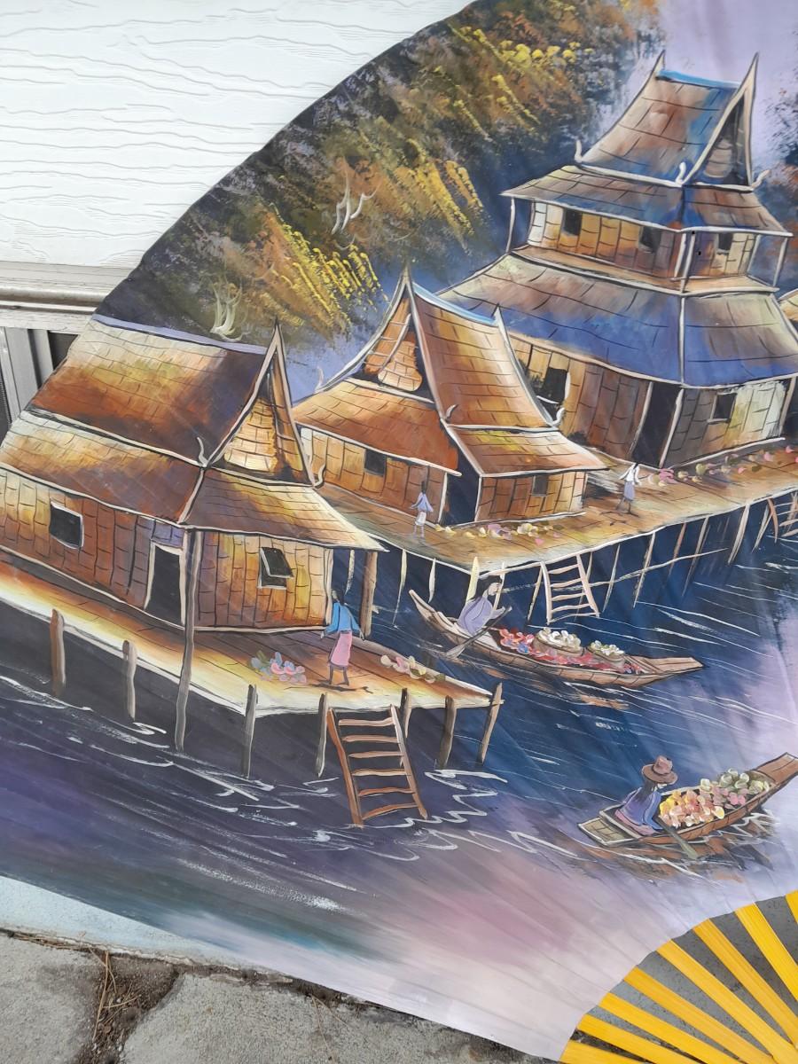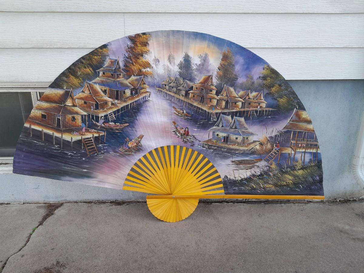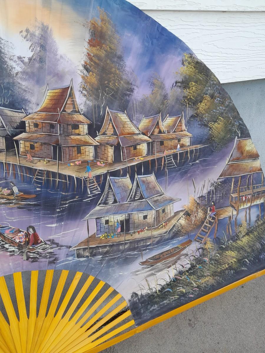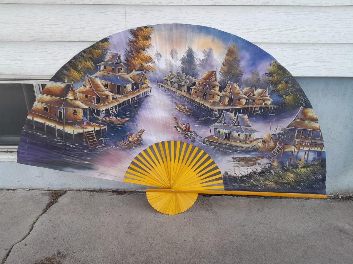 HUGE ORIENTAL VILLAGE WALL FAN DECORATION APPROX. 50" X 82"