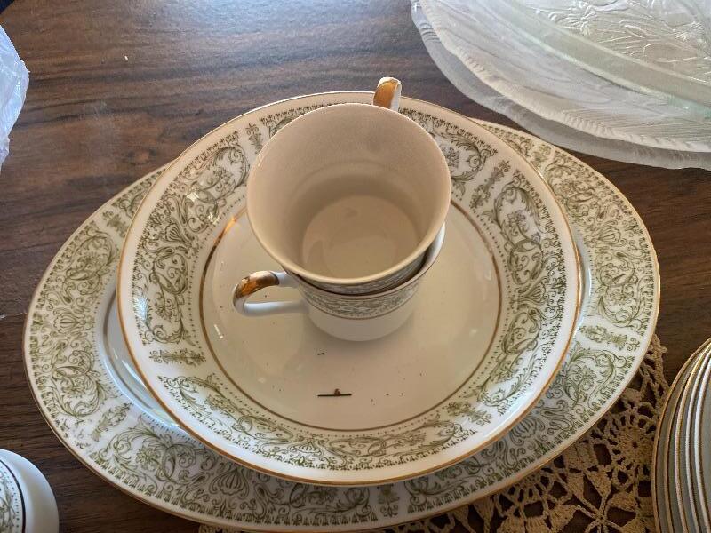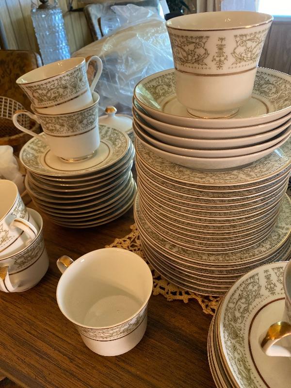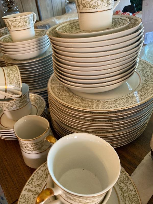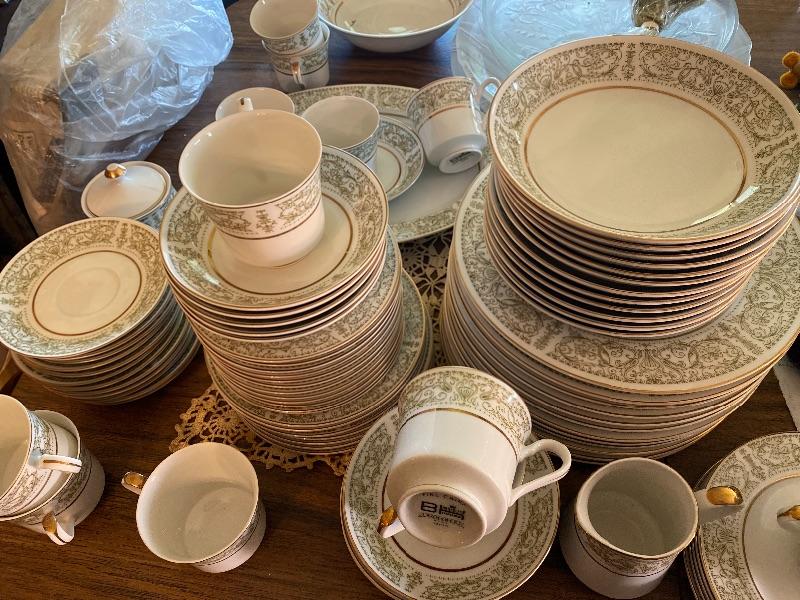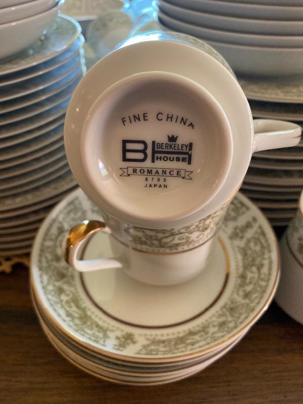 Huge set of Berkeley House China in Romance pattern. Dinner plate, bread plate, cup and saucer, fruit bowl, soup bowl. Comes with platter, serving bowl, cream and sugar. Looks like a set for 12.