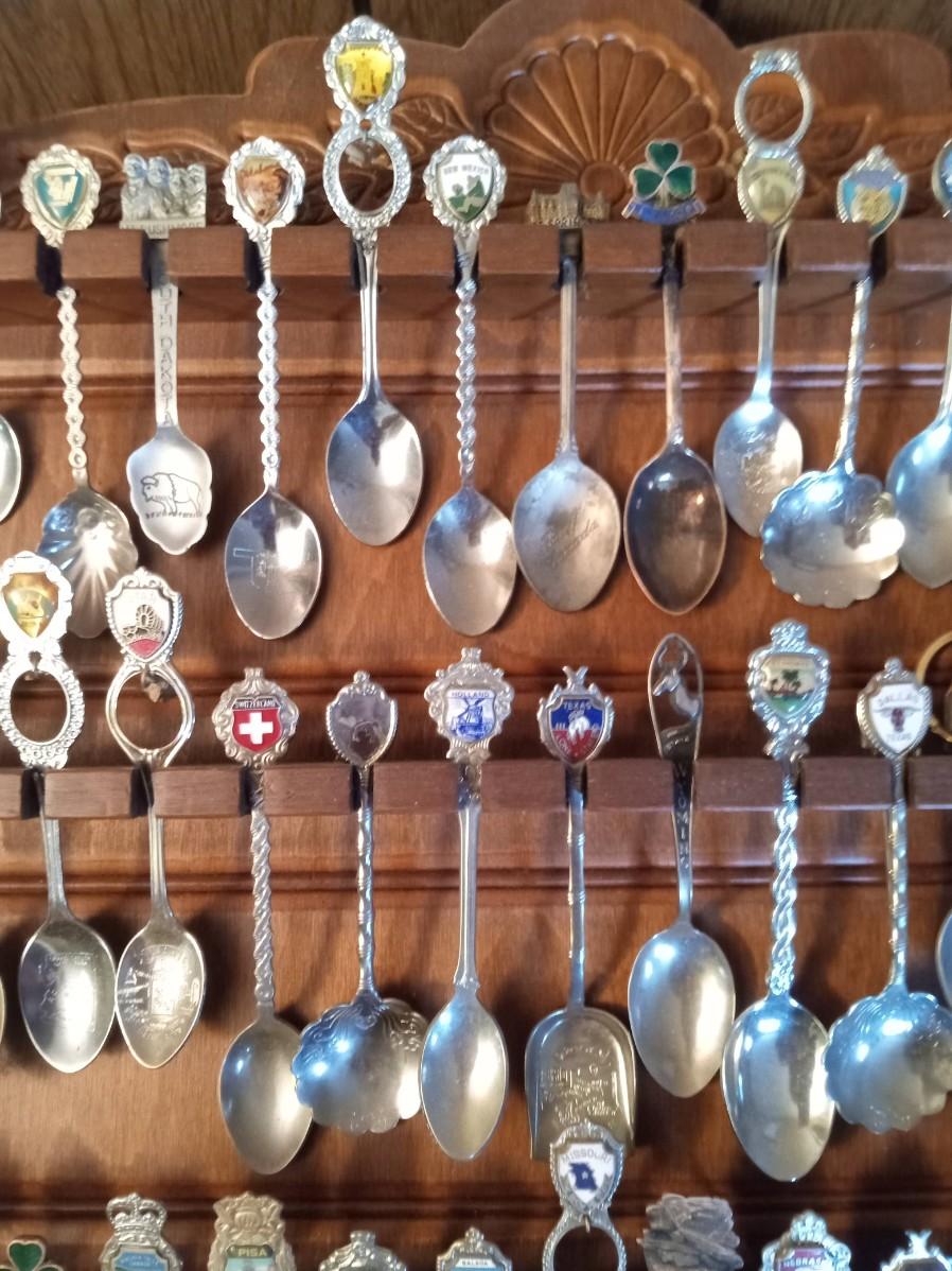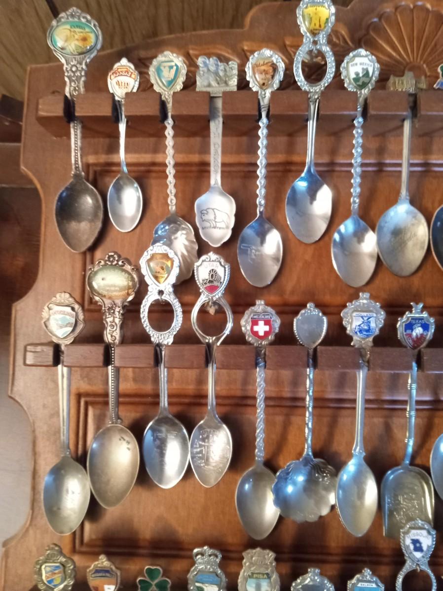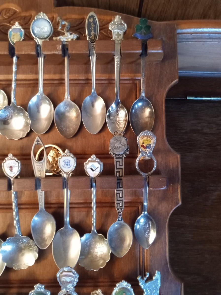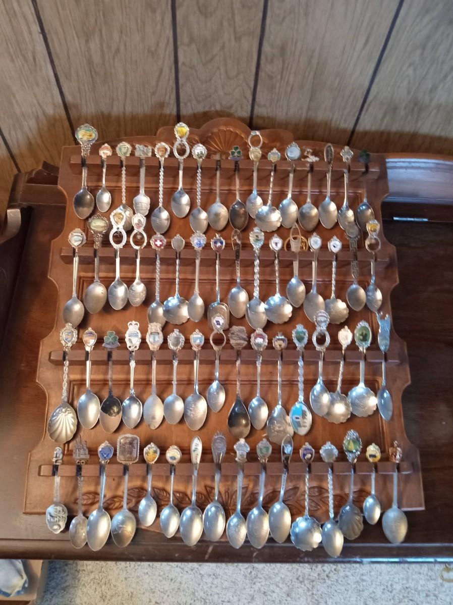 HUGE SPOON COLLECTION ON A WALL MOUNTED STAND