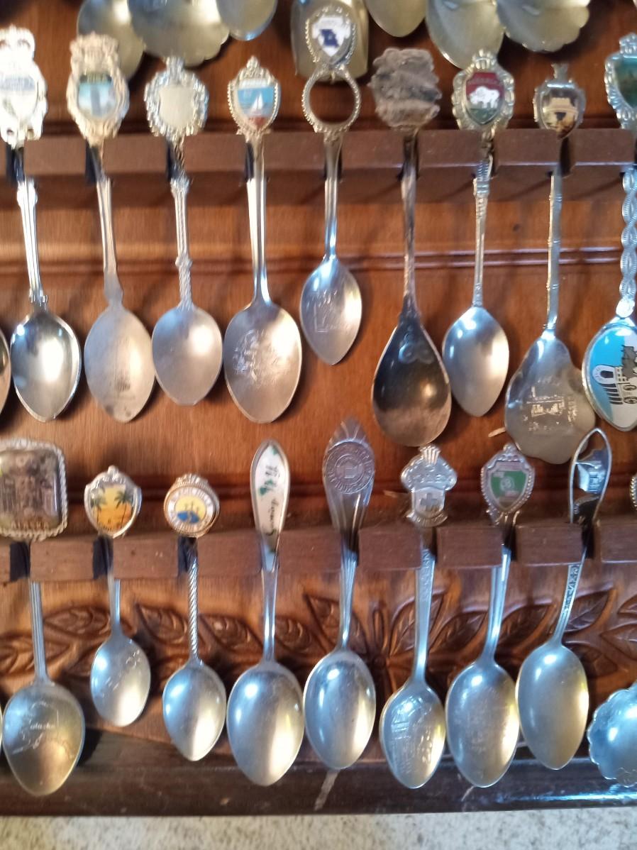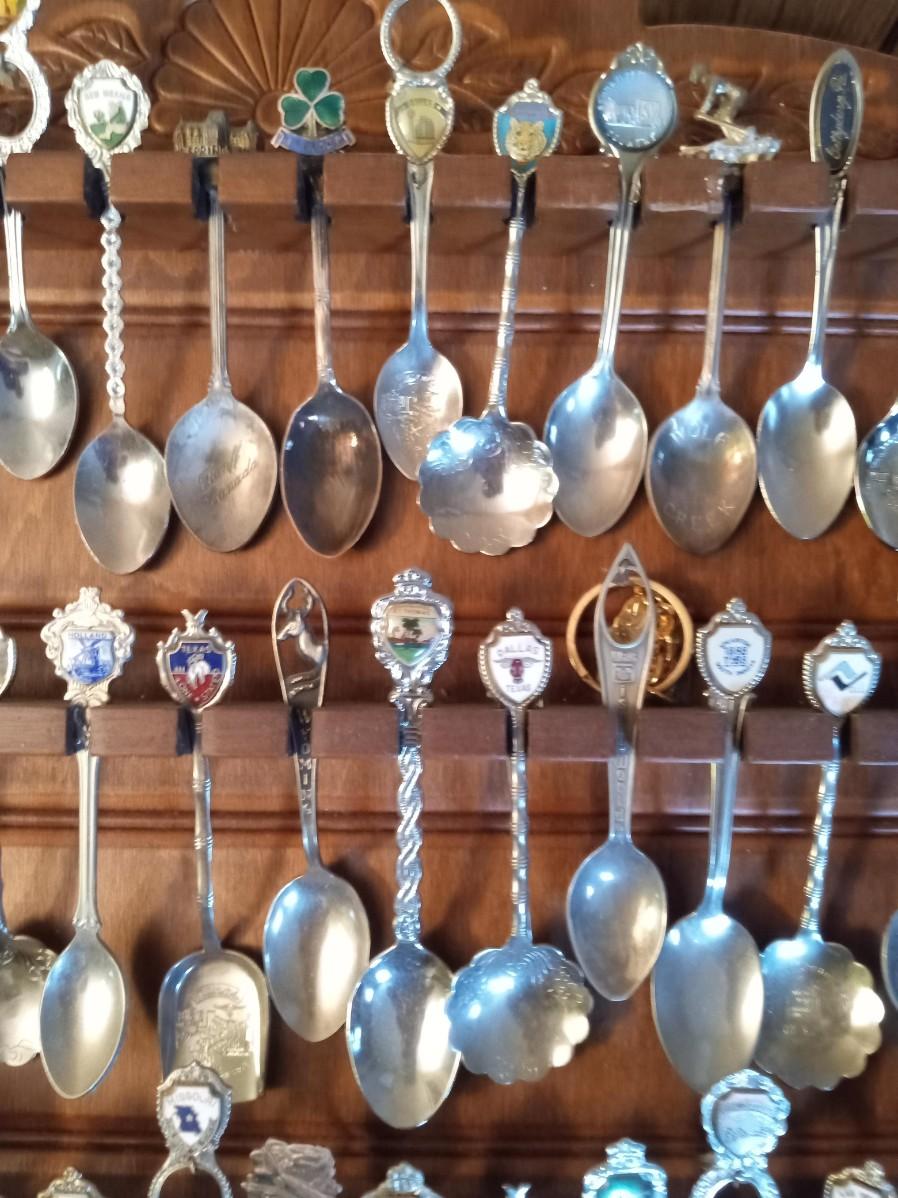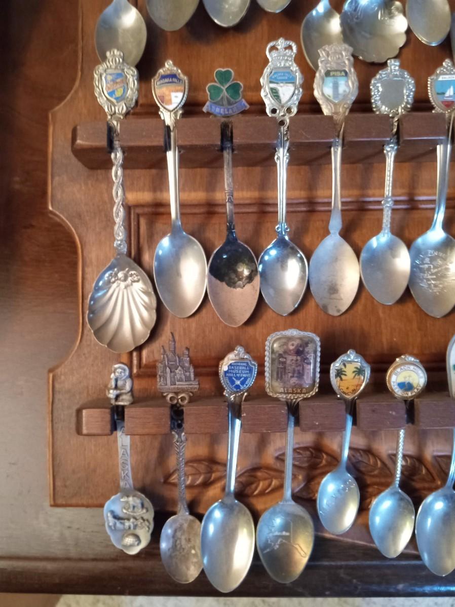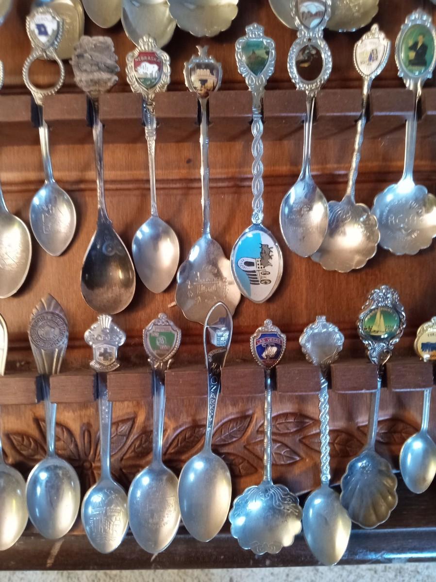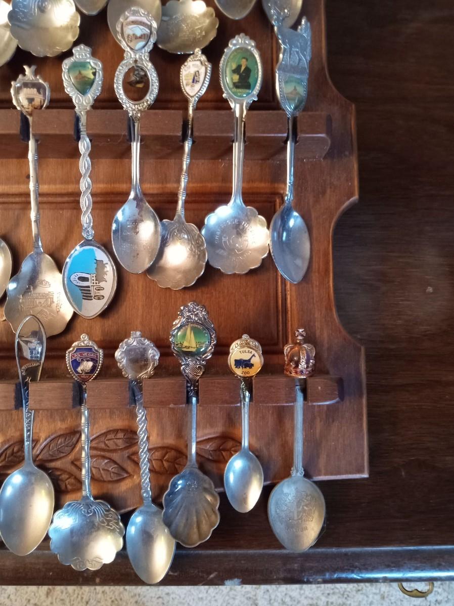 HUGE SPOON COLLECTION ON A WALL MOUNTED STAND