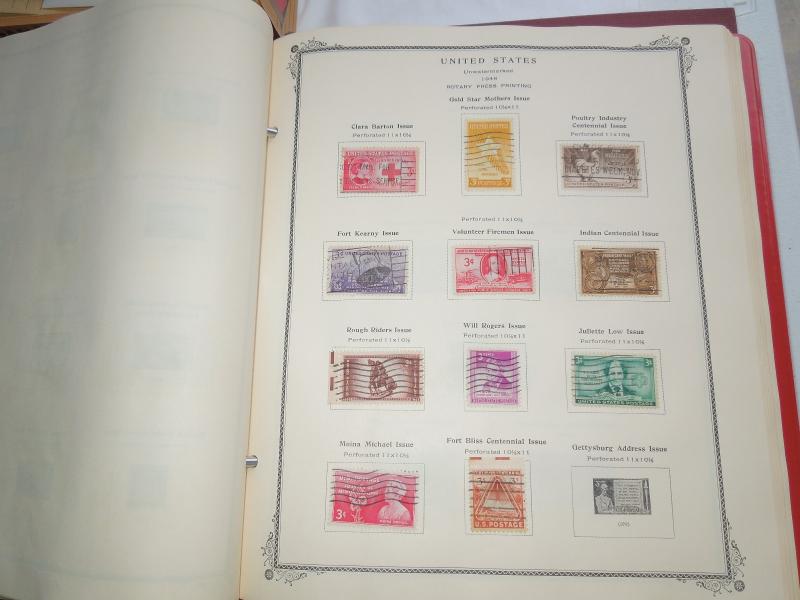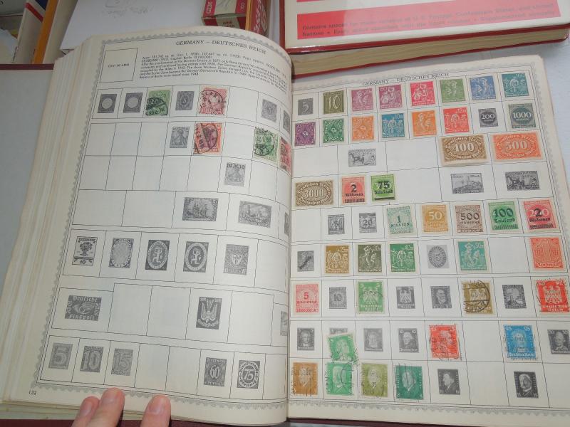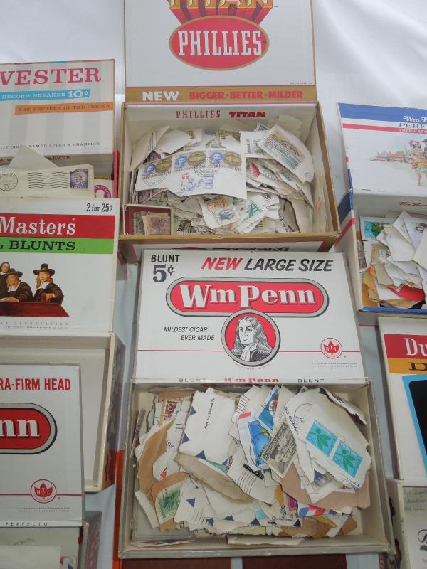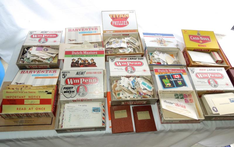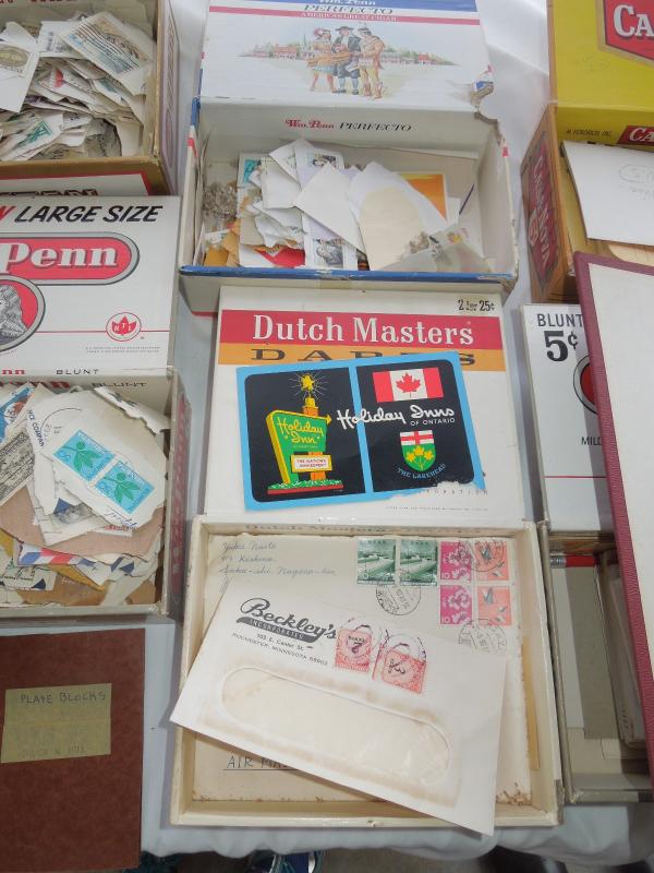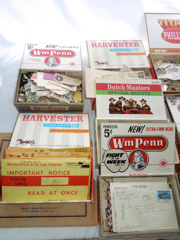 Includes 11 cigar boxes full of cancelled USA and international stamps . First day covers. Two partially filled volumes of postage stamp albums from early 1960's: THE NEW WORLD WIDE POSTGE STAMP ALBUM and SCOTT'S AMERICAN ALBUM FOR UNITED STATES. Condition varies. A lifetime of collecting.