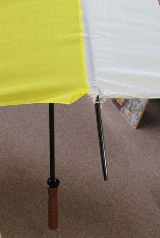 This is a very large umbrella, over 36" wide. There is one end cap missing as seen in photo, but this is still a colorful usable item.