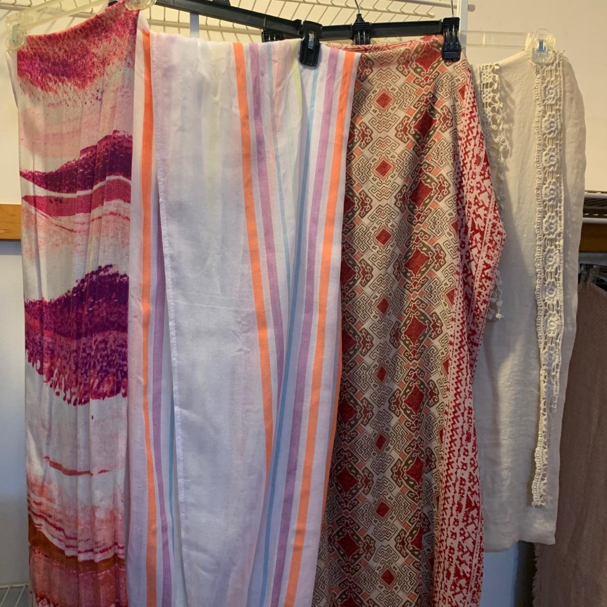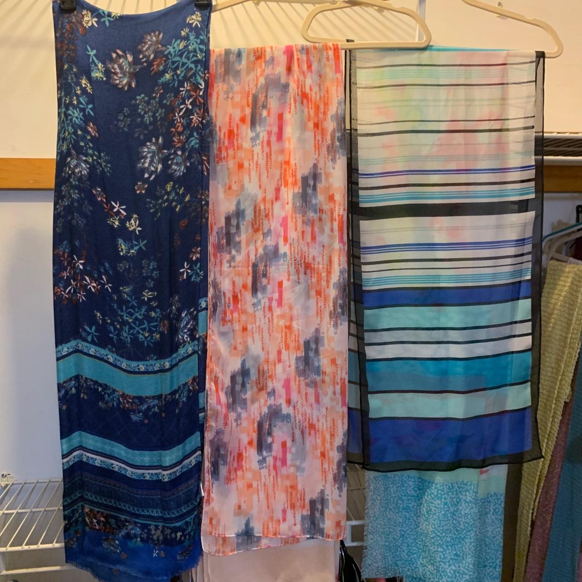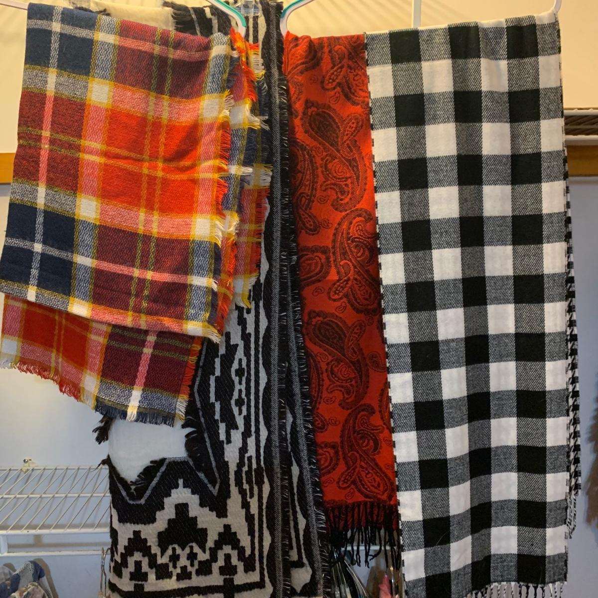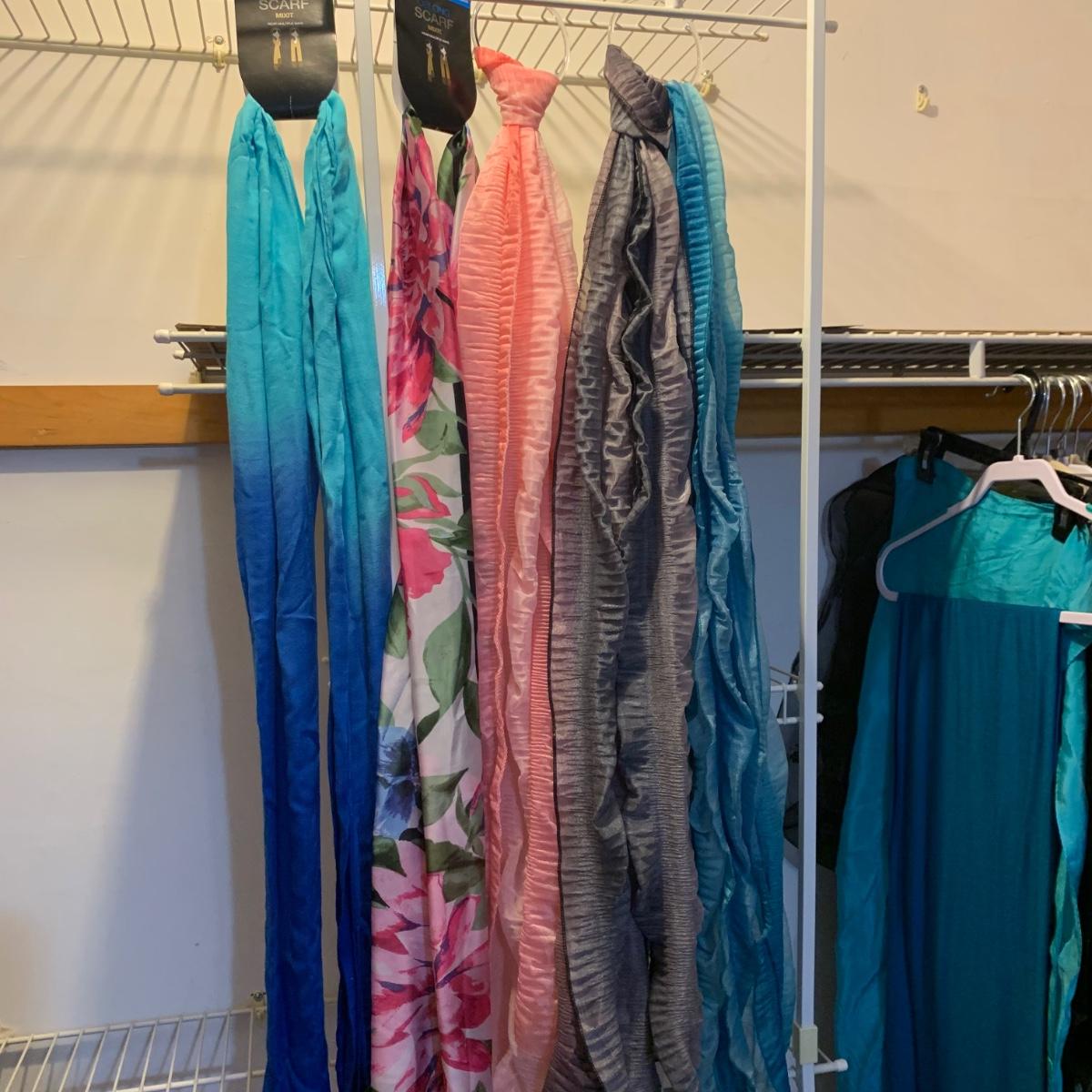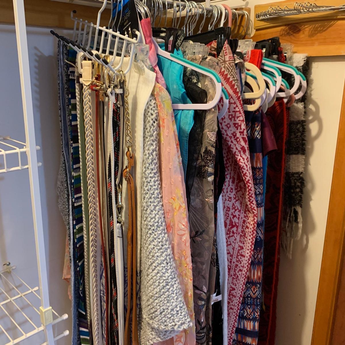 50+ scarves and 15+ belts. The scarves come in just about every color and design you could imagine! There are quite a few large, soft, and warm plaid scarves, as well as silk, rayon and more. Some are velvet, some have sequins. Many are brand new with their original tags still attached. Of the belts, one is Fossil, three are St. John’s Bay, there are two gold belts, and a few fabric belts. Not all belts have sizes listed, but the ones that do are marked M or L. Some of the belts show some wear.