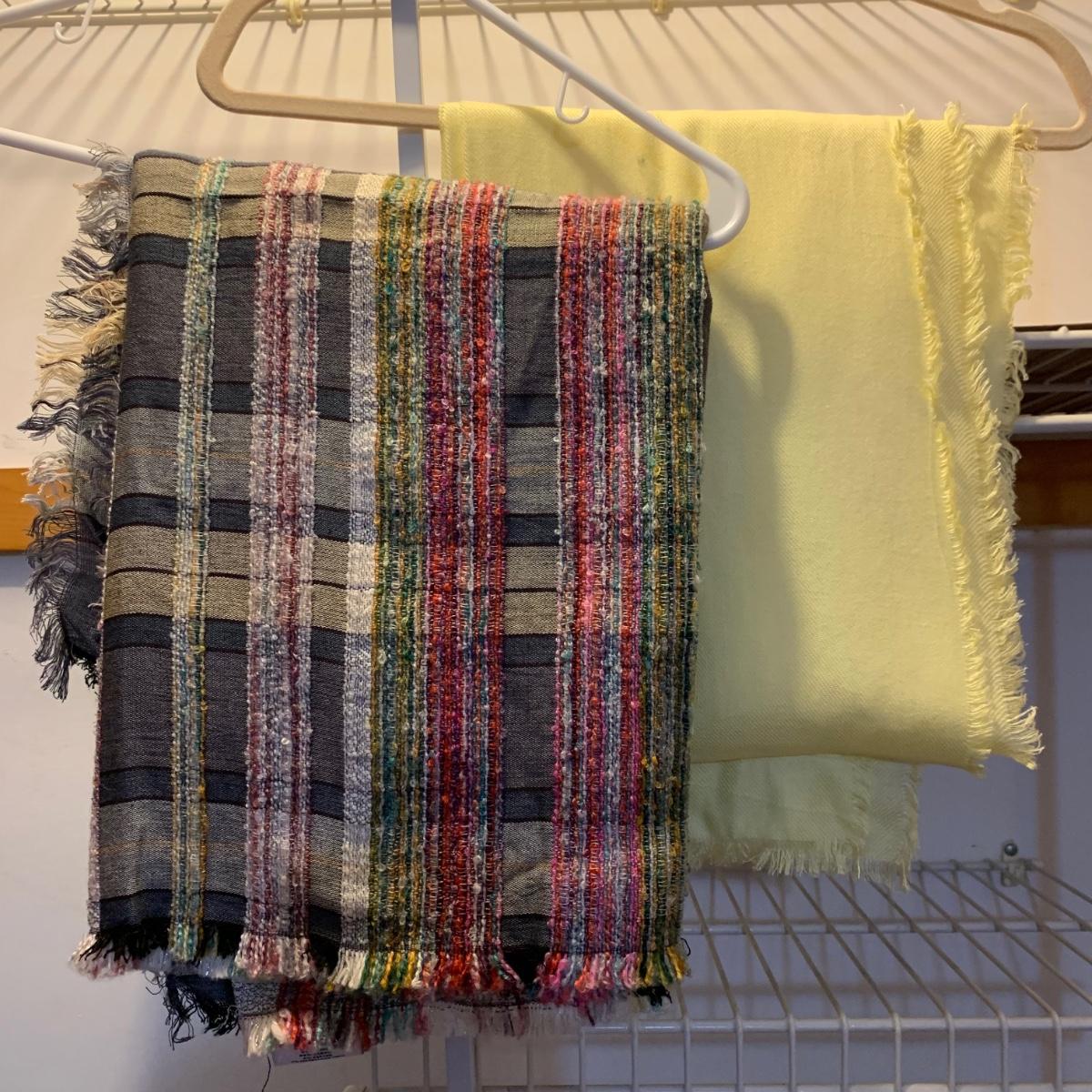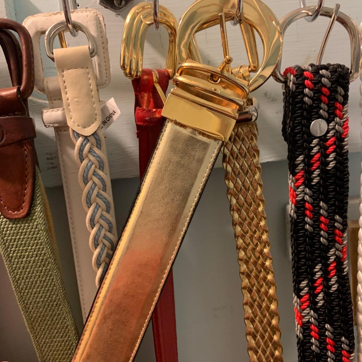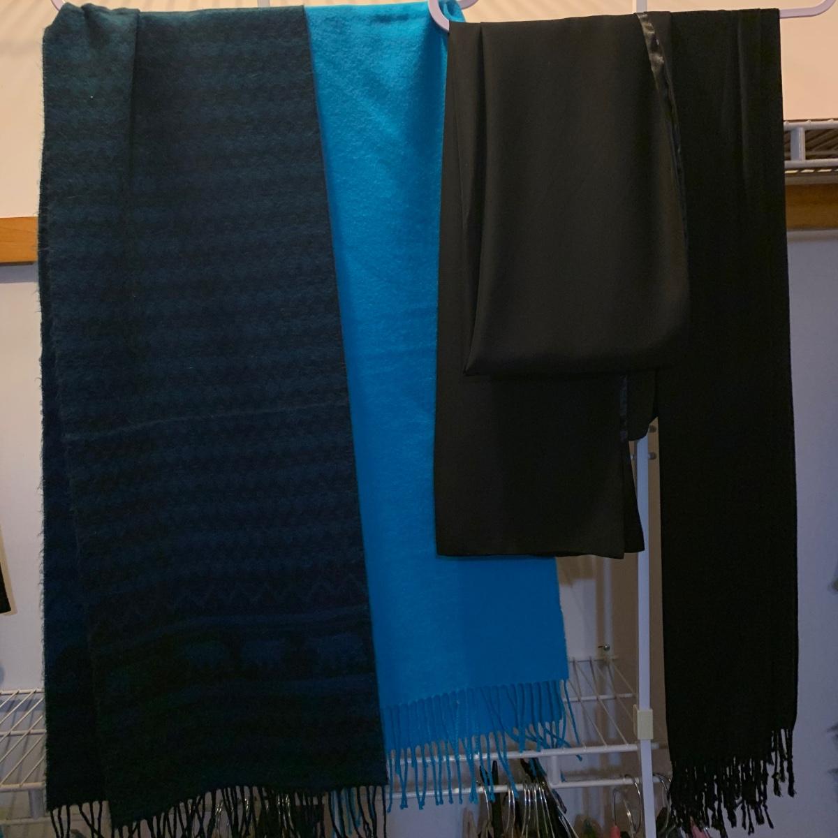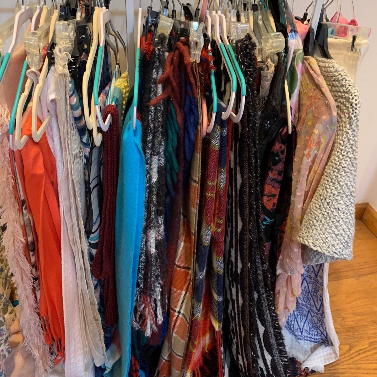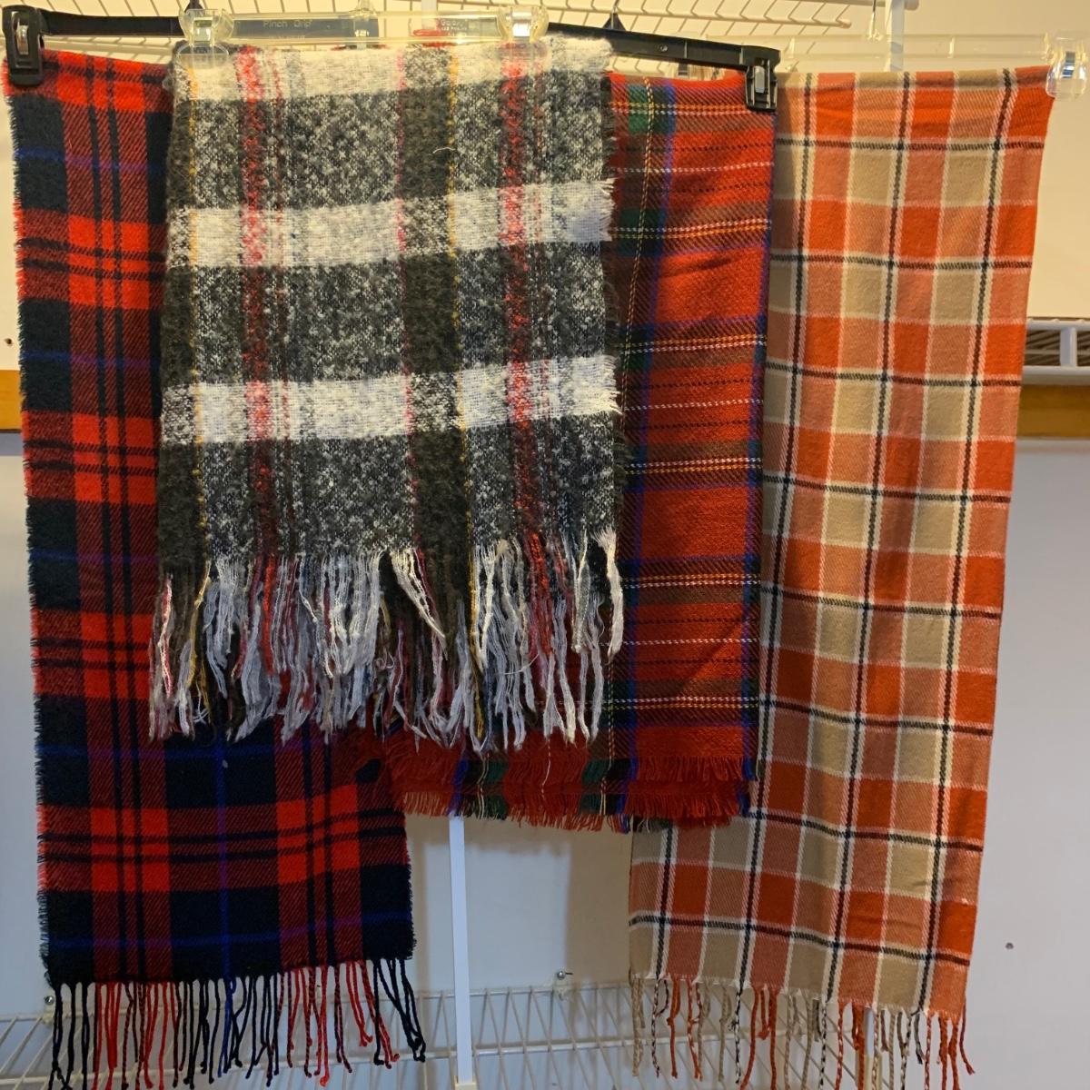 50+ scarves and 15+ belts. The scarves come in just about every color and design you could imagine! There are quite a few large, soft, and warm plaid scarves, as well as silk, rayon and more. Some are velvet, some have sequins. Many are brand new with their original tags still attached. Of the belts, one is Fossil, three are St. John’s Bay, there are two gold belts, and a few fabric belts. Not all belts have sizes listed, but the ones that do are marked M or L. Some of the belts show some wear.